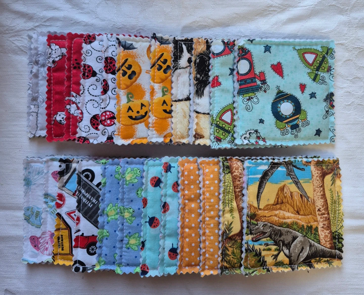 I'm selling a collection of handmade fabric squares with various fun patterns, including Batman, Mario, Spiderman, and more! They come with a cute drawstring bag featuring animal designs. Perfect for young children to help train and develop concentration.