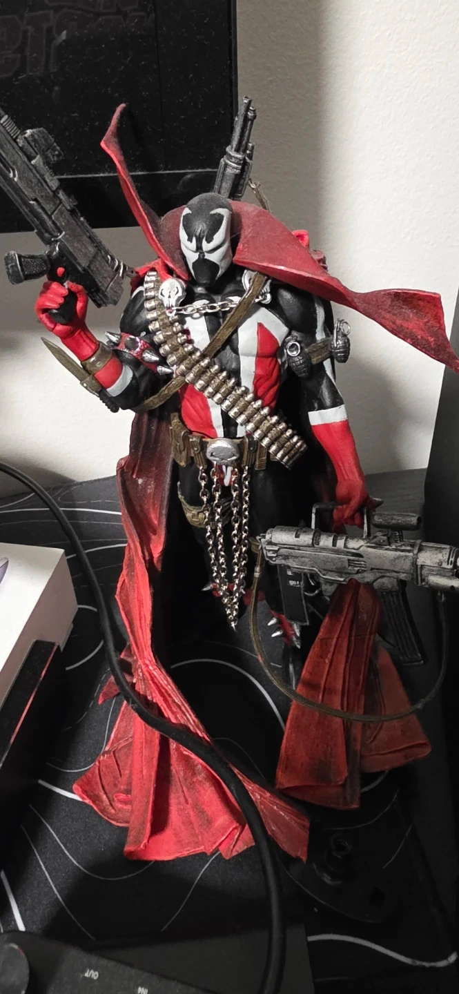 This is a Spawn action figure from McFarlane Toys. It comes with multiple weapons, including guns and grenades. The figure has a red cape and detailed costume.
