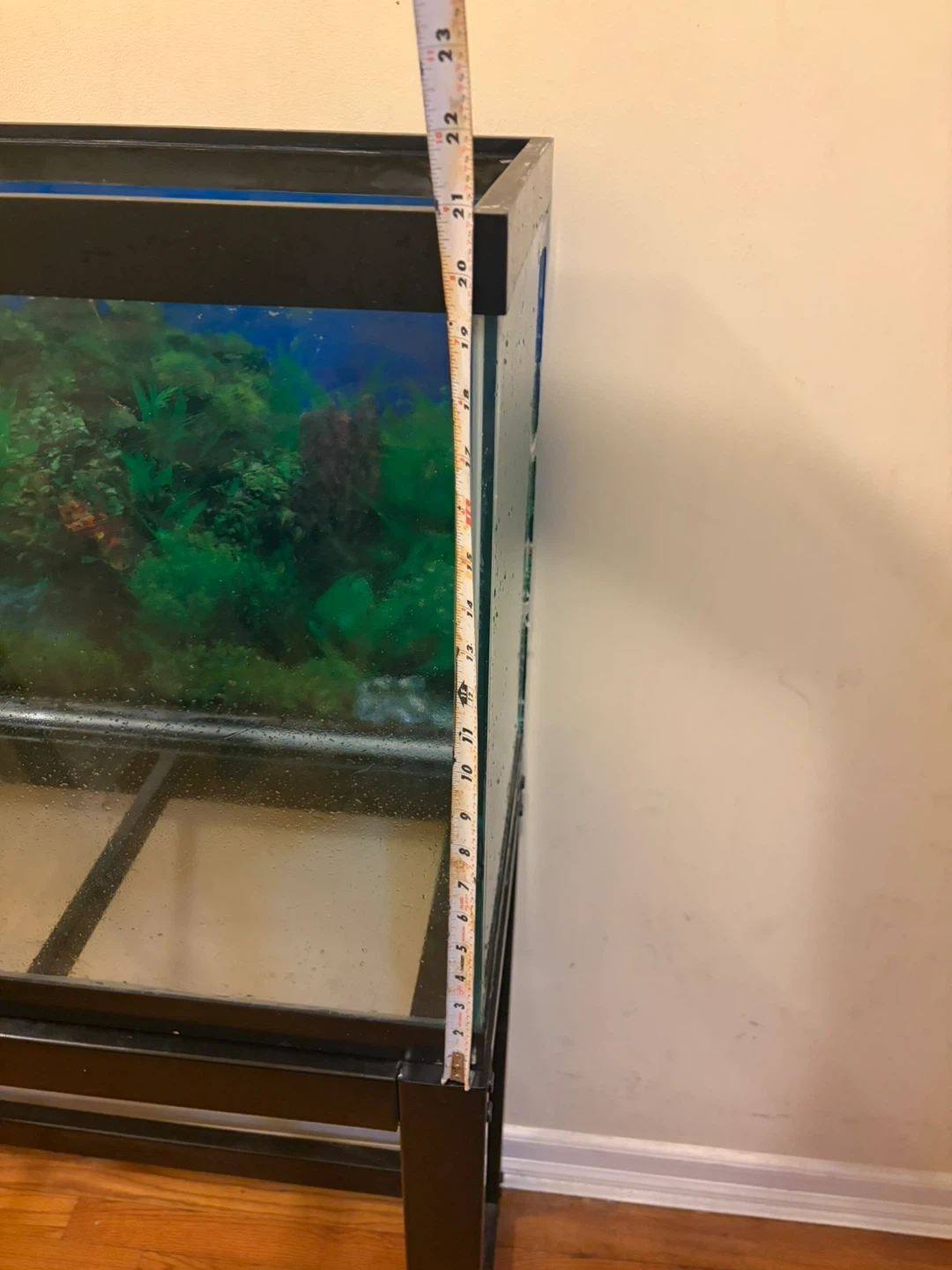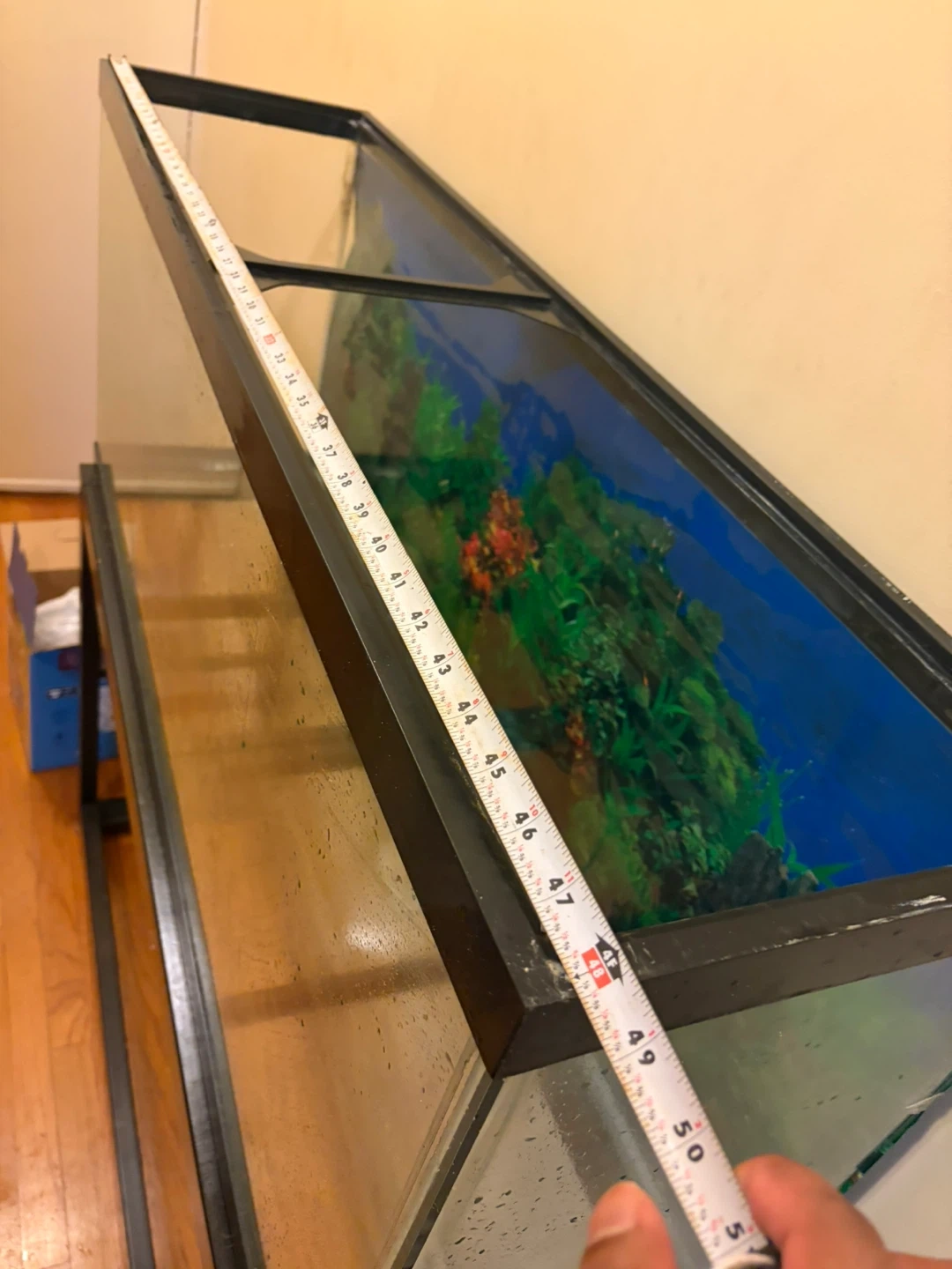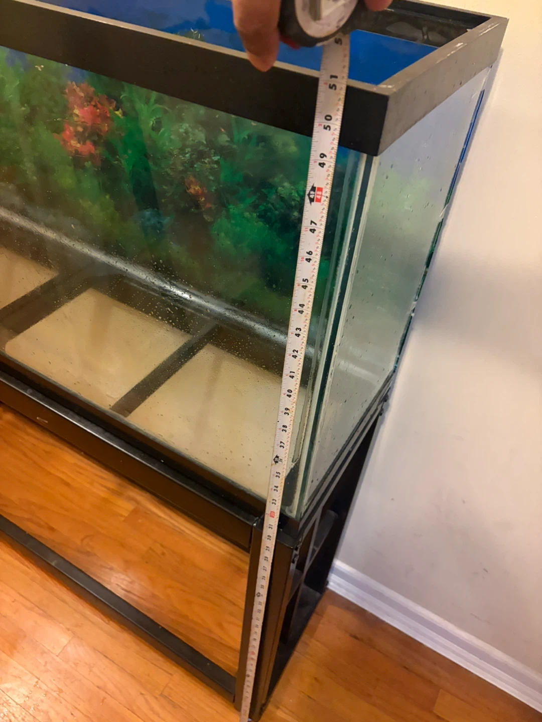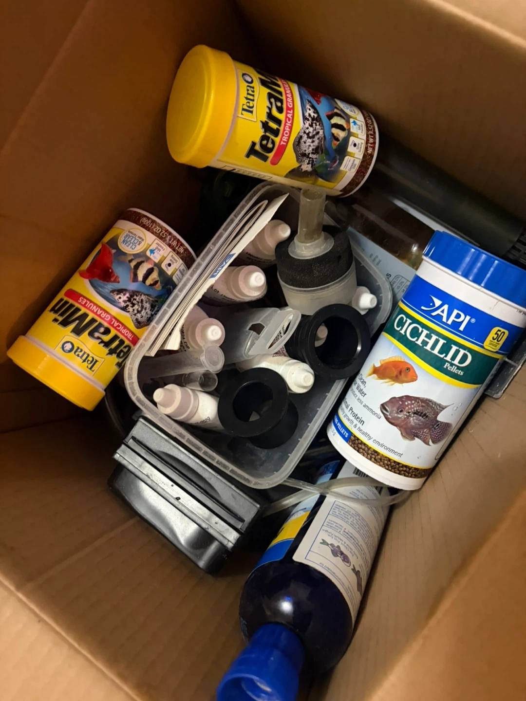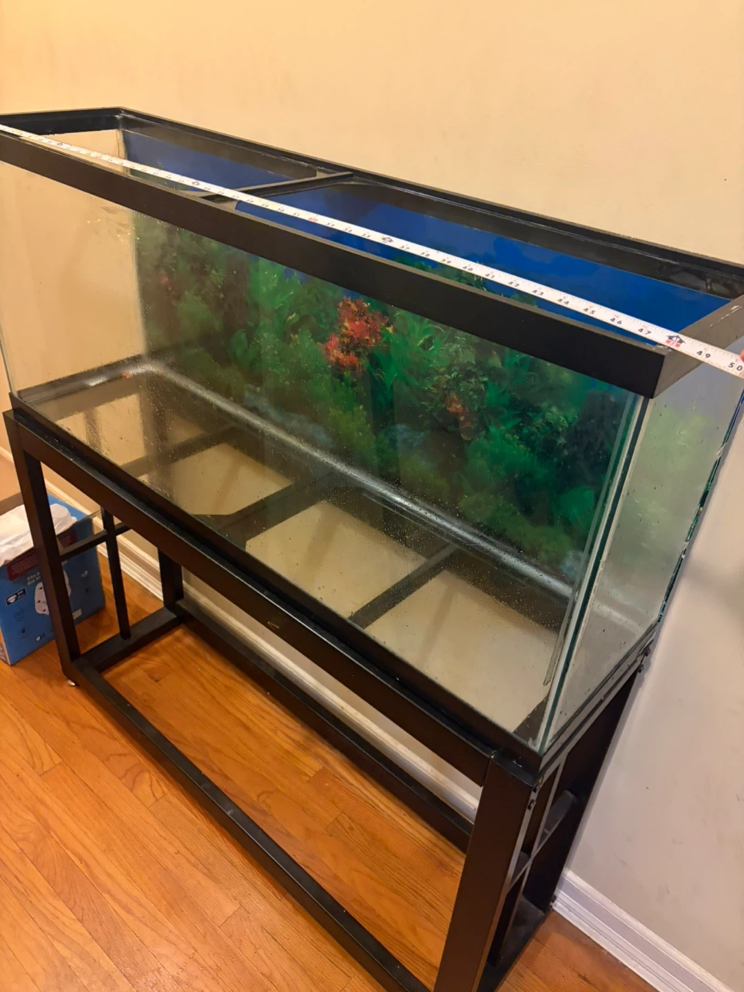 This is a large aquarium tank with a sturdy stand, perfect for housing your aquatic pets! It measures approximately 50 inches in height. Included are various fish food brands like TetraMin Tropical Flakes and API Cichlid Pellets, plus a box of Demily 24pcs ceramic bio filter media for aquarium water purification. This setup is ready for your fish!