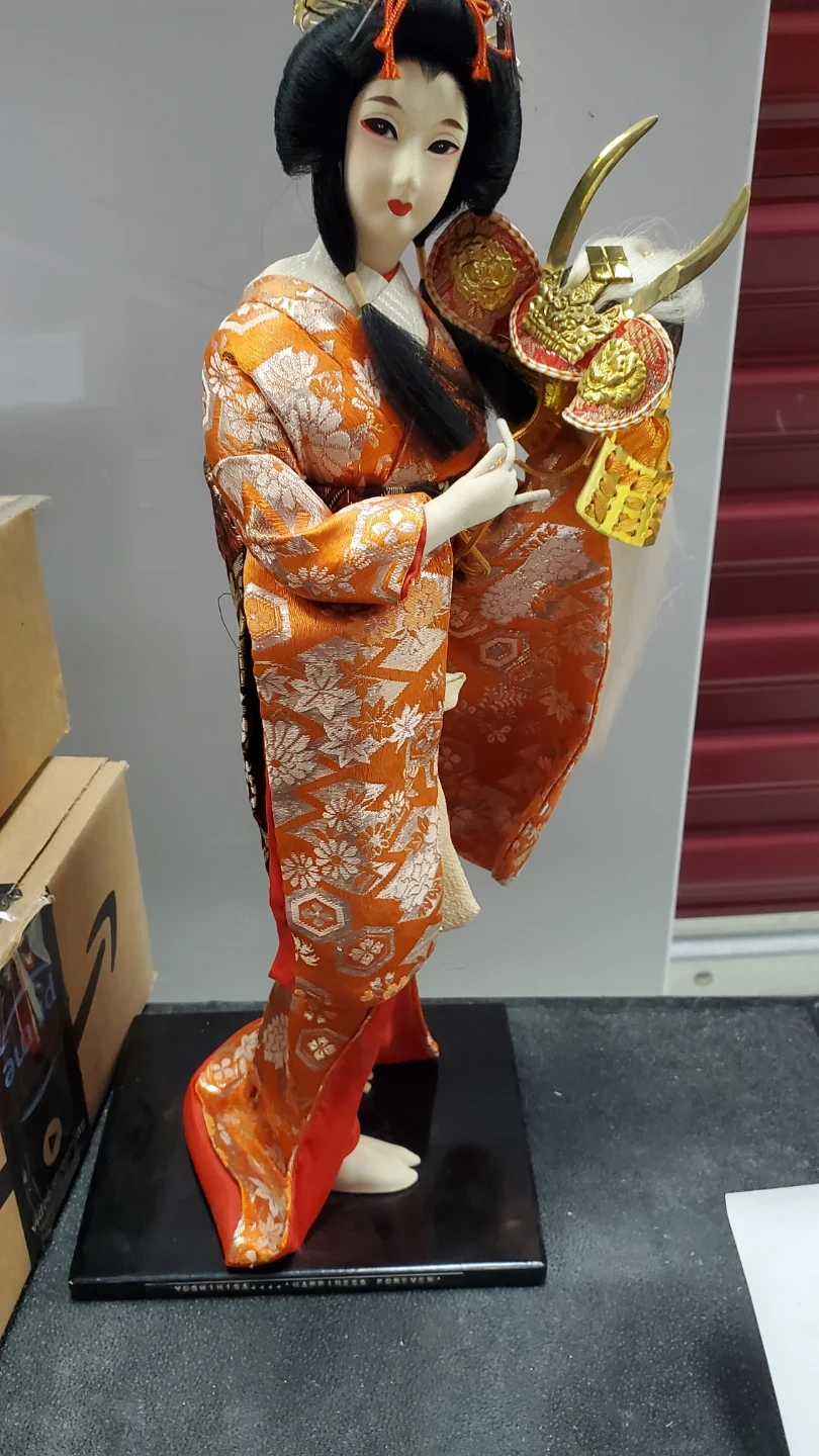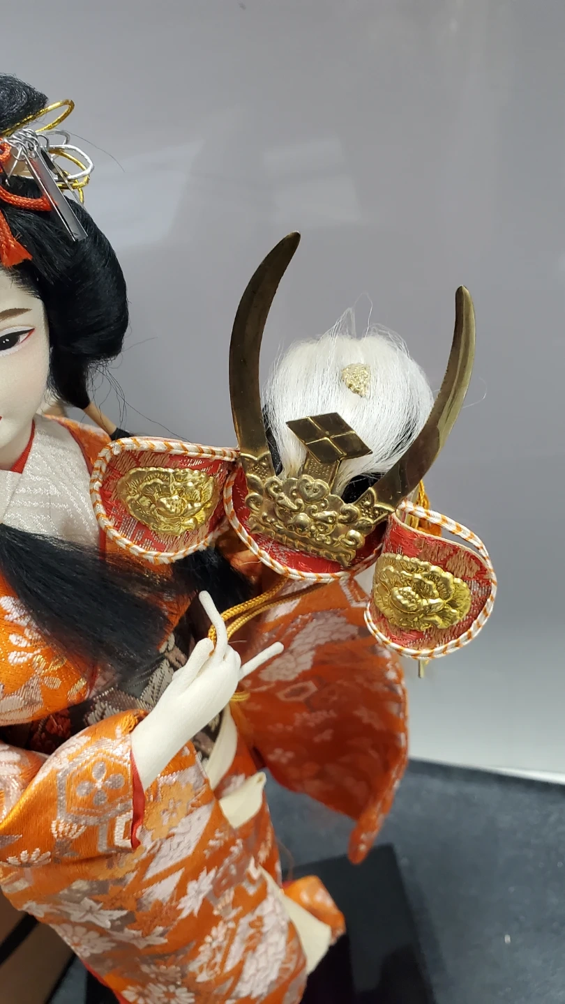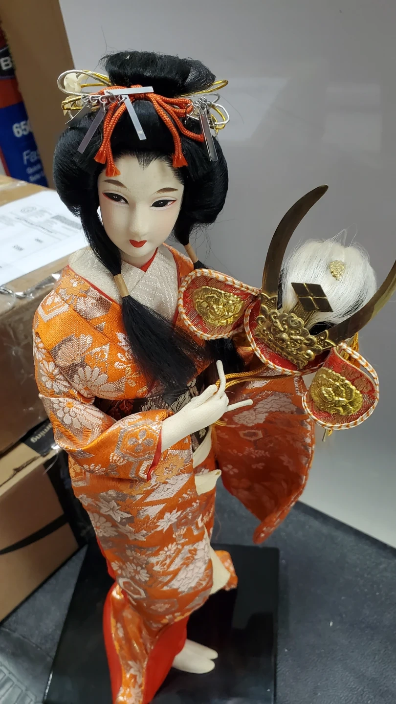 It's dressed in a vibrant orange kimono with intricate floral patterns. The doll includes a decorative helmet accessory.