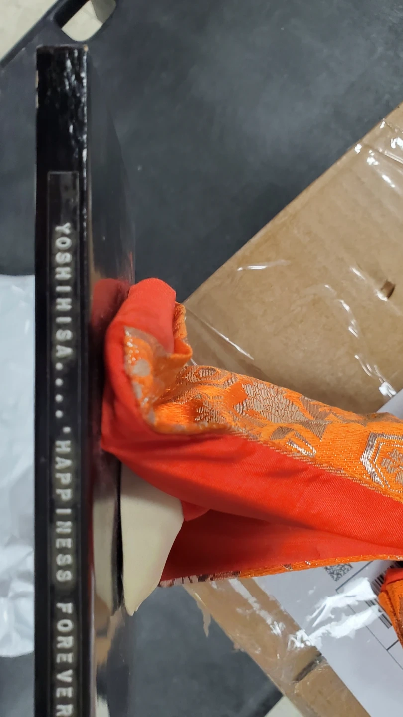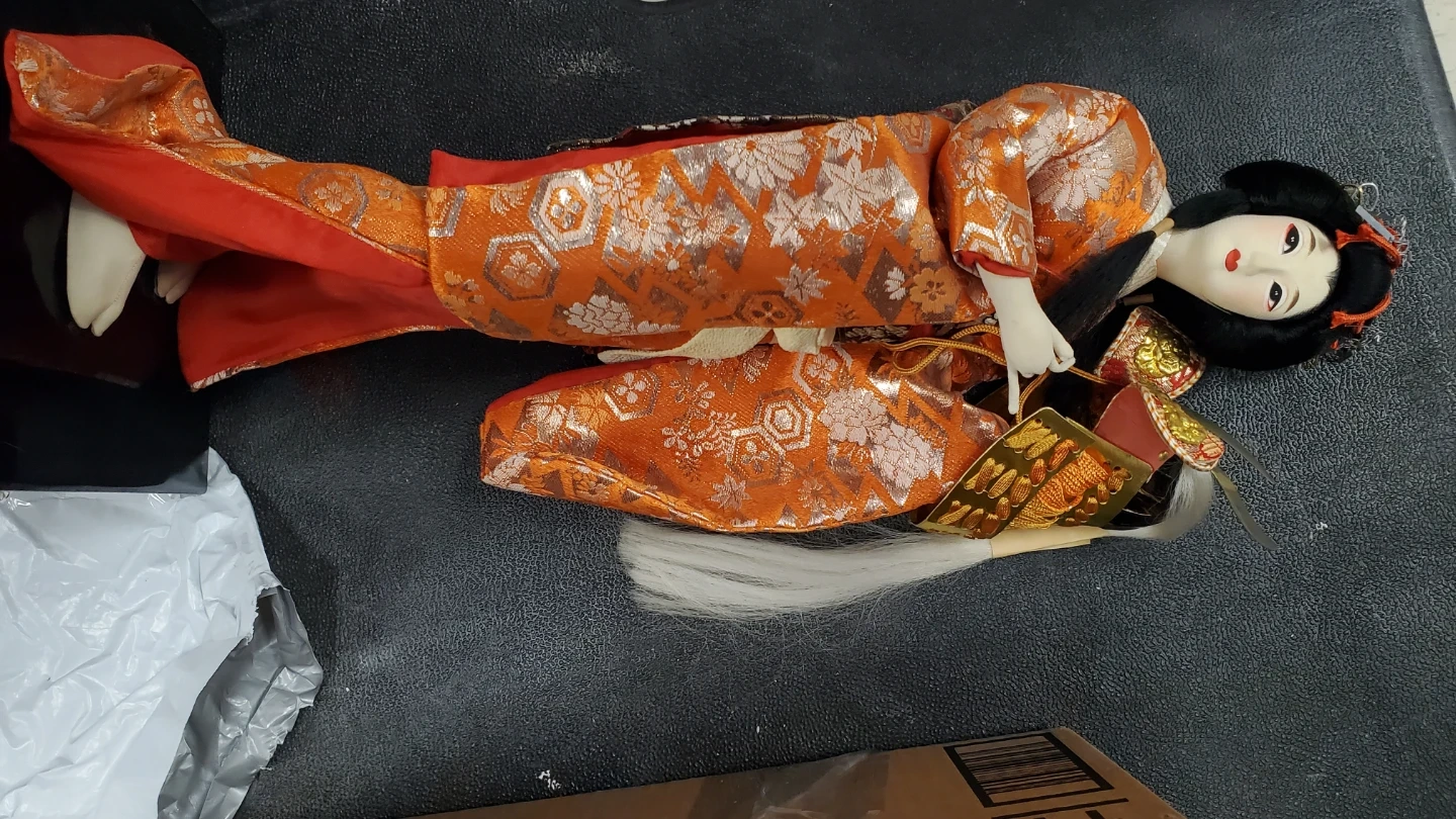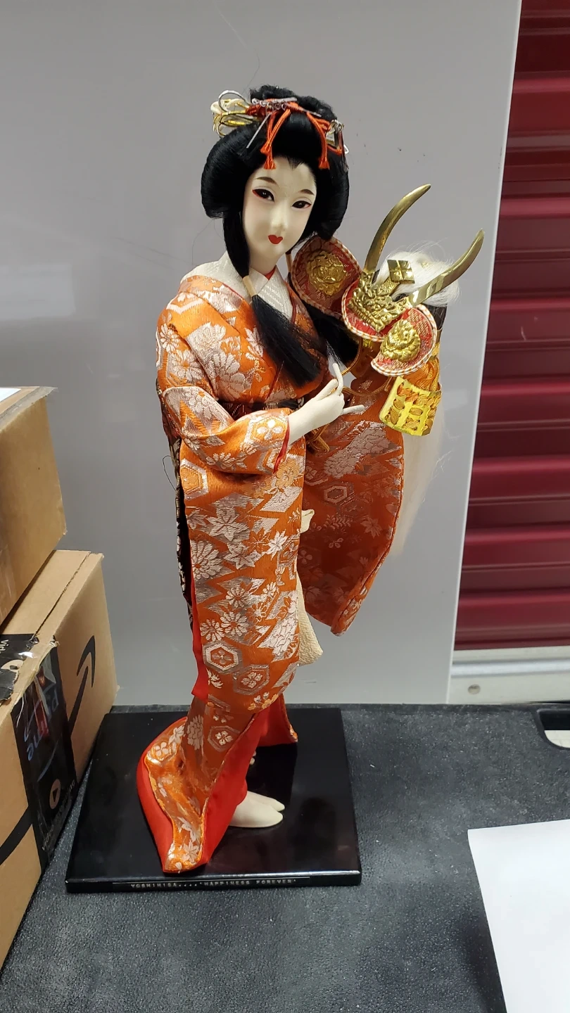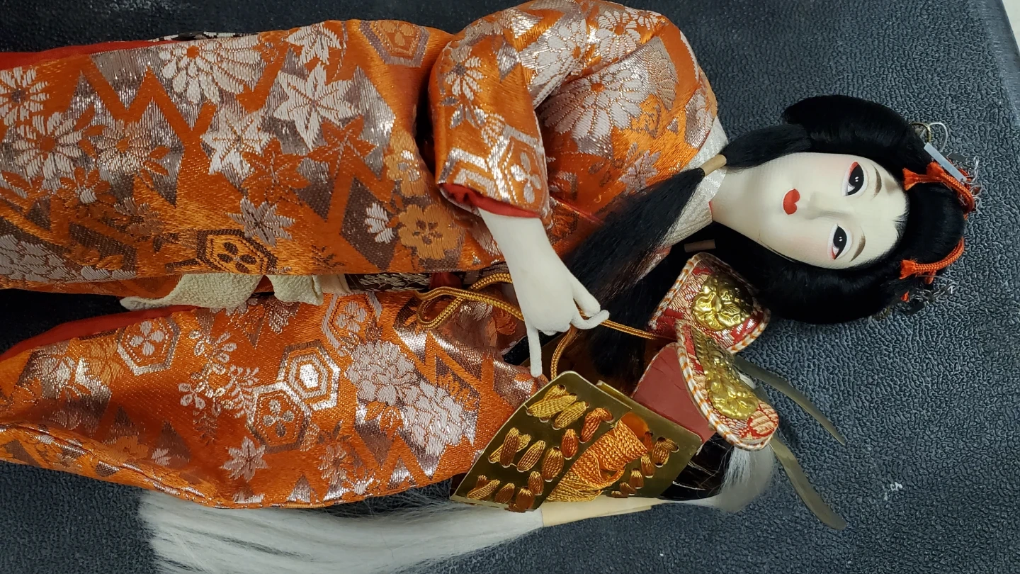It's dressed in a vibrant orange kimono with intricate floral patterns. The doll includes a decorative helmet accessory.