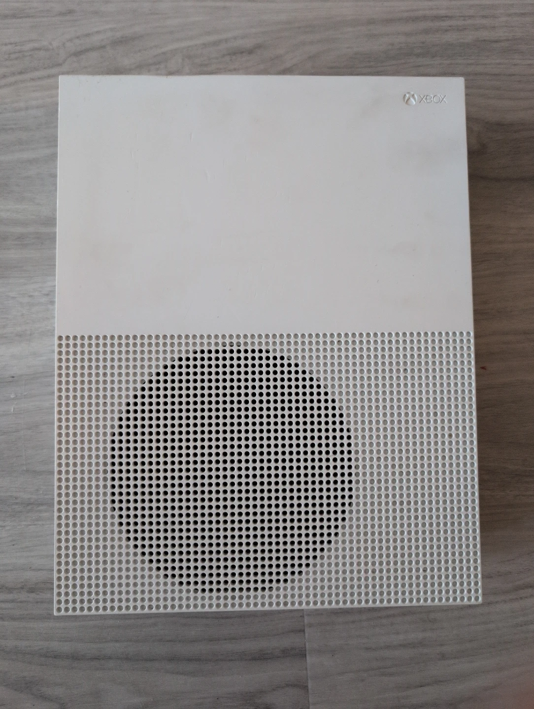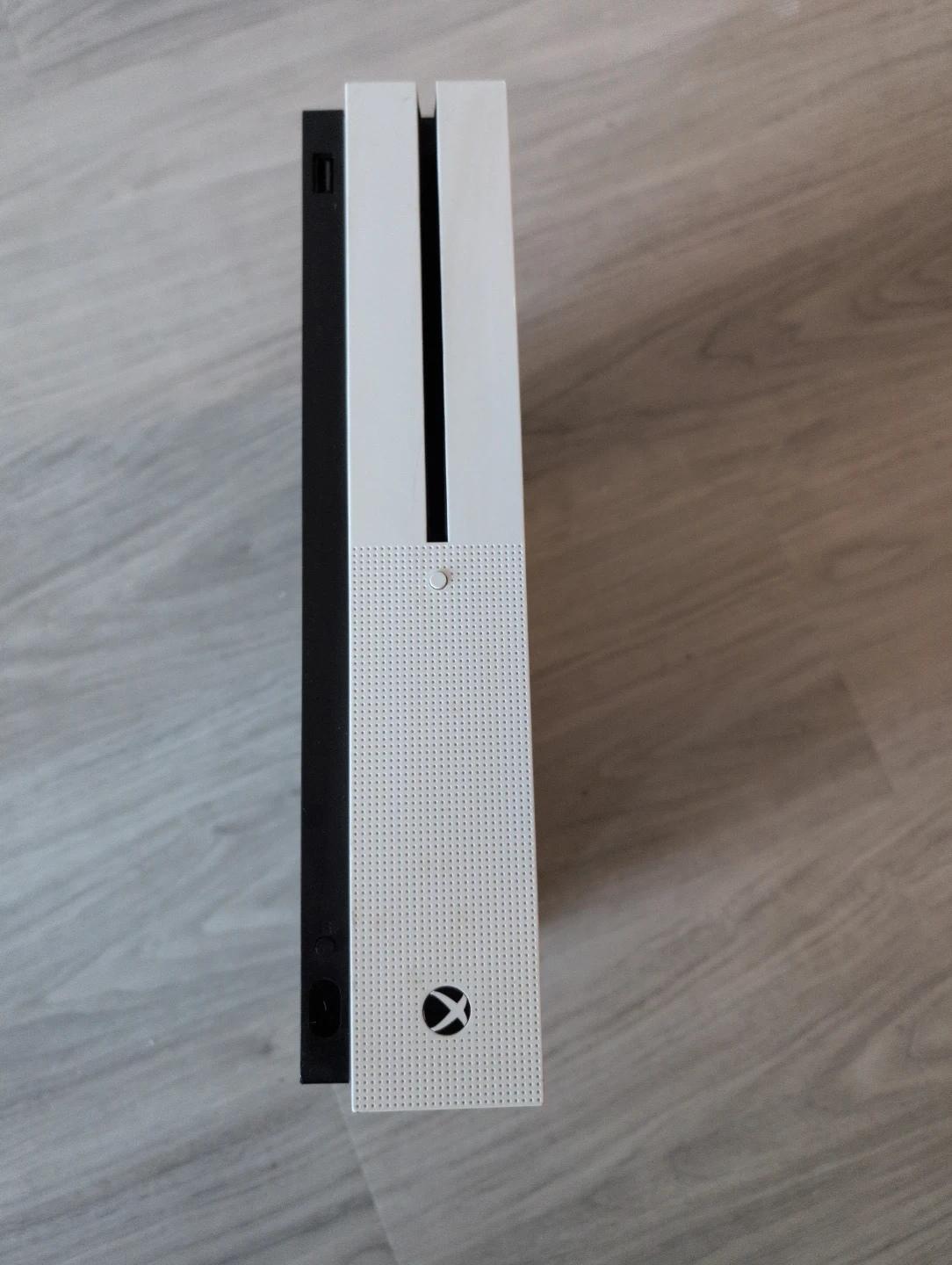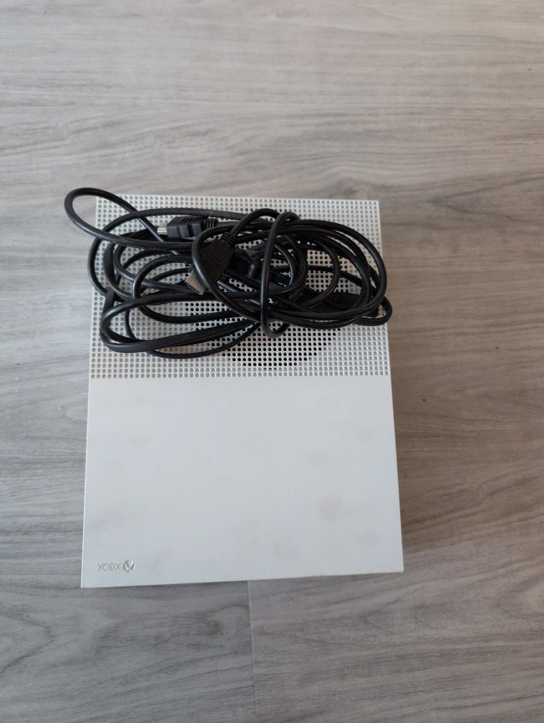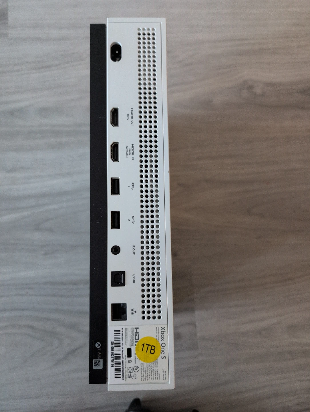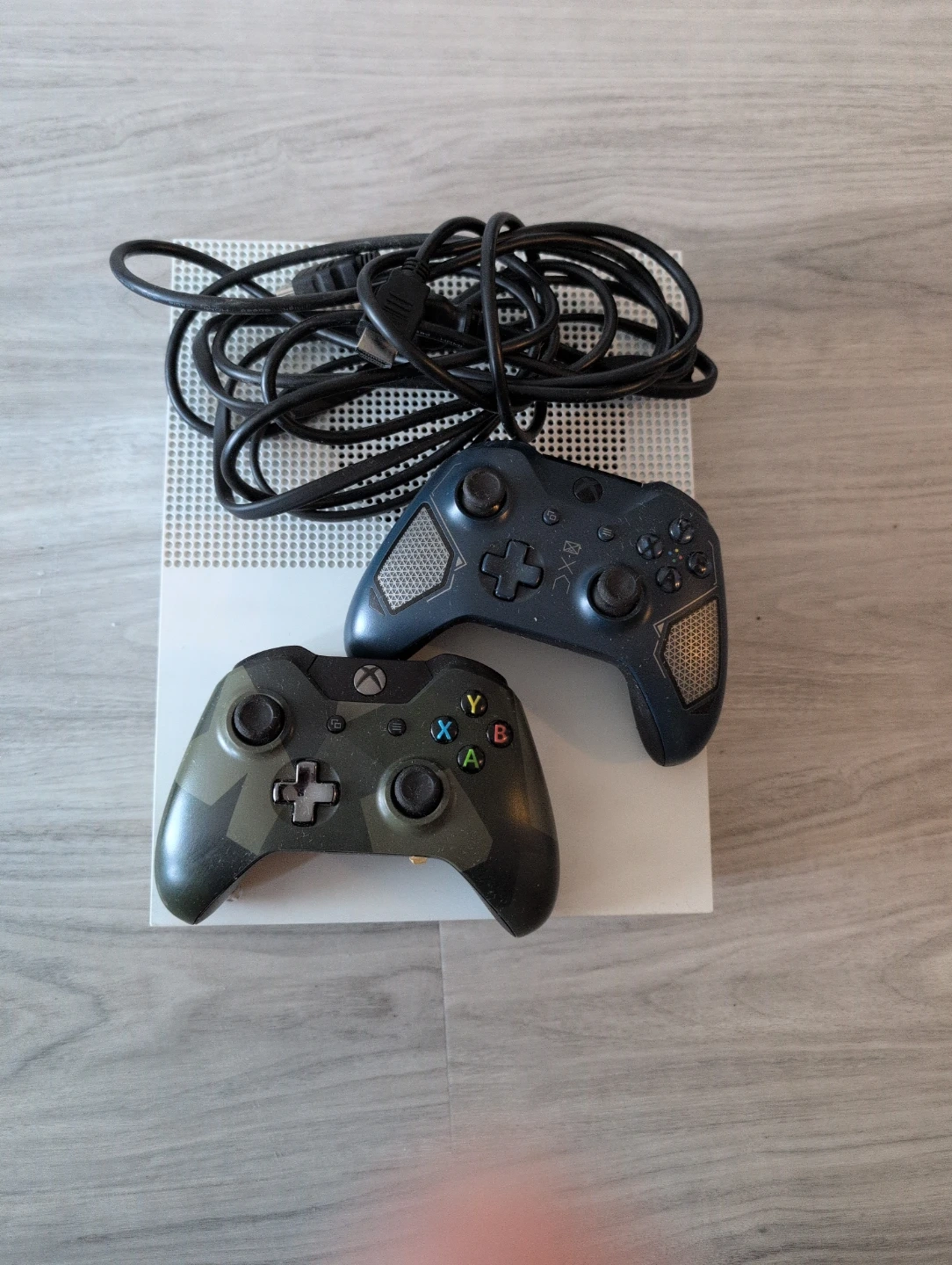 This is an Xbox One S console with a 1TB hard drive. It includes two controllers and a power cable. Two controllers are included, one in camouflage and one in navy