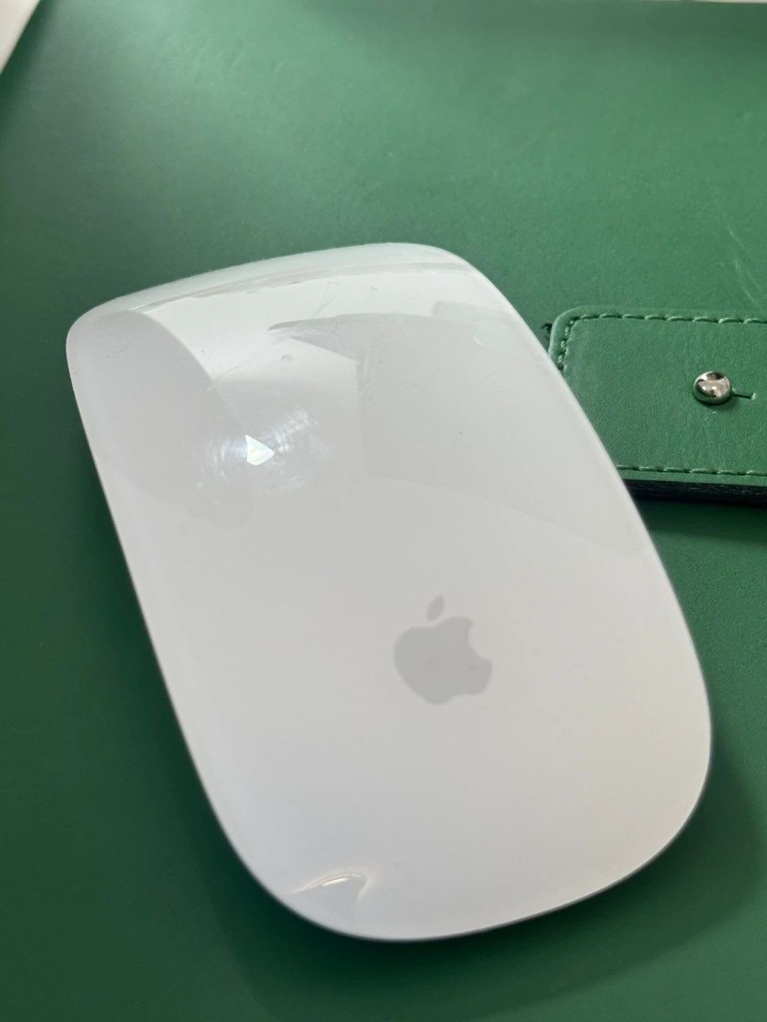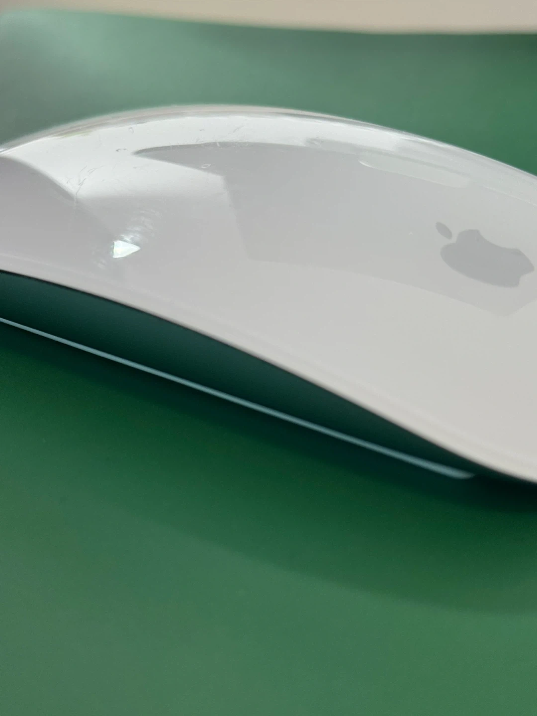 Wireless computer mouse with a smooth white finish. It's rechargeable and has multi-touch surface capabilities. This mouse is designed for comfortable everyday use.