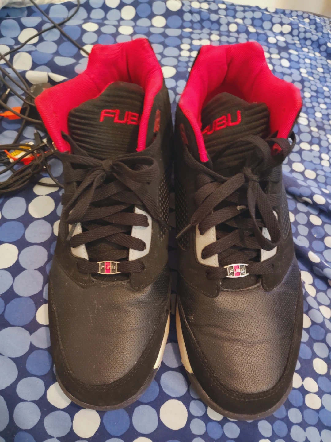 These FUBU high-top sneakers are black with red accents. They're made with a mix of leather and synthetic materials. Laces up for a secure fit. These are great for casual wear or athletic activities!