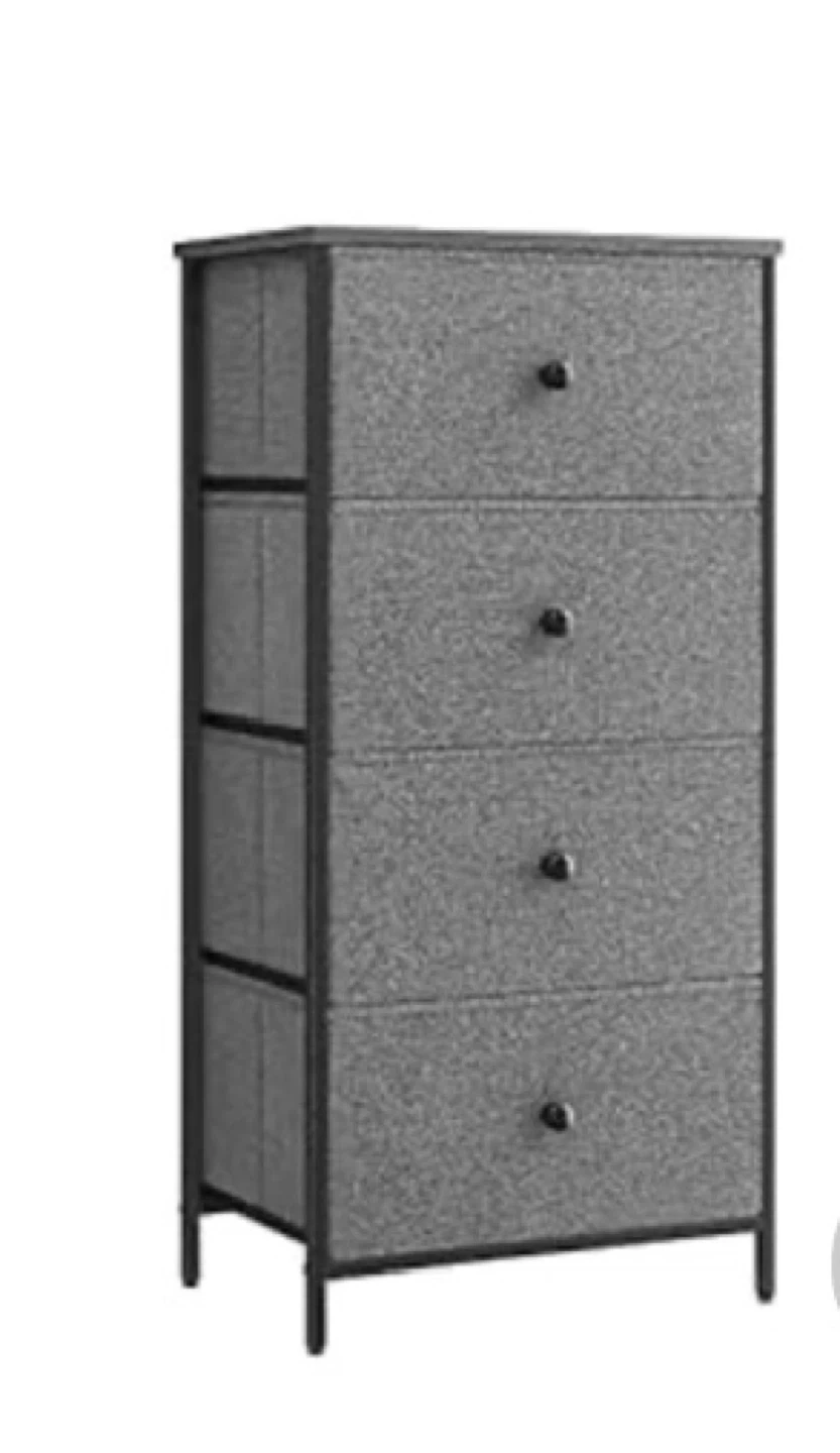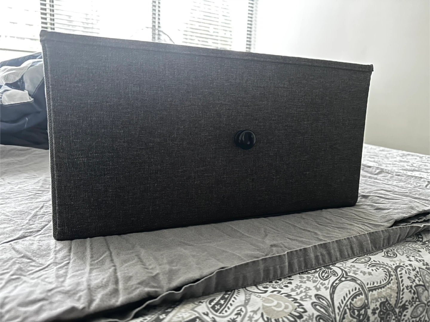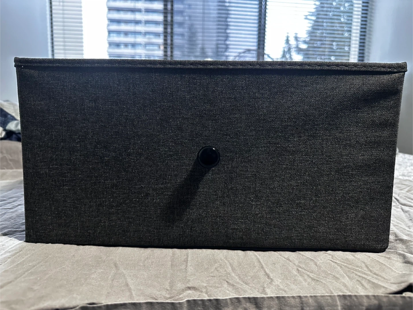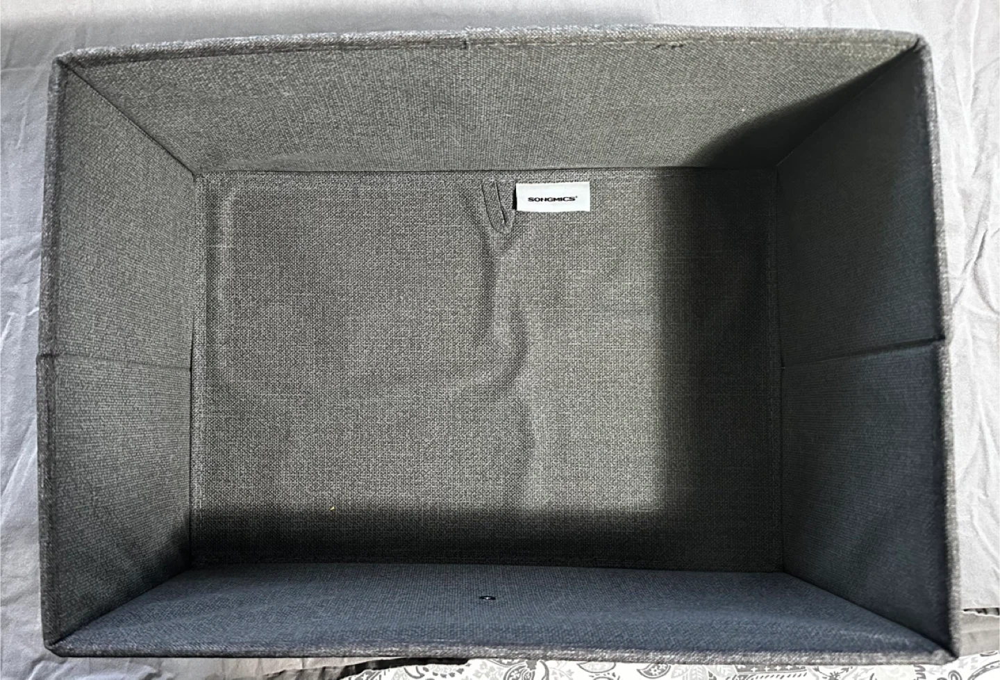 This is a SONGMICS fabric storage bin. It's grey and made of linen-look fabric. The bin has a removable base for easy storage.
