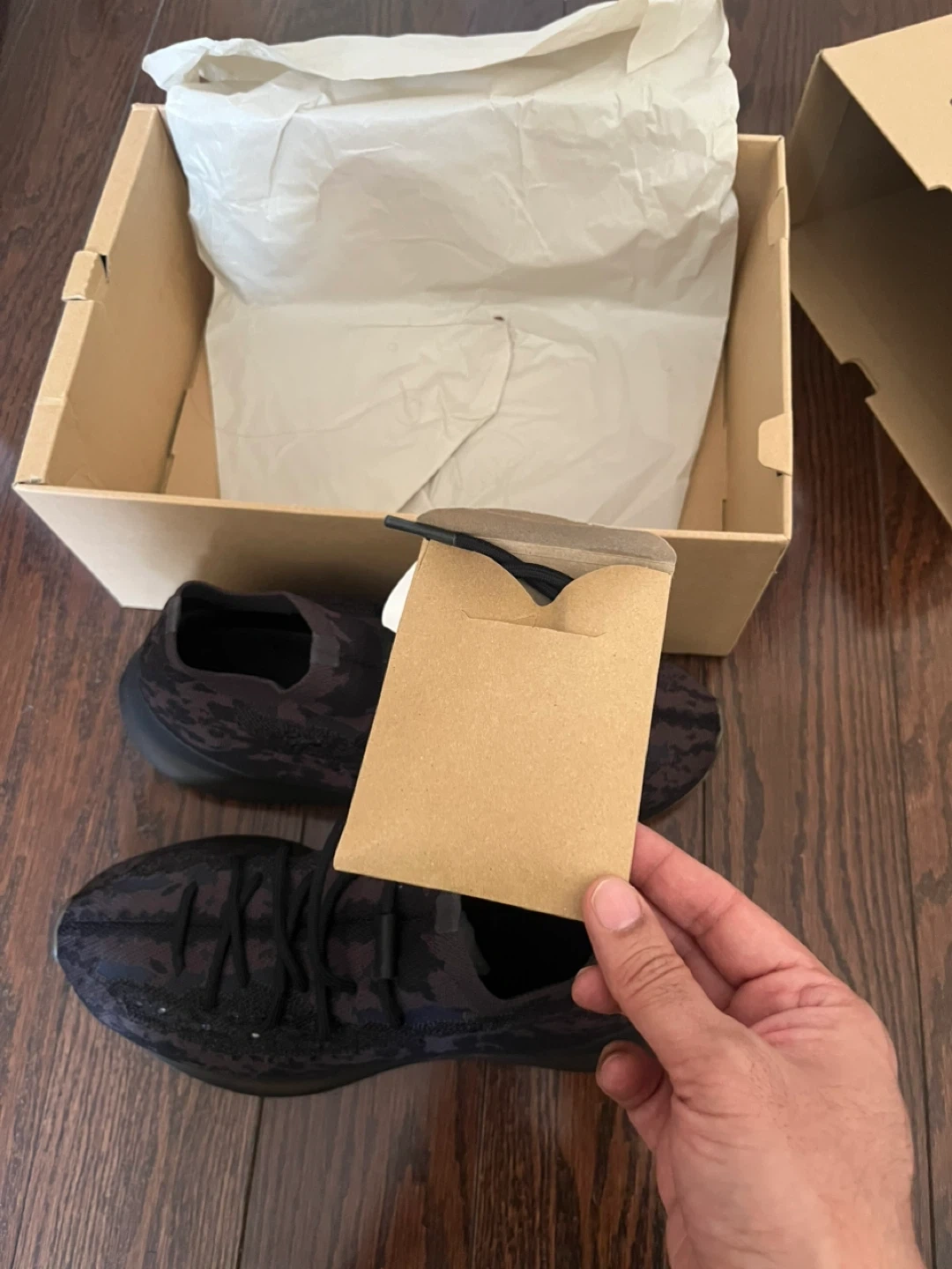 Adidas Yeezy Boost 380 sneakers in the "ONYX" colourway. Includes original box and extra laces. These shoes offer a sock-like fit with Boost cushioning.