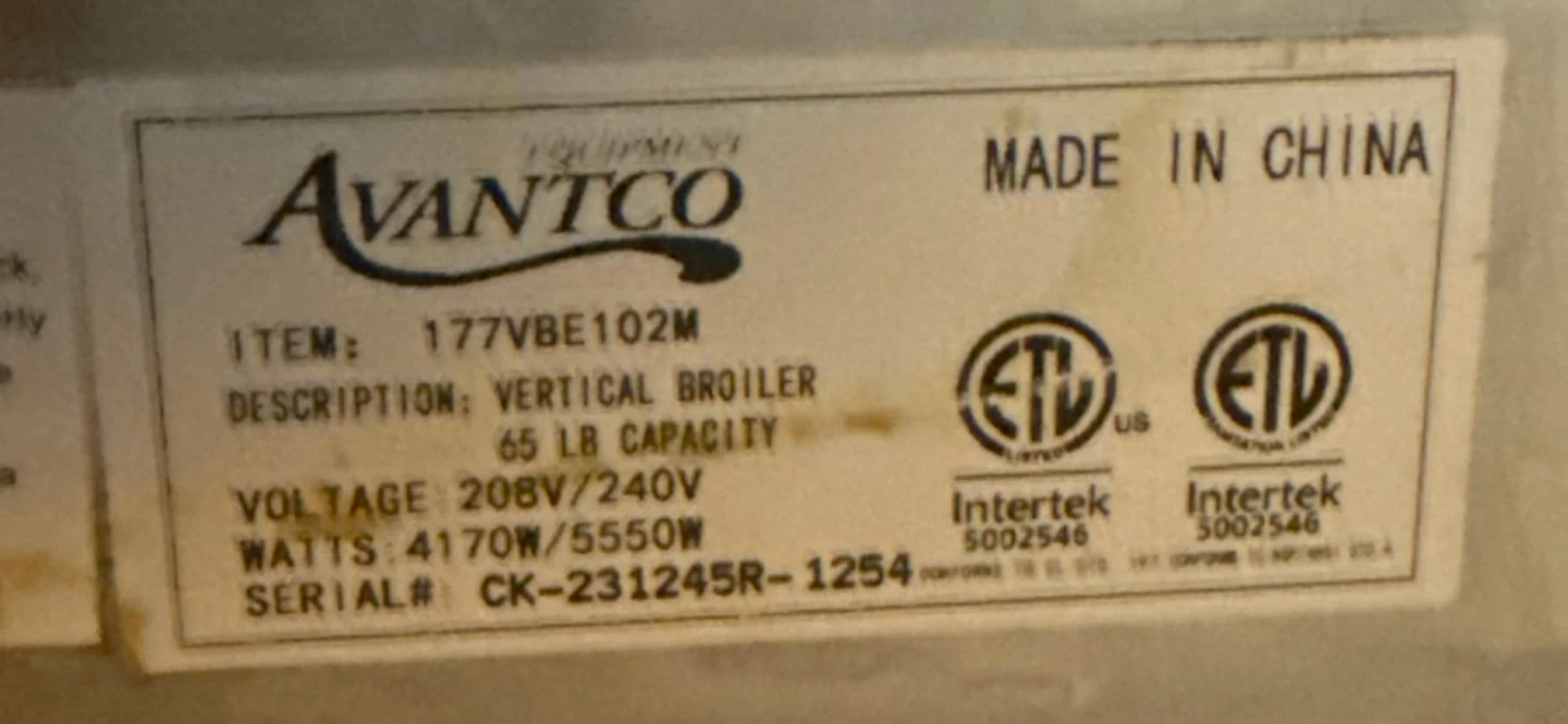 Selling an Avantco vertical broiler, model 177VBE102M. It's a 65 lb capacity broiler designed for vertical cooking. Operates at 208V/240V and 4170W/5550W.