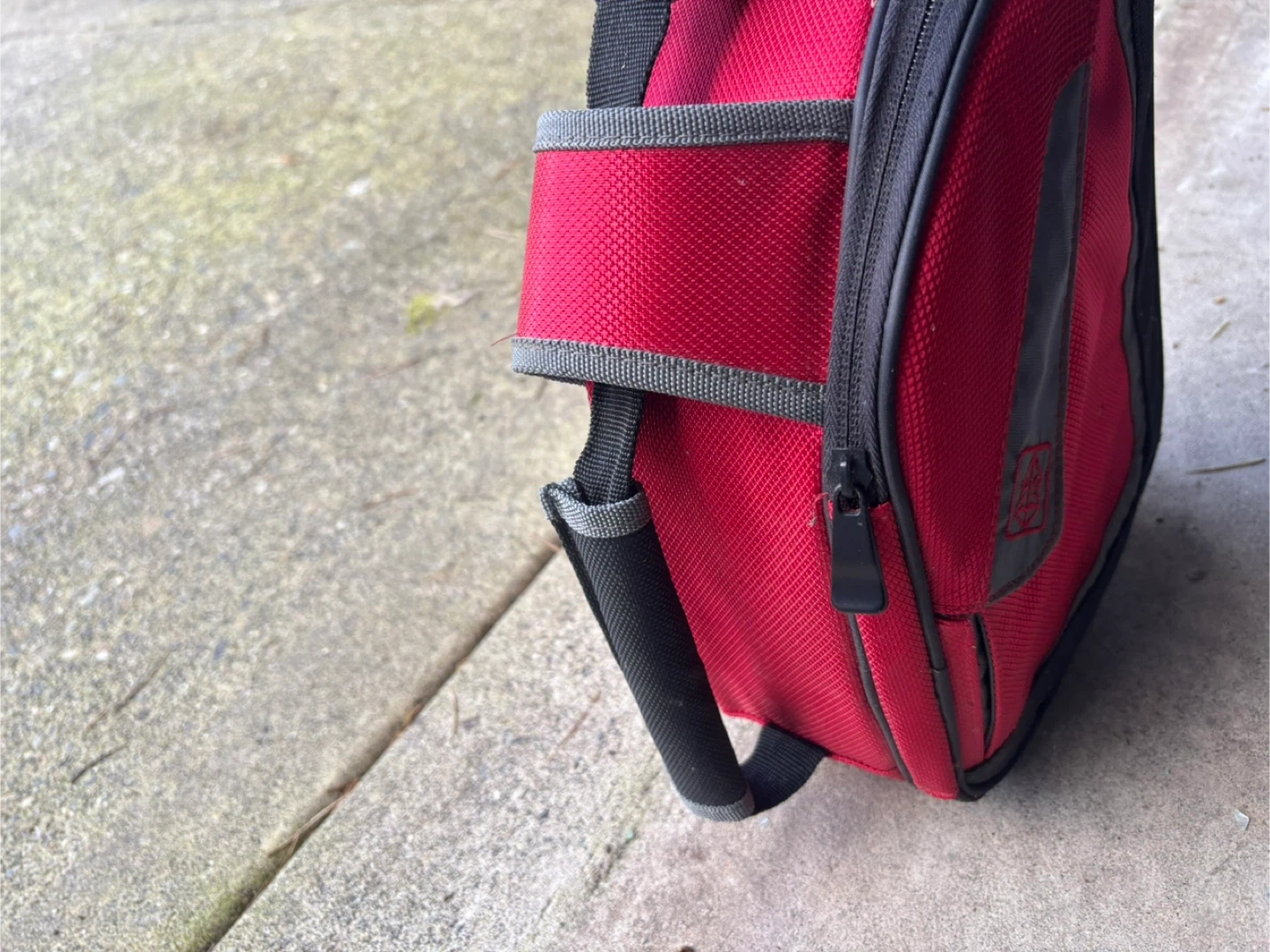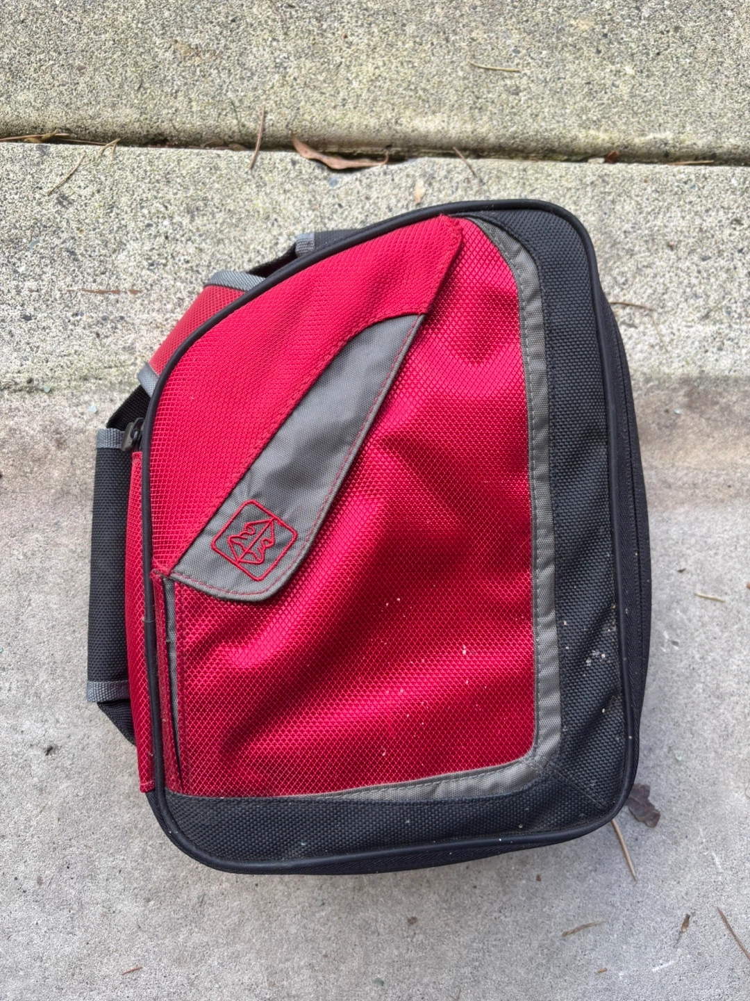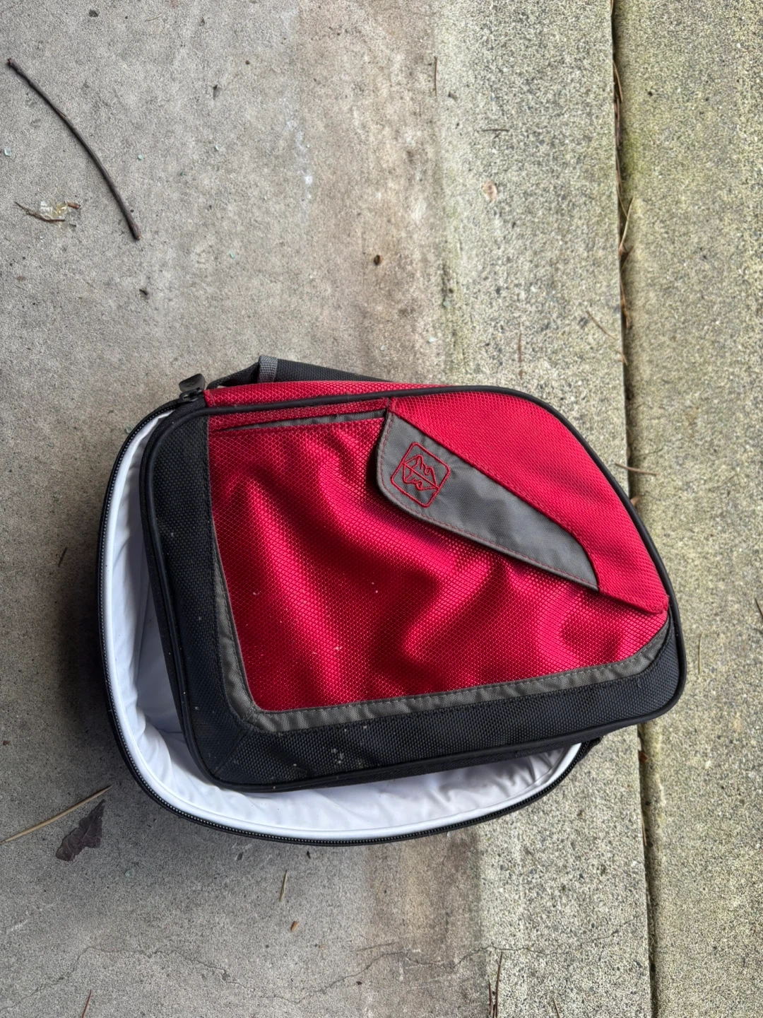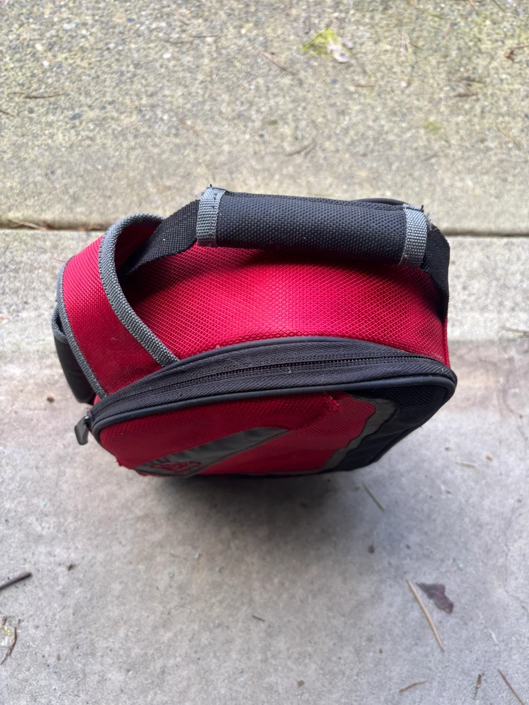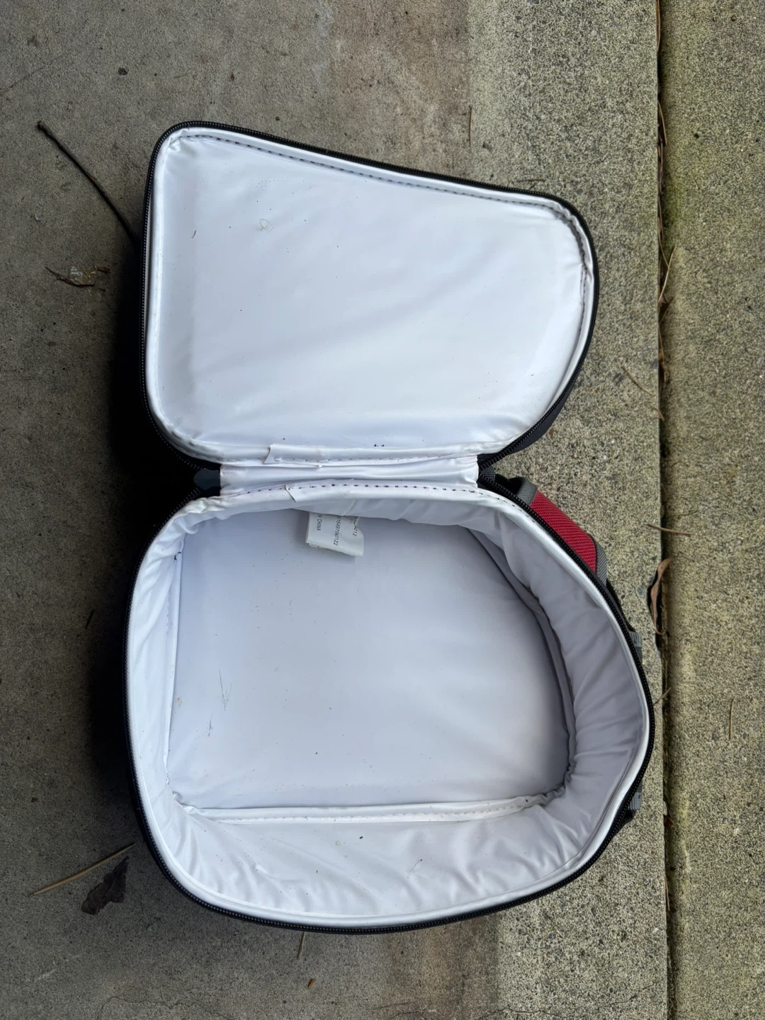 This is a red insulated lunch bag with a black trim. It's made of durable fabric and has a zippered closure. It's great for keeping food cool on the go!
