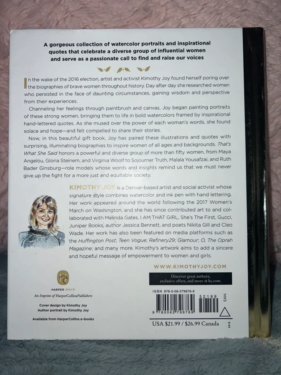 #gifting a copy of 'What She Said: Wise Words from Inspiring Women'. It's a gorgeous collection of watercolor portraits and inspirational quotes that celebrate a diverse group of influential women and serve as a passionate call to find and raise our voices. Perfect for anyone interested in biographies of brave women throughout history!