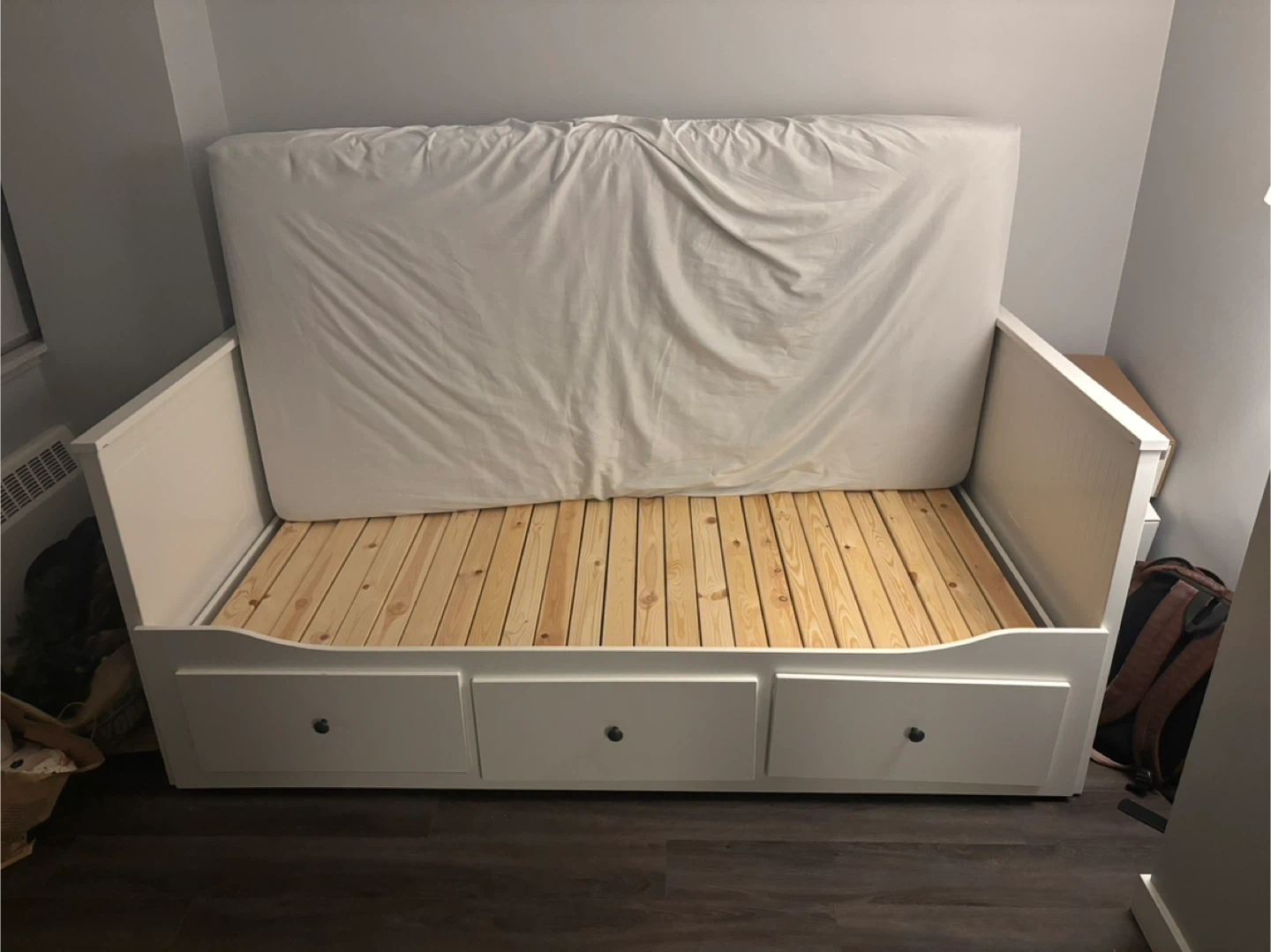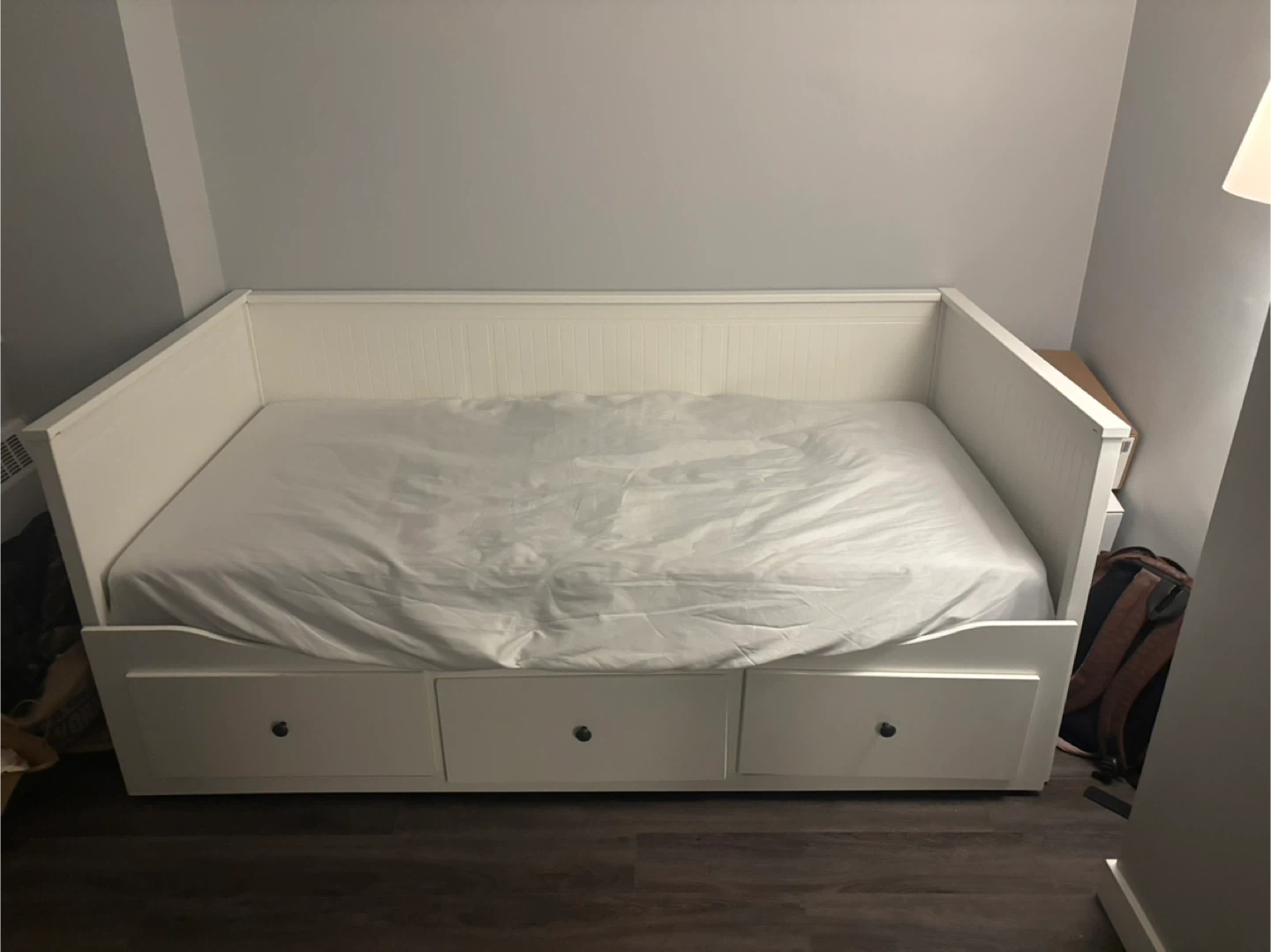 Selling an IKEA Hemnes daybed frame in white with three drawers. It's in good condition and perfect for a guest room or small space. This versatile piece can be used as a sofa, a single bed, or a double bed when the frame is pulled out. Lots of storage space with the drawers underneath! Already dismantled & includes the mattress!!!