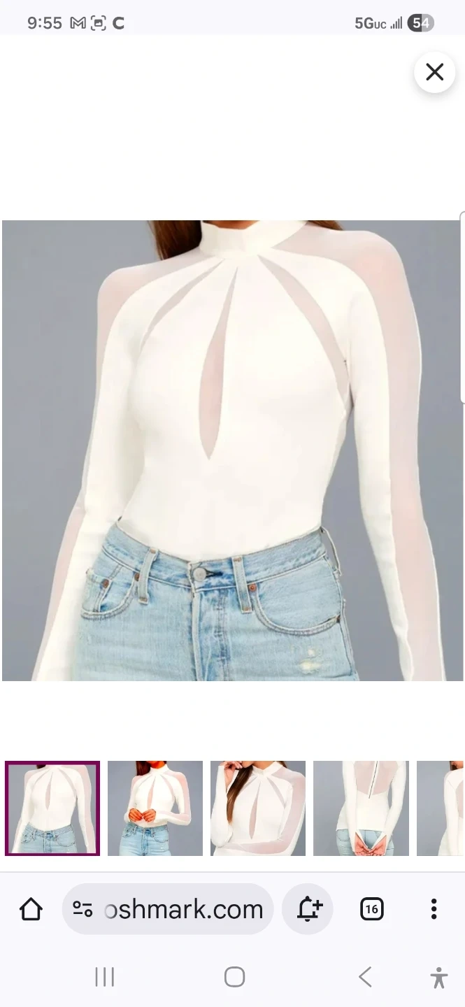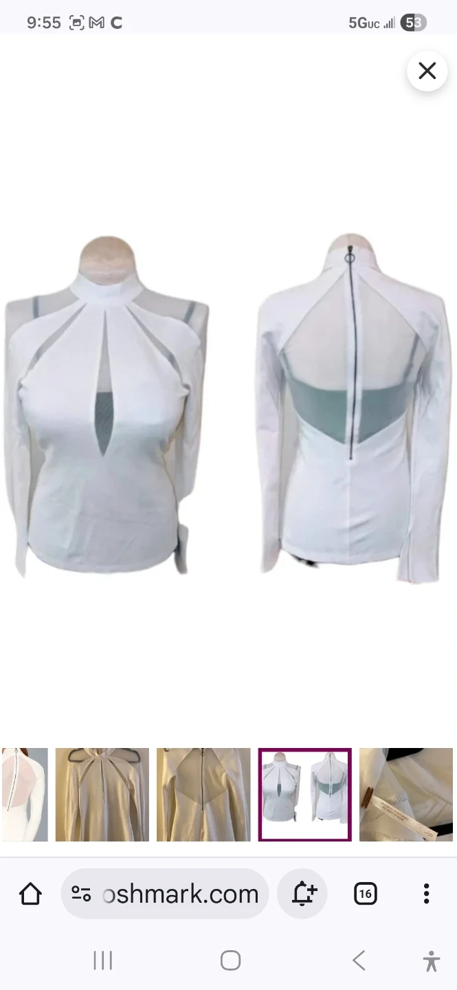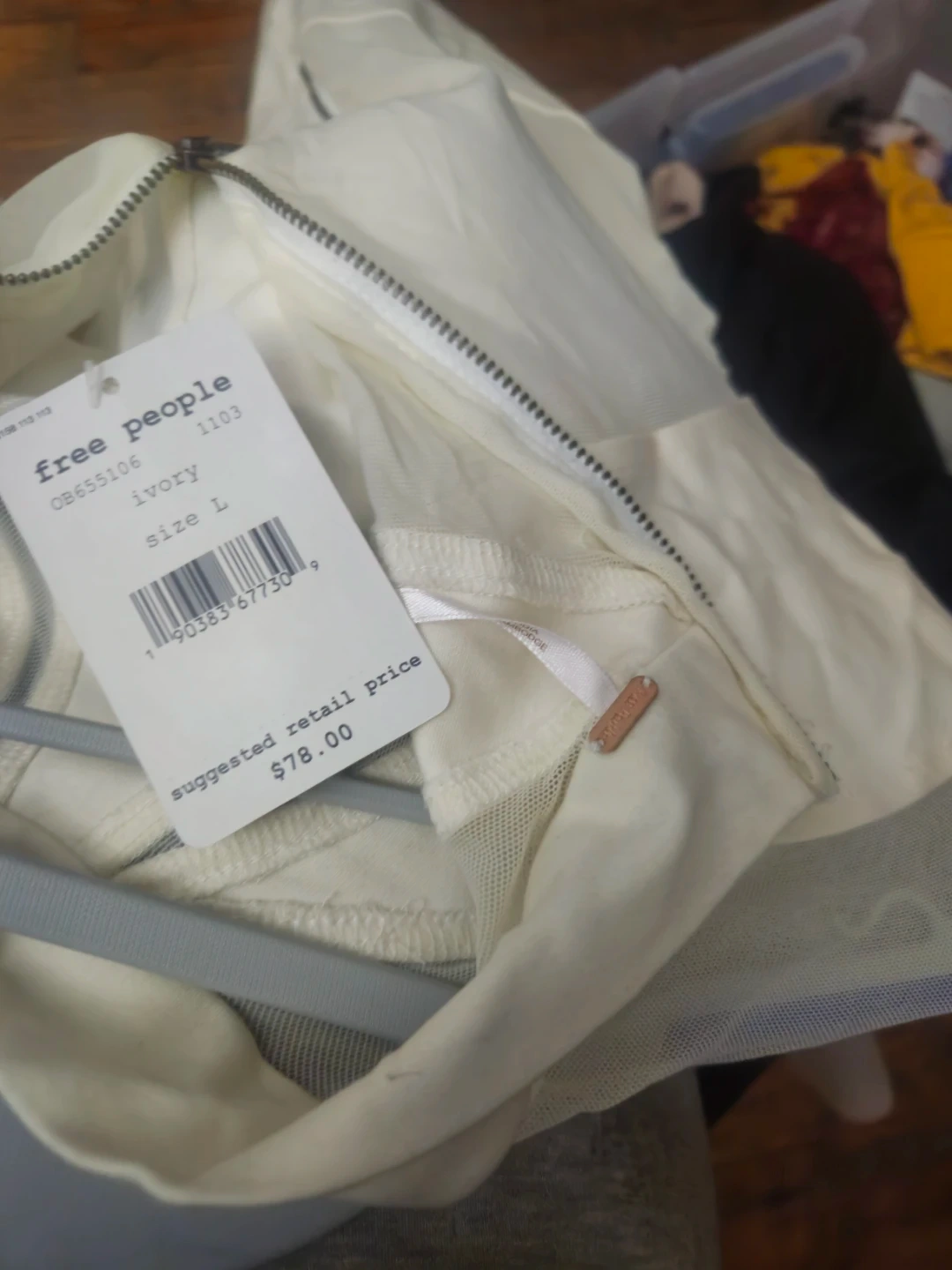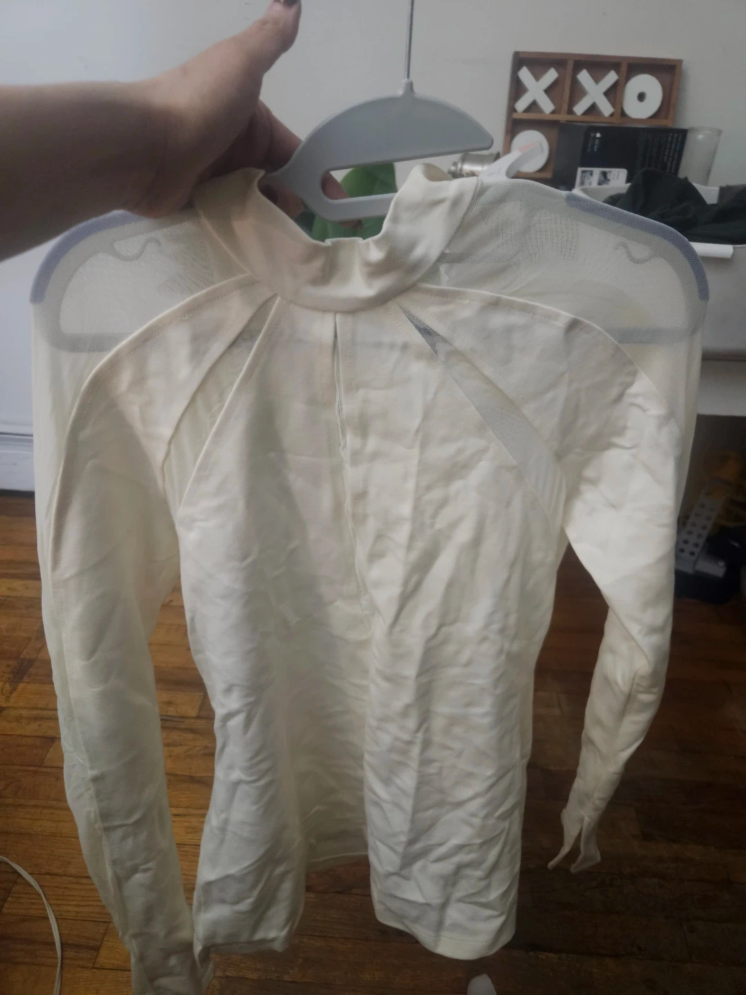 Free People mock neck long sleeve top in ivory. It features sheer mesh paneling on the sleeves and neckline. Zip closure down the back. Size L.