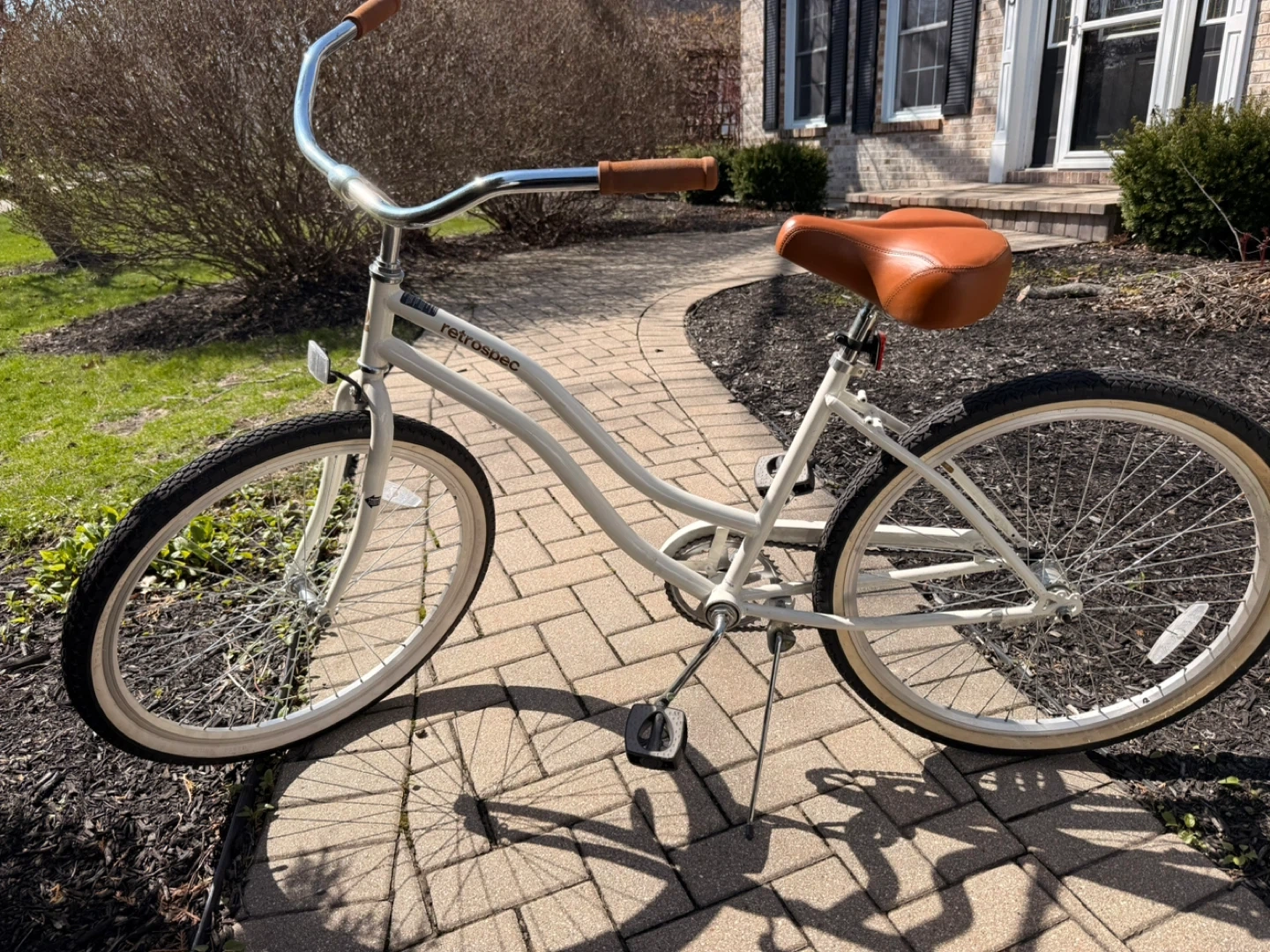 Retrospec brand cruiser bike in a light cream color. It features a comfortable brown saddle and grips. This bike is perfect for leisurely rides around town!