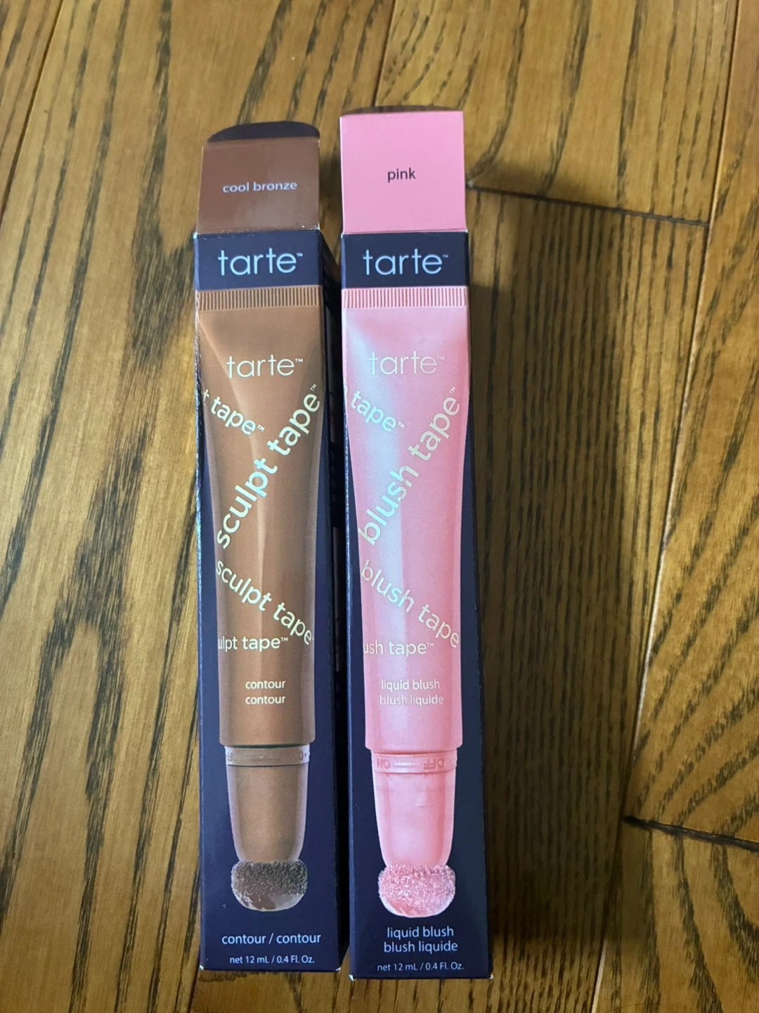 Tarte Sculpt Tape in Cool Bronze and Tarte Blush Tape in Pink. Each tube contains 12 mL (0.4 Fl. Oz.) of liquid product with an applicator tip.