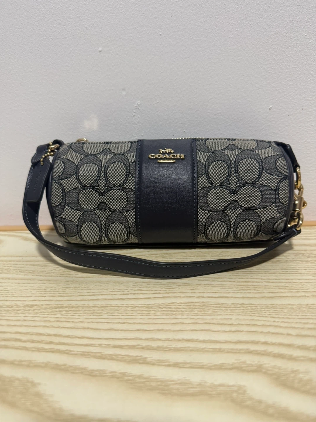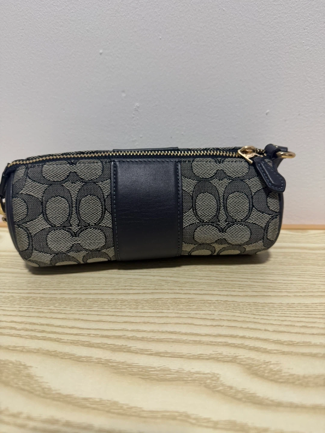 This is a COACH signature monogram cylindrical pouch. It's made with durable canvas and leather accents. Zipper closure keeps contents secure.