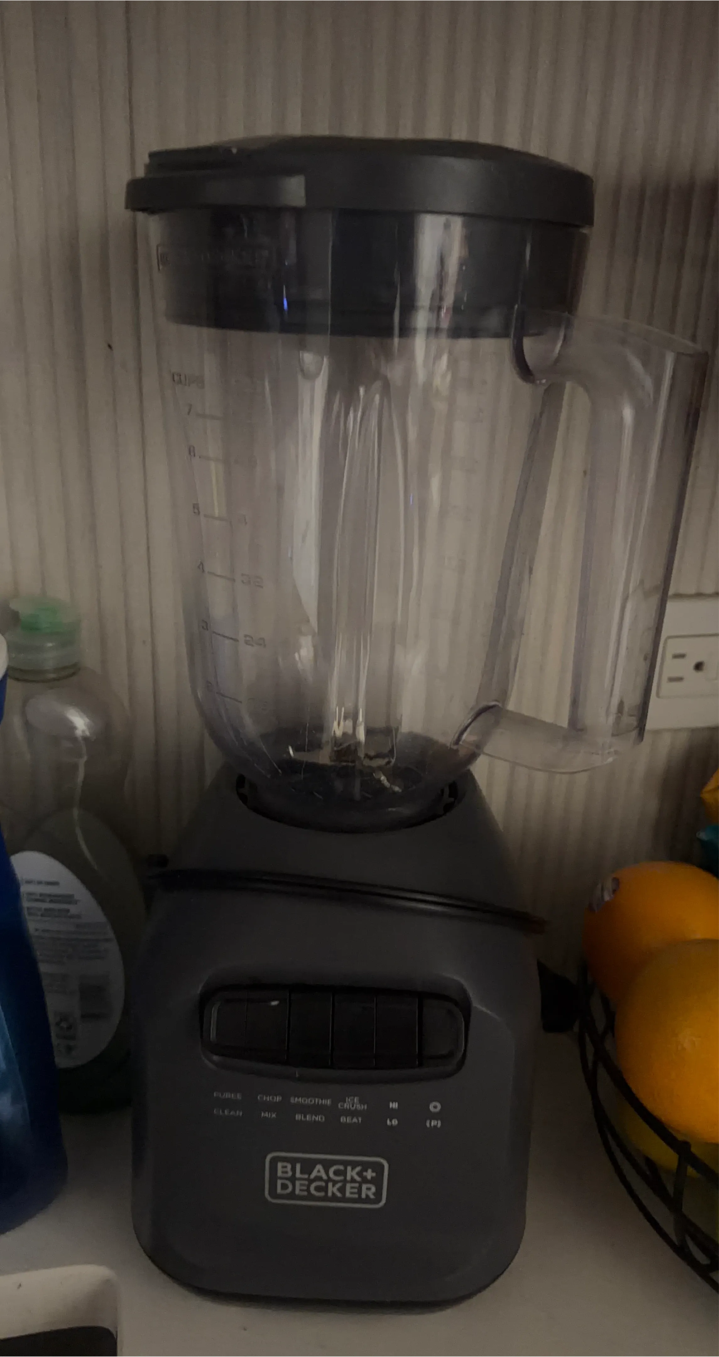 Black+Decker blender with a 24 oz capacity. It has multiple settings including Puree, Chop, Smoothie, Ice Crush, Mix, Blend, and Beat. Functions include High and Low speeds, plus Pulse.