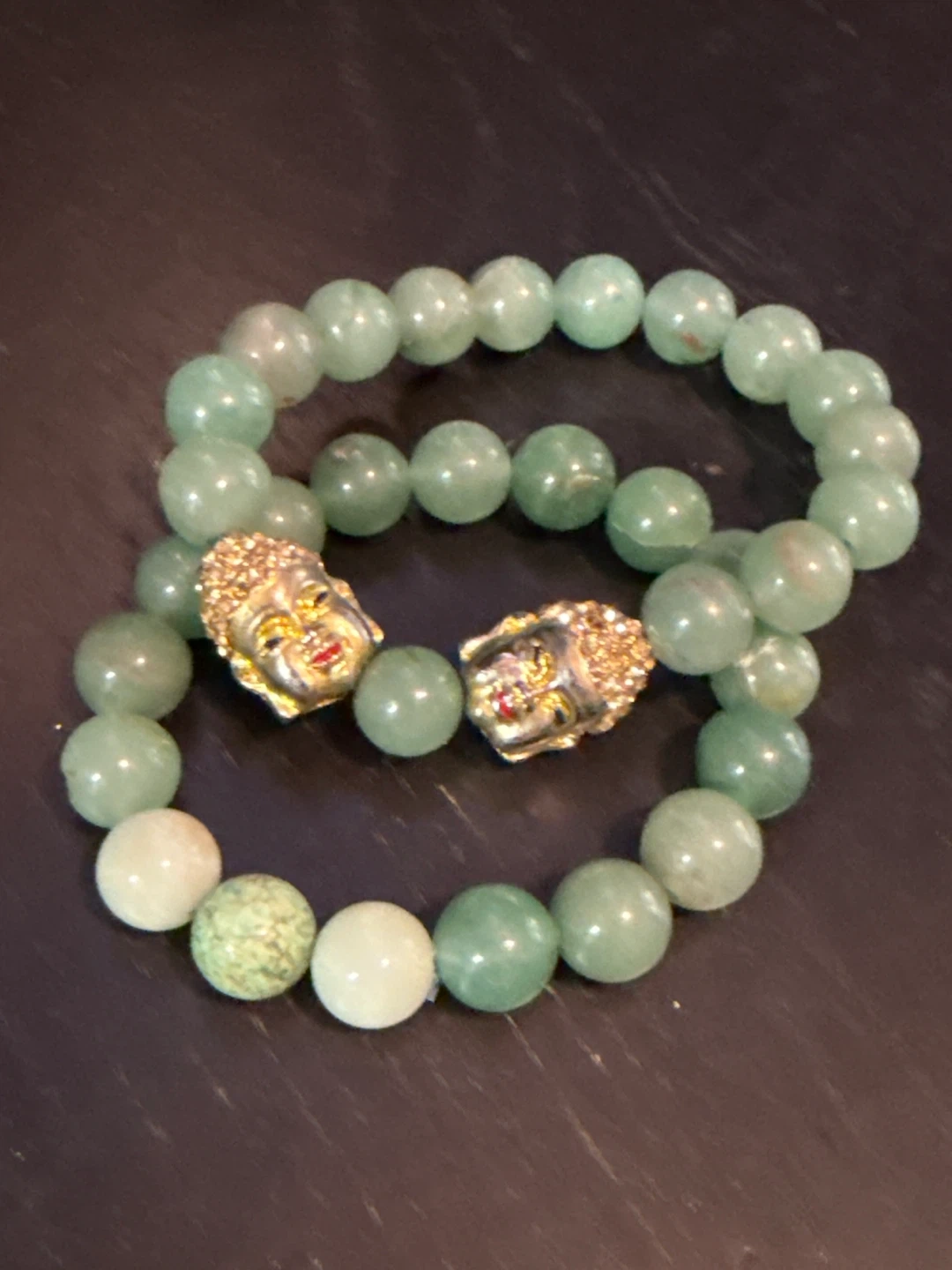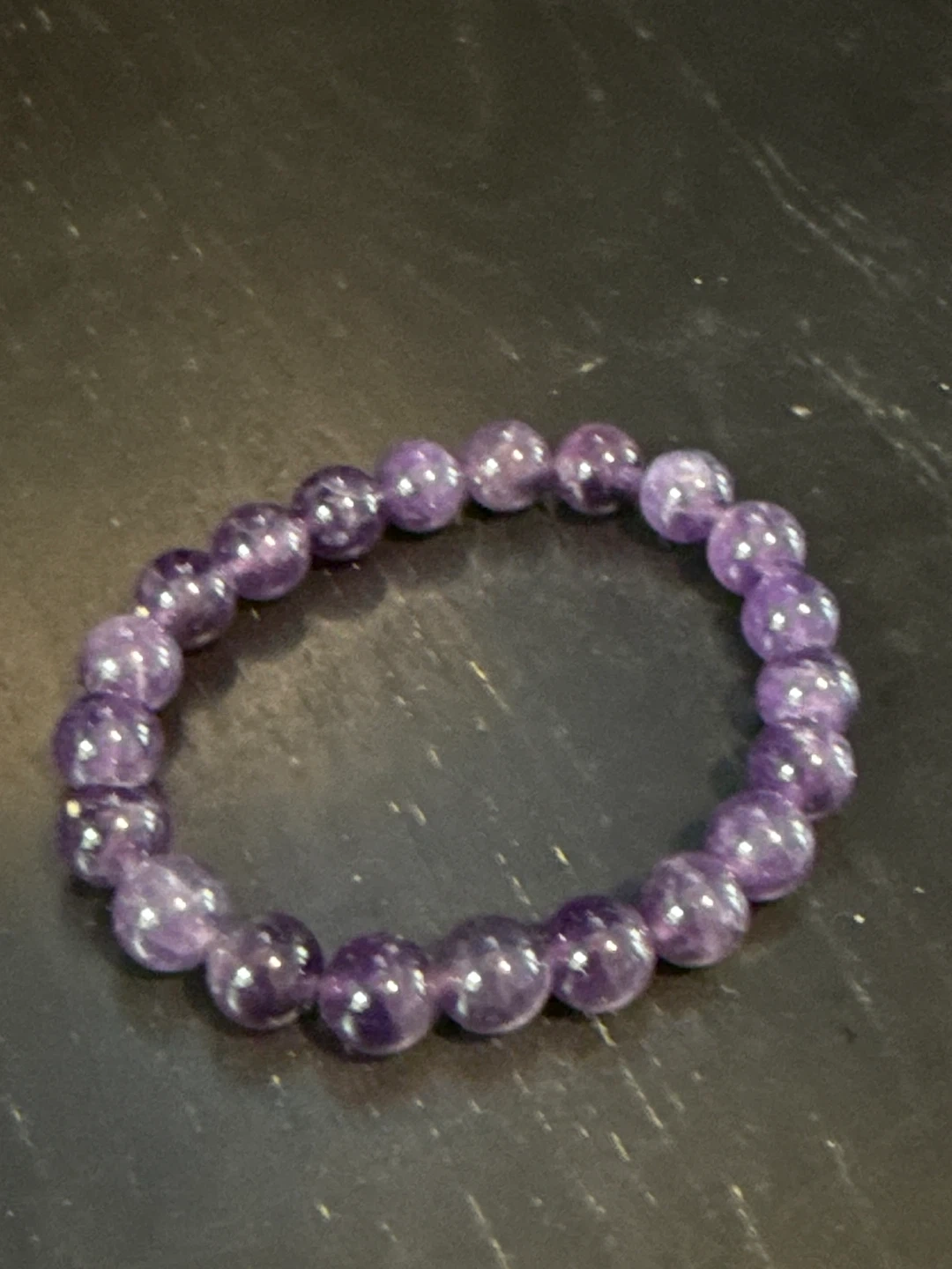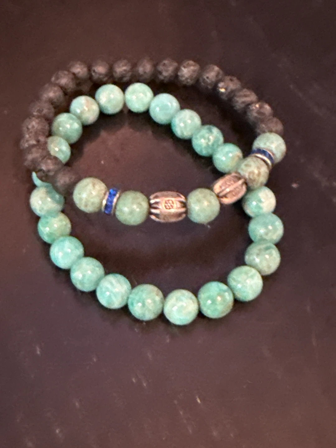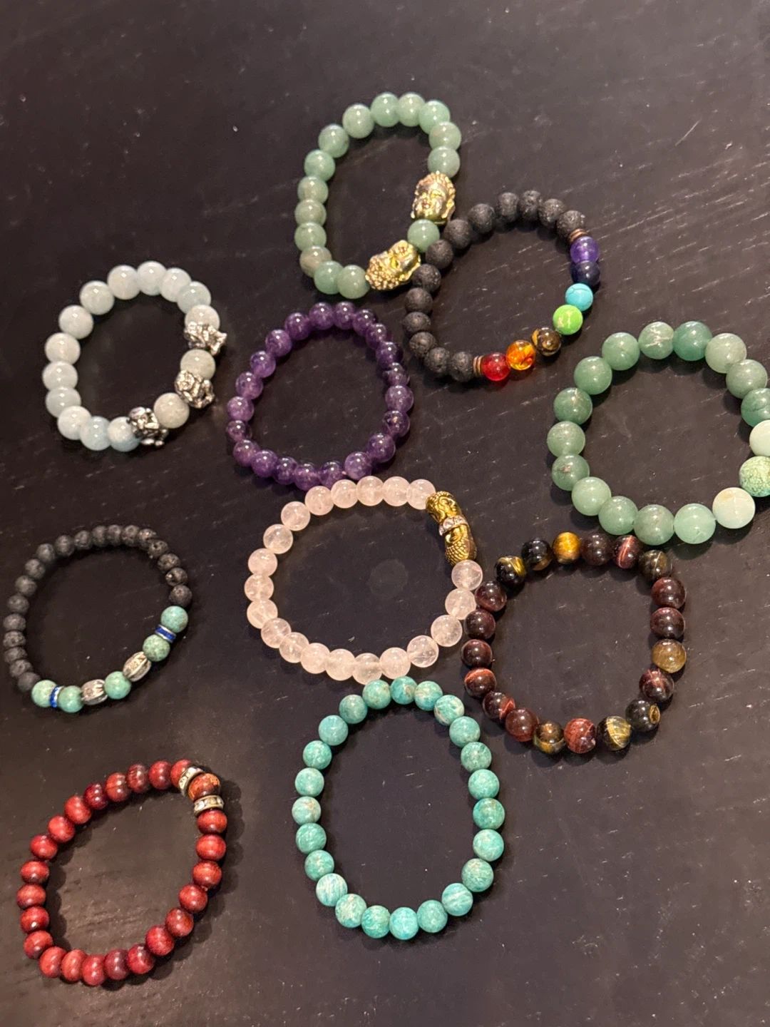 Set of assorted beaded stretch bracelets. Includes bracelets with real jade-beads, lava beads, wood beads, and tiger's eye beads, aquamarine, beads, rose, quartz, and amethyst .