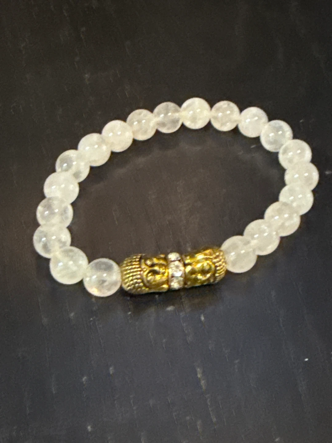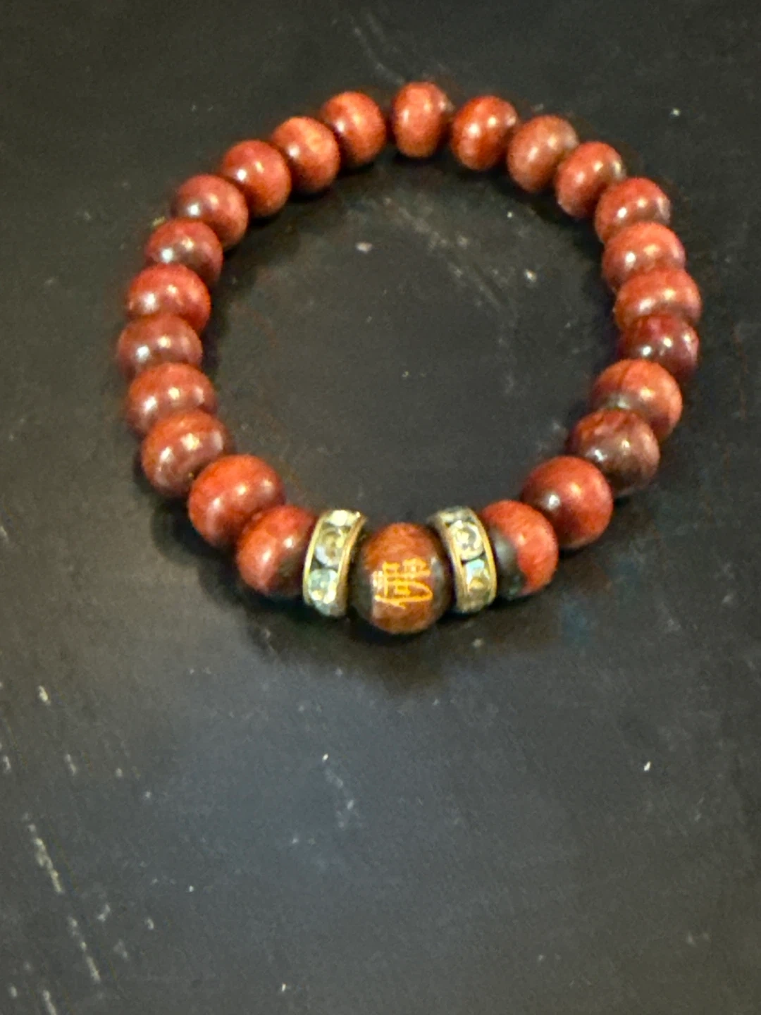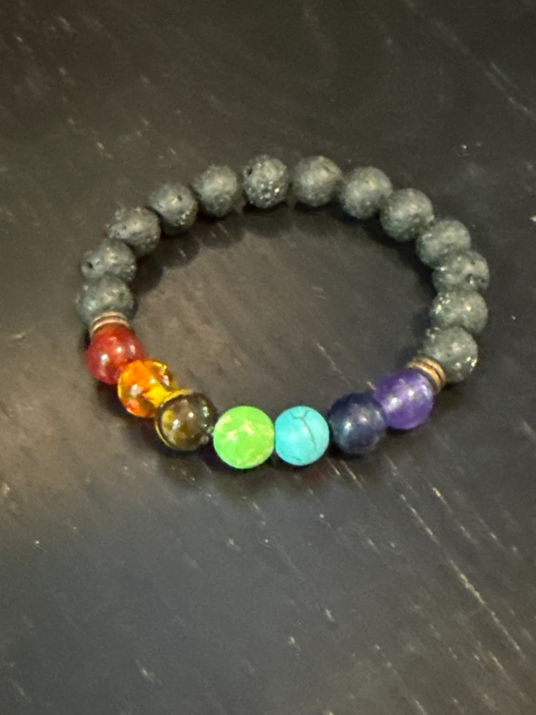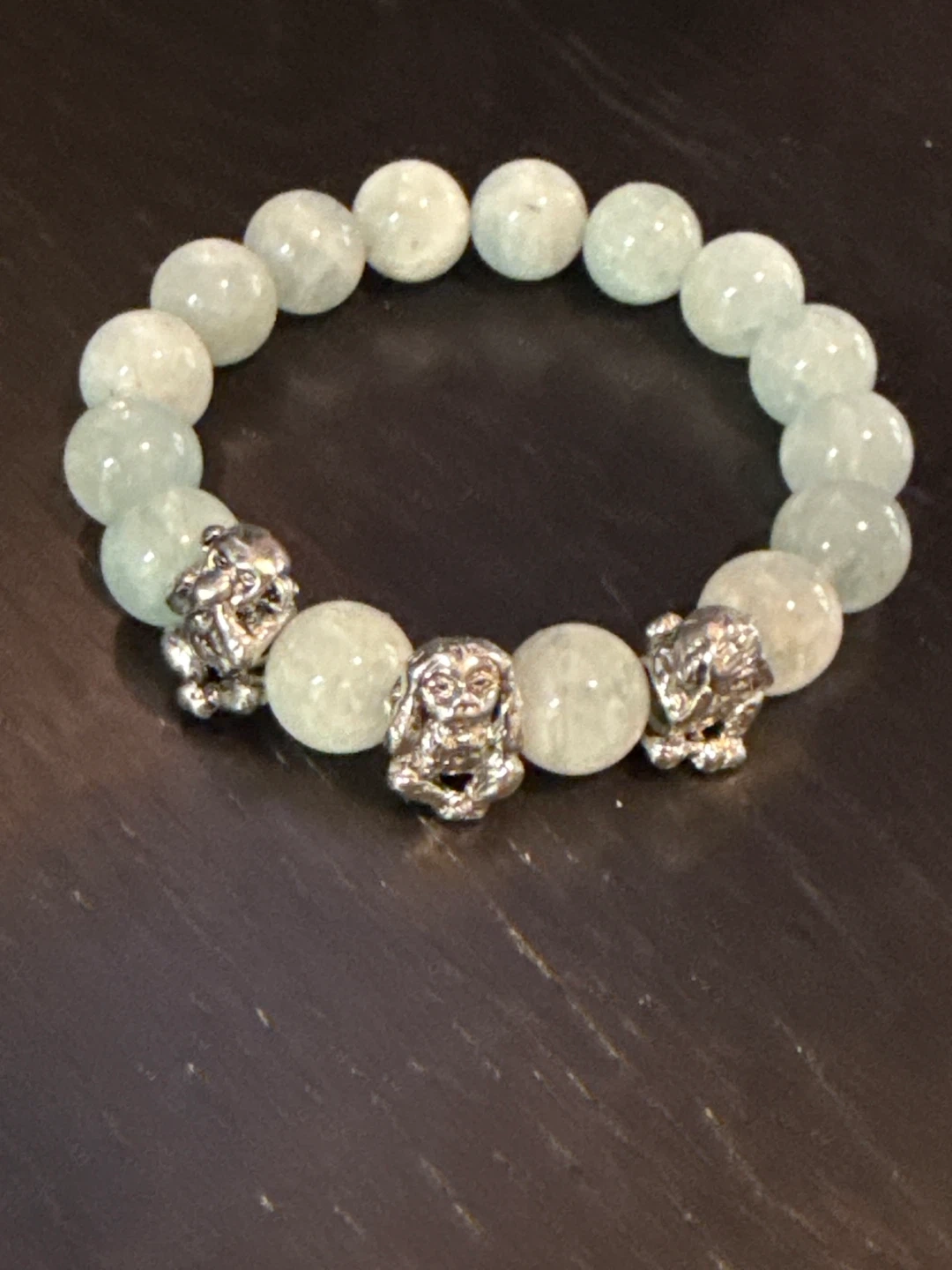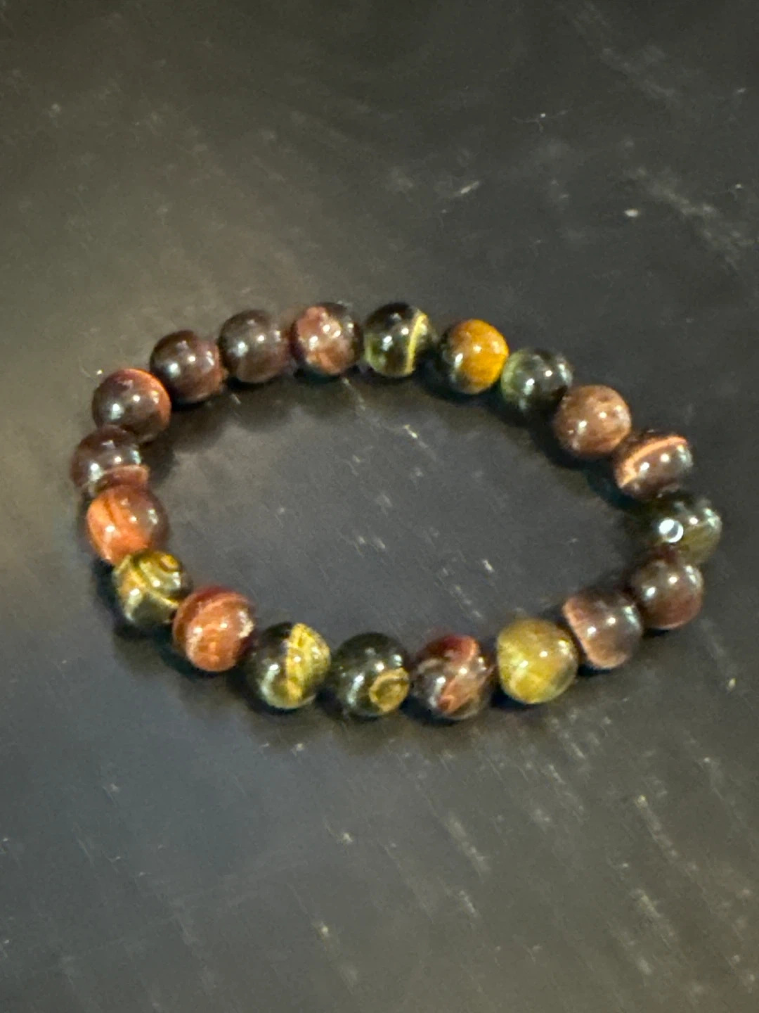 Set of assorted beaded stretch bracelets. Includes bracelets with real jade-beads, lava beads, wood beads, and tiger's eye beads, aquamarine, beads, rose, quartz, and amethyst .