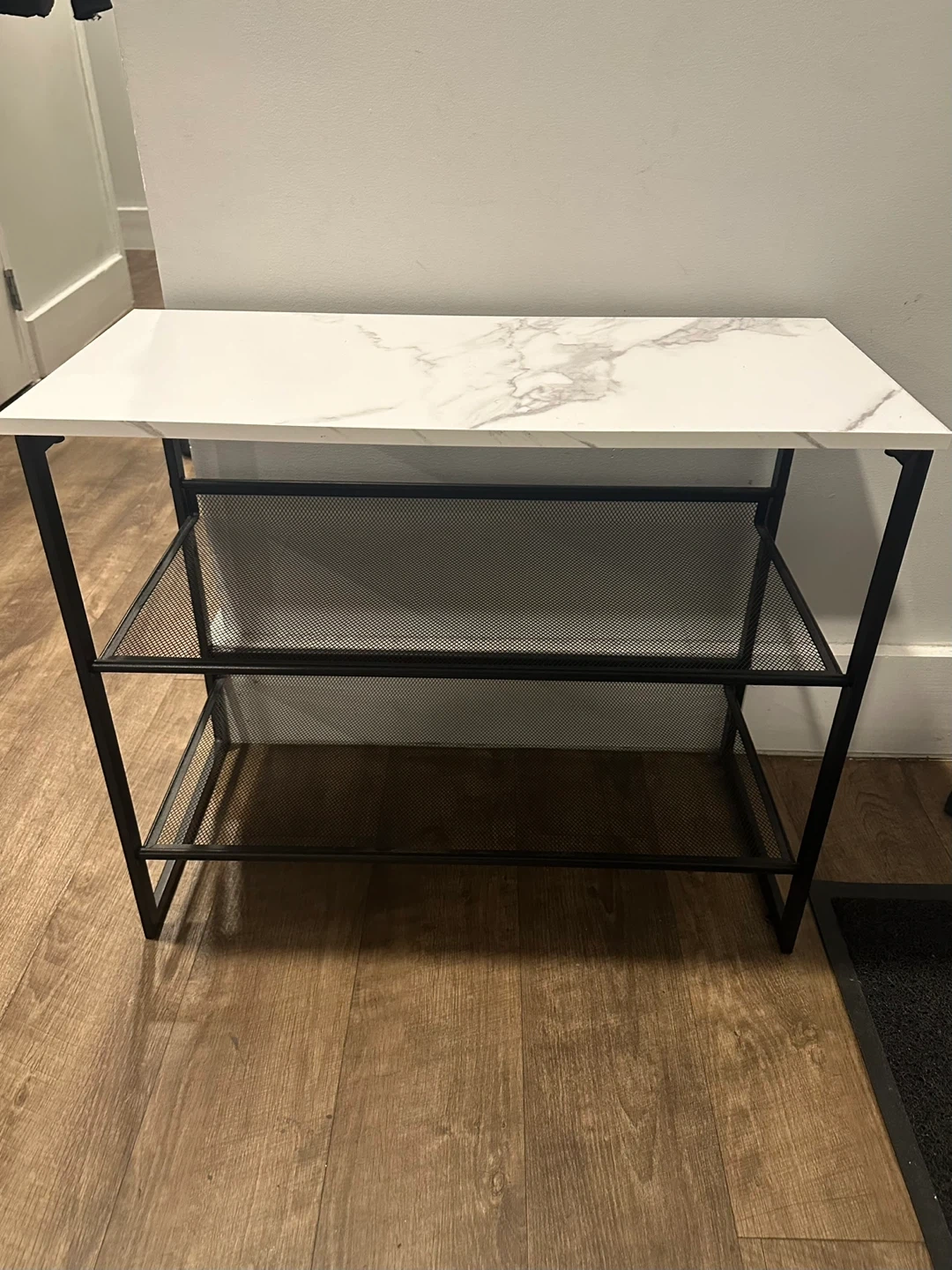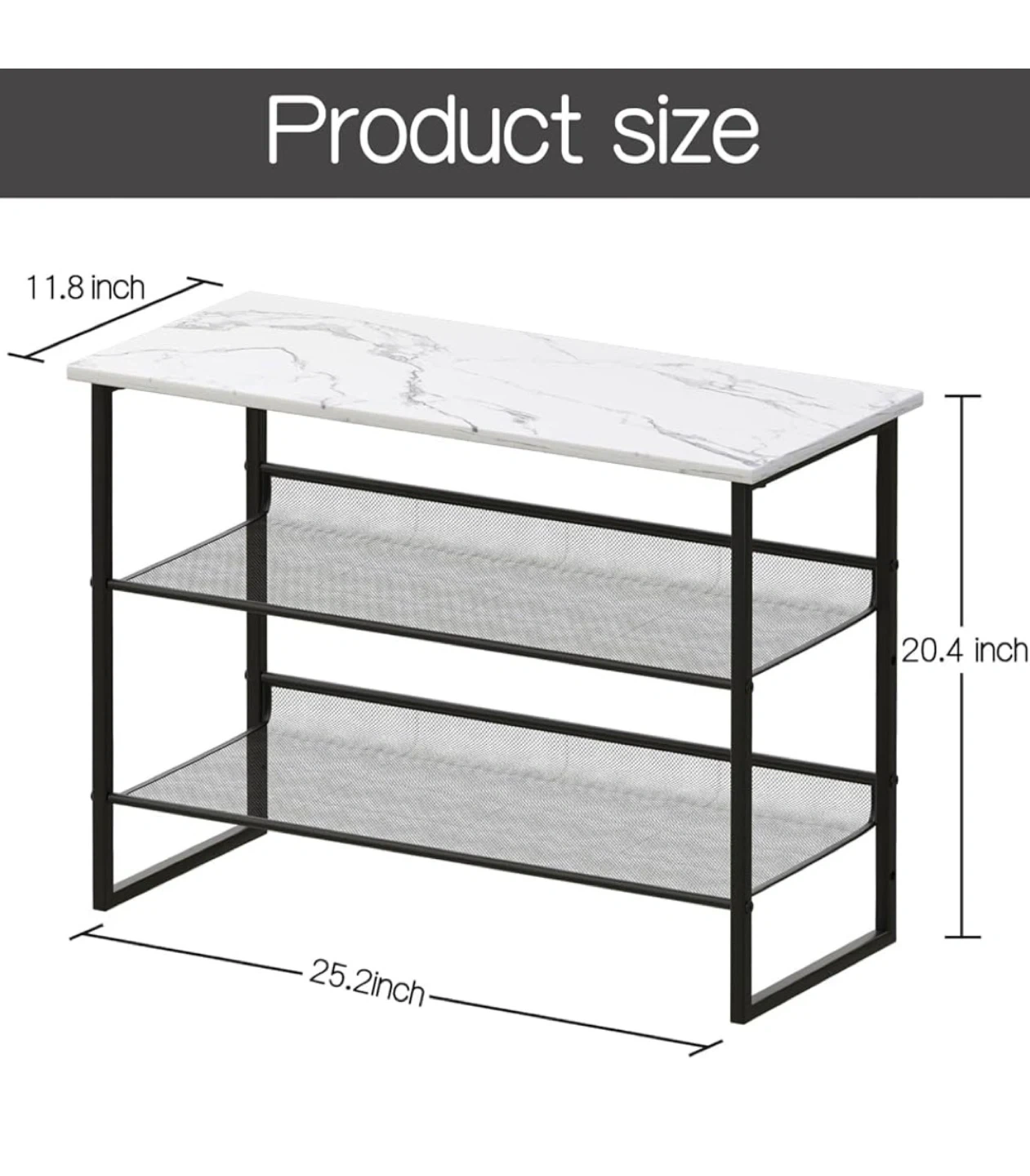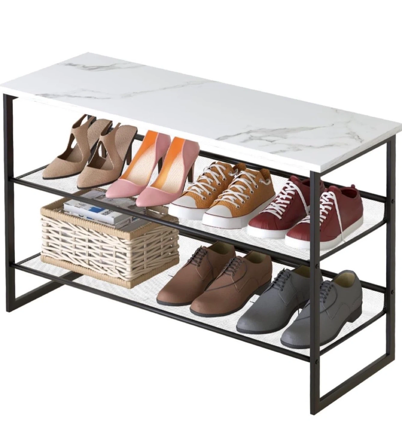 2-tier shoe rack bench with a stylish white marble top. The metal frame and shelves provide a sturdy structure for multiple shoes.