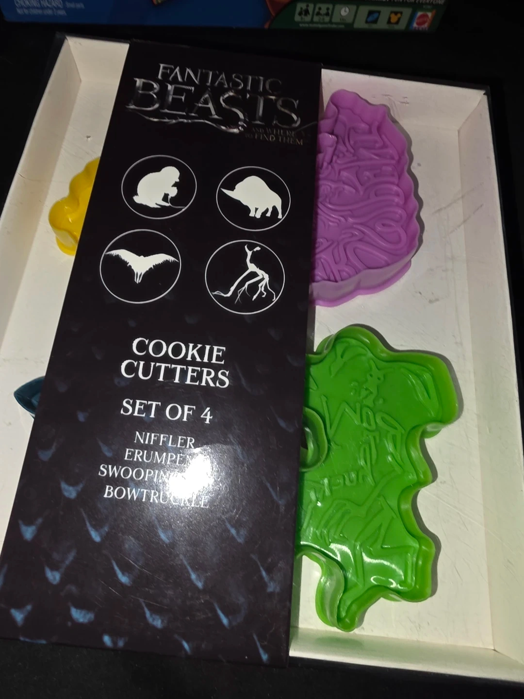 This is a set of 4 cookie cutters inspired by Fantastic Beasts. They feature Niffler, Erumpent, Swooping Evil, and Bowtruckle designs. Perfect for baking themed treats!