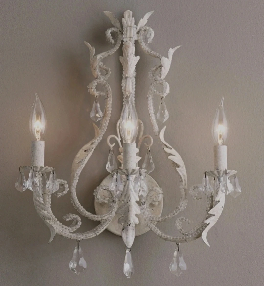 This wall sconce features a white, ornate design with cascading crystal accents. It holds three faux candle bulbs, creating a charming ambiance. Its intricate details add a touch of elegance to any room.