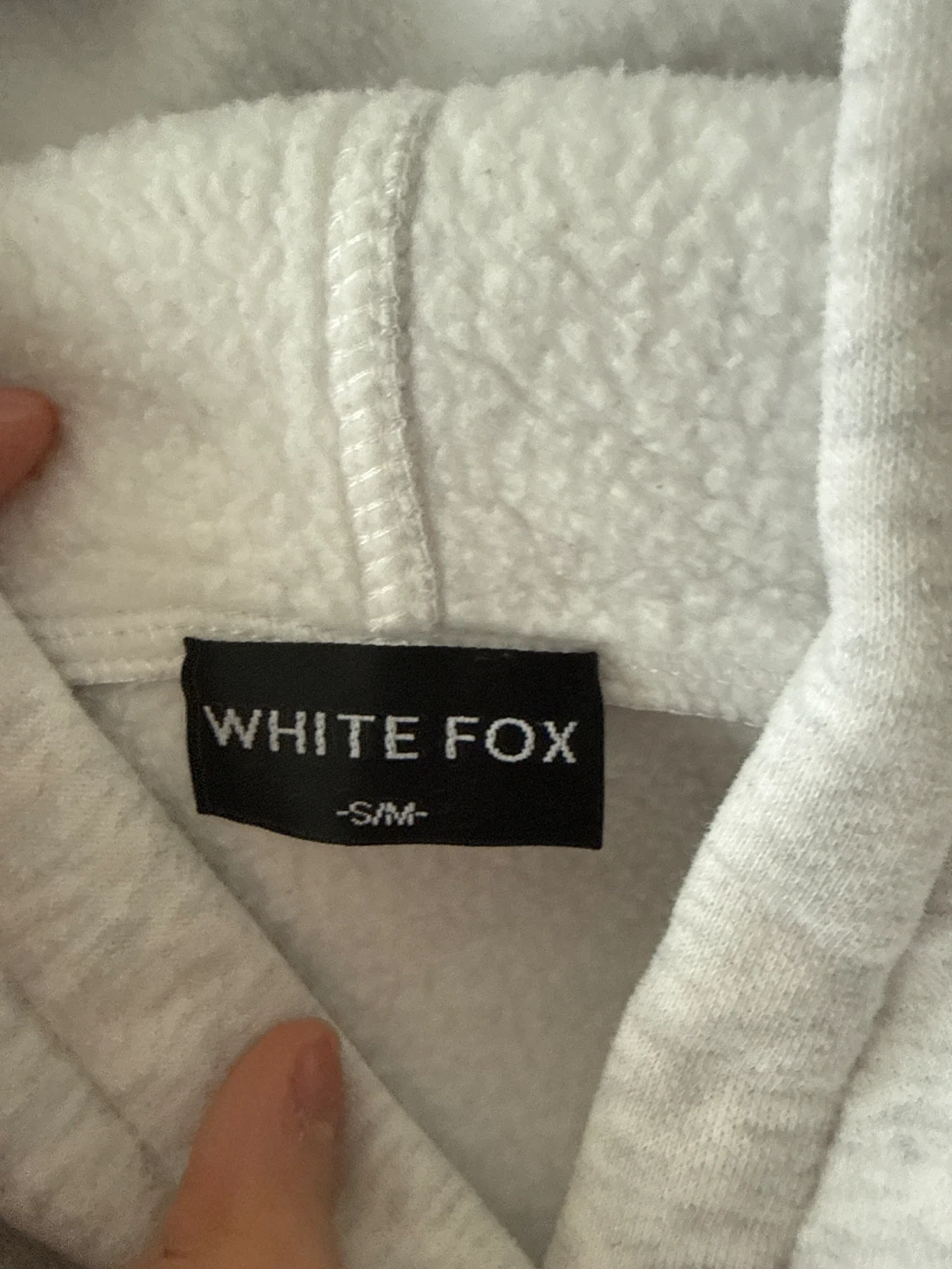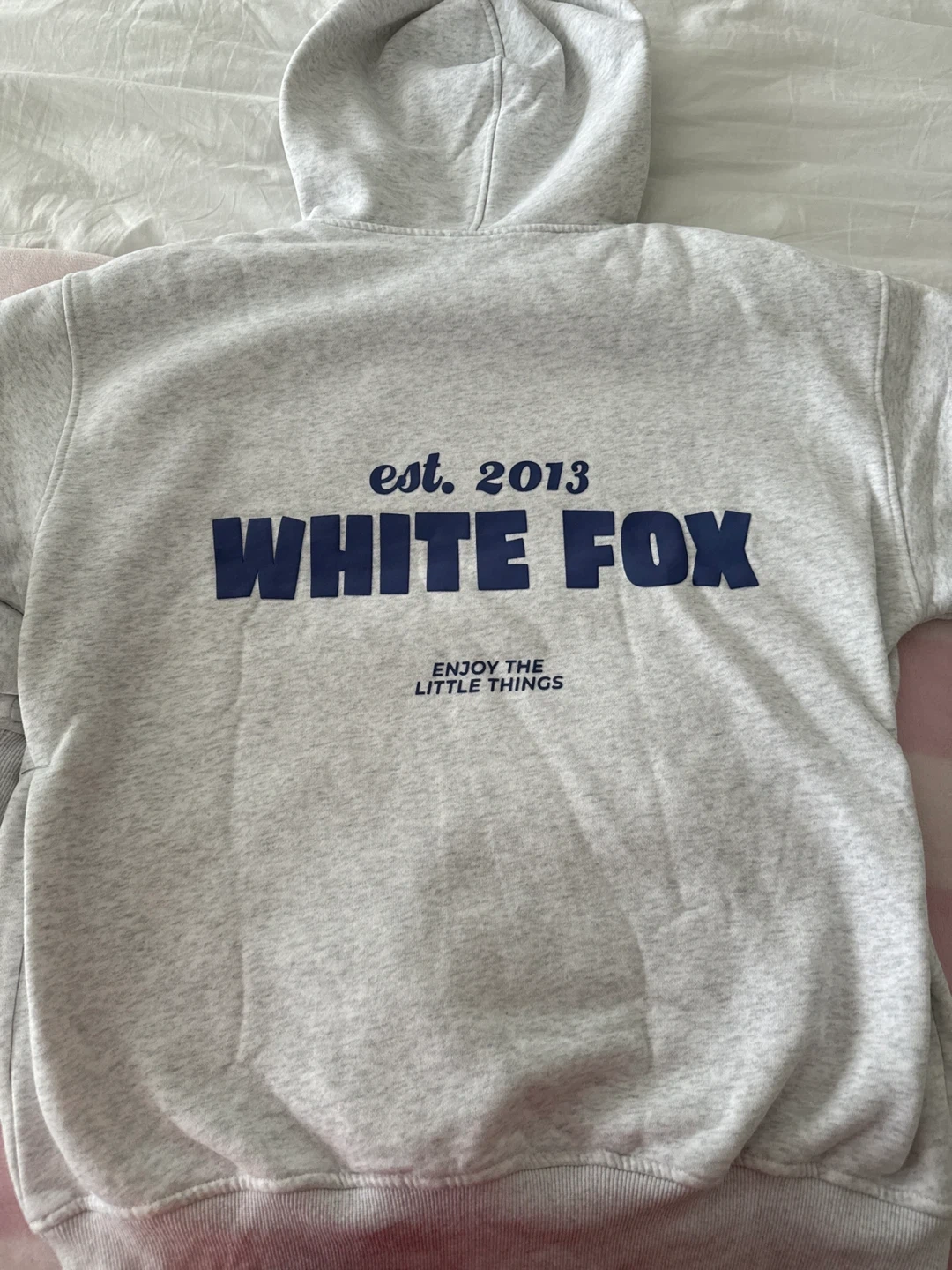 Grey hoodie from White Fox, est. 2013. It's a size S/M. Made of a soft fleece material. Enjoy the little things only worn twice!