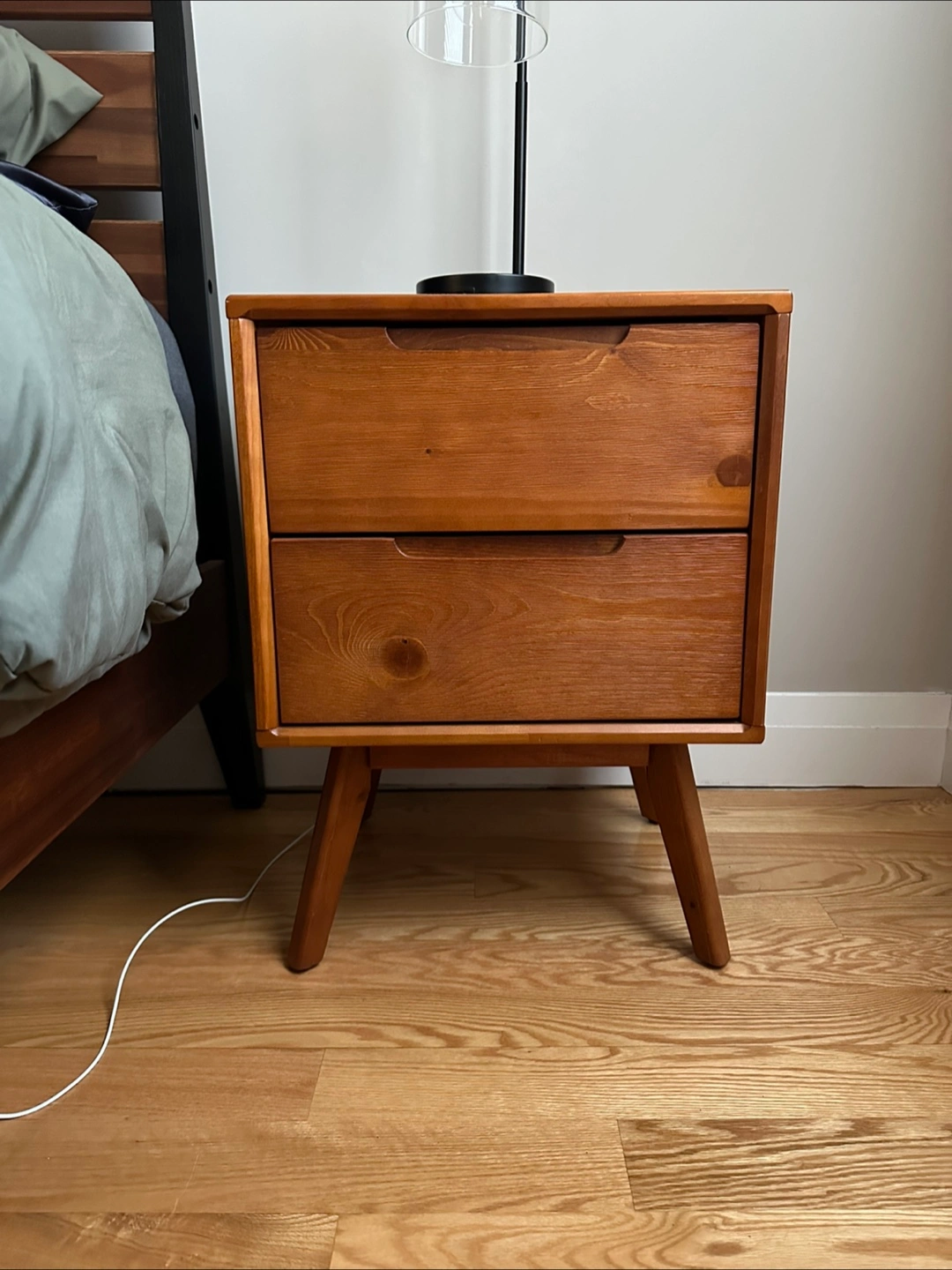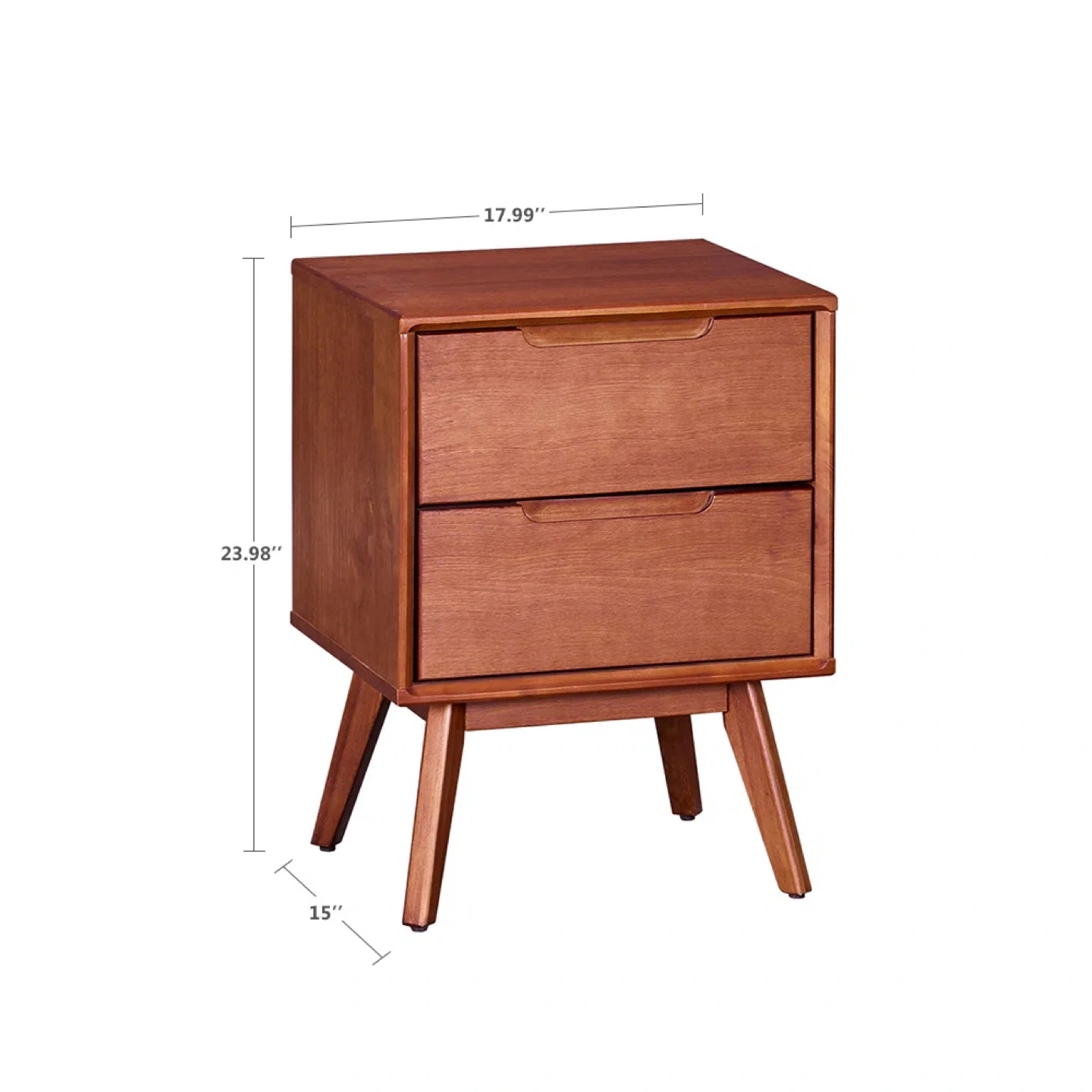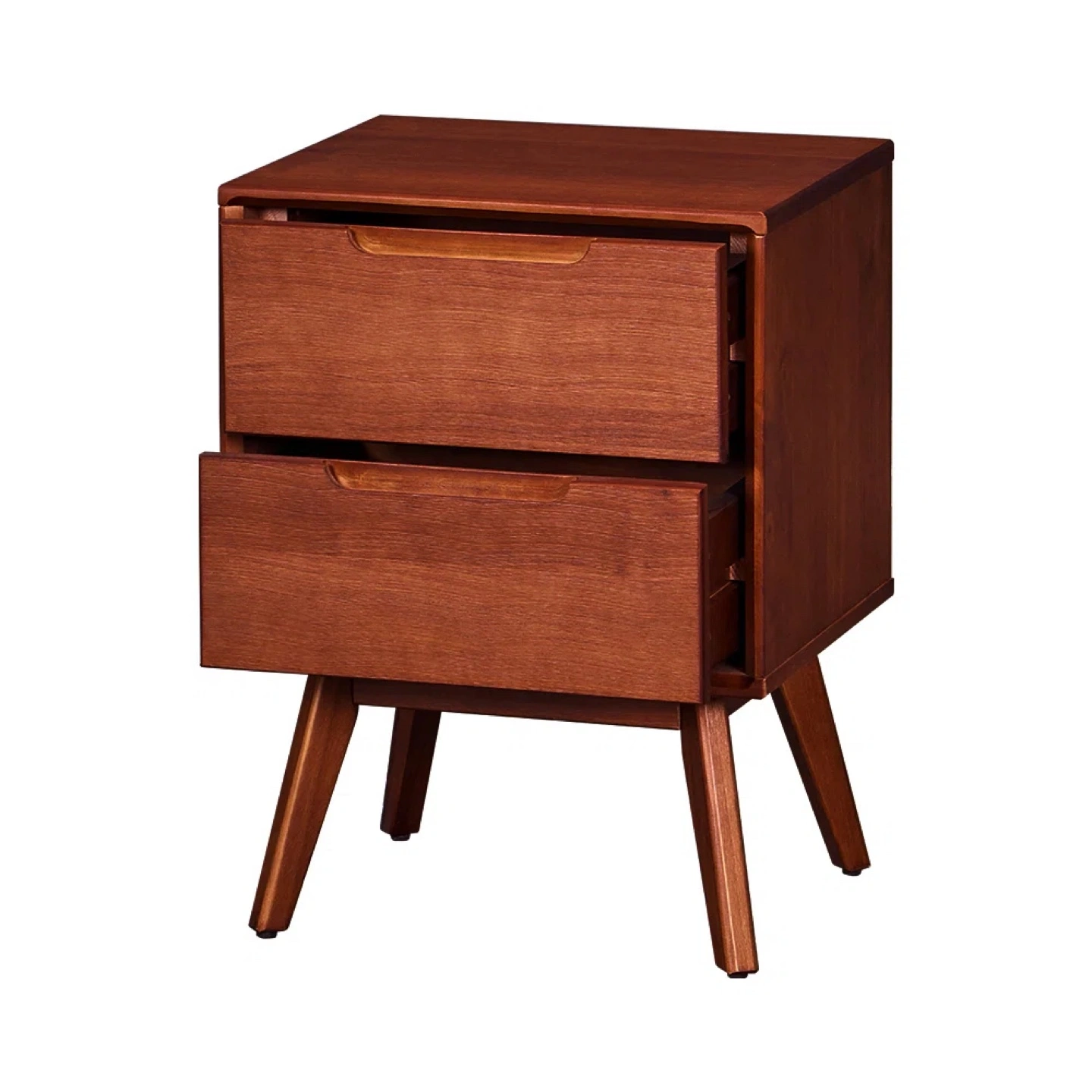 It has a mid-century modern style and features two drawers. It stands on angled legs.