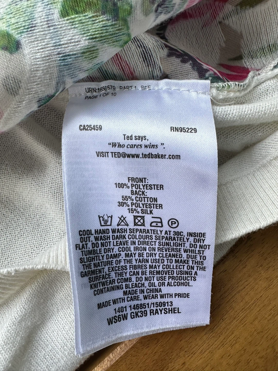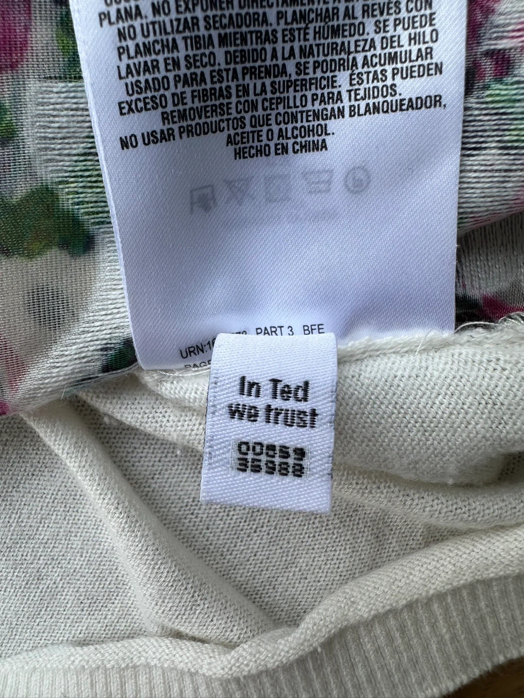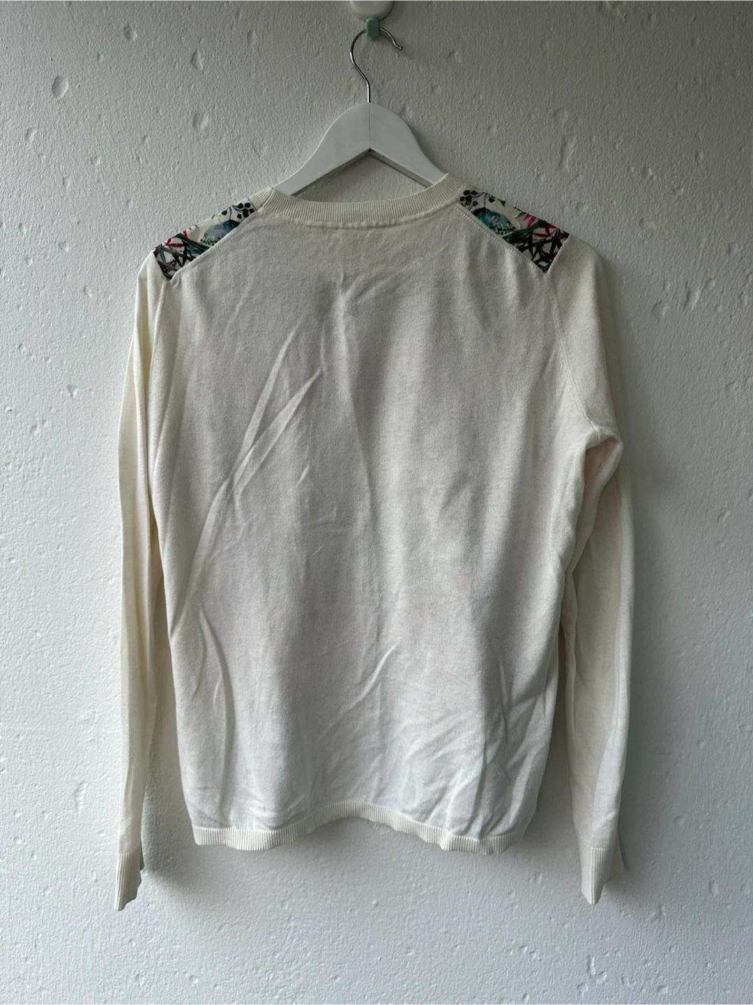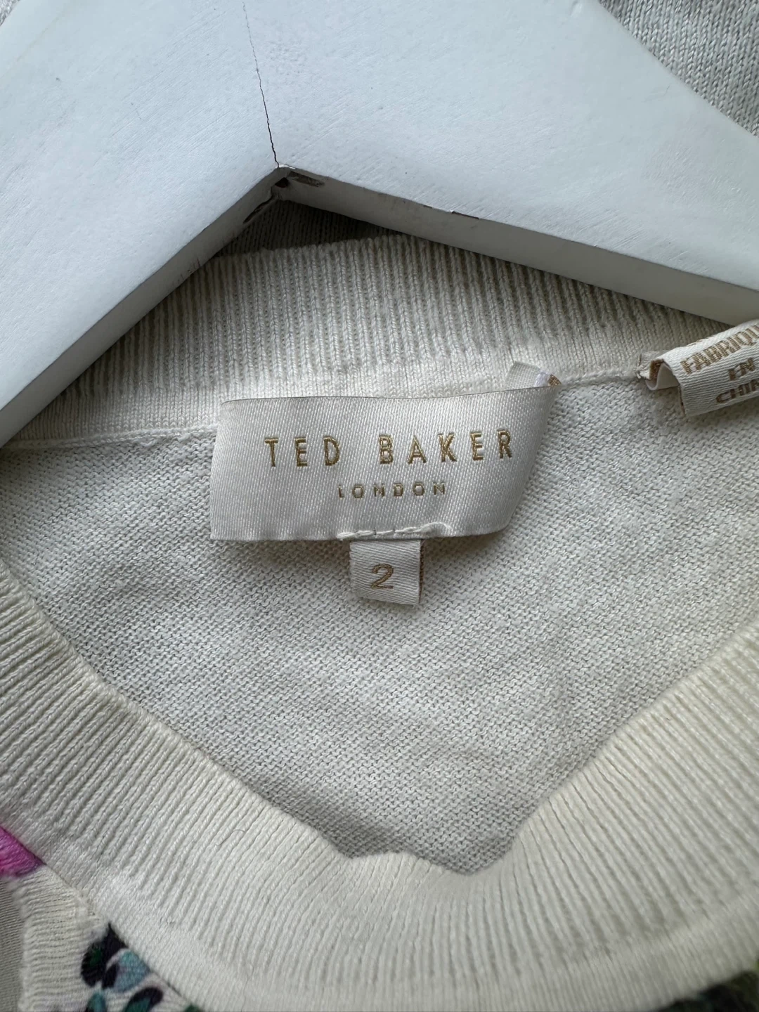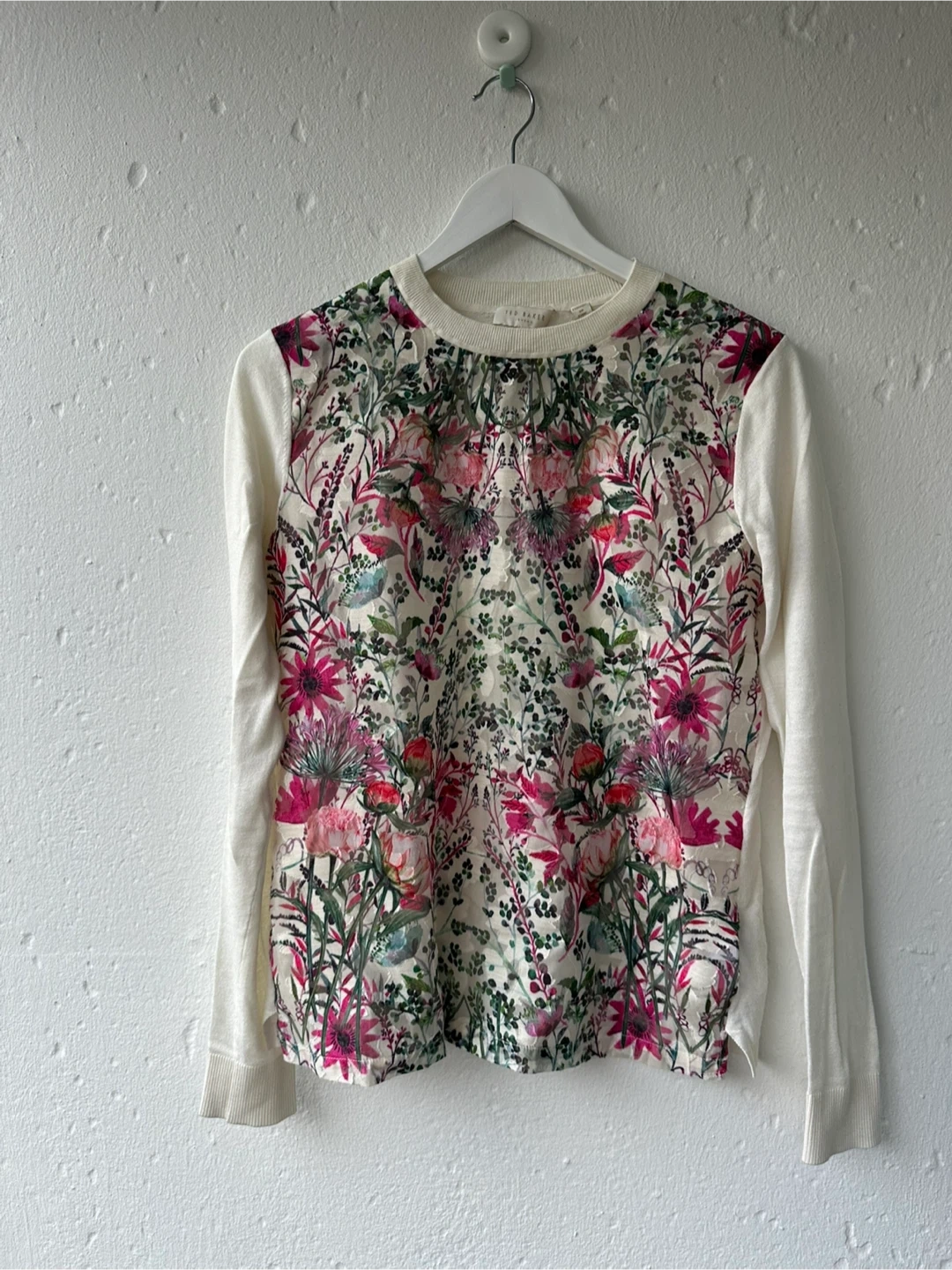Size Women’s Medium . Charming Ted Baker London sweater in size 2, featuring a vibrant floral print on the front. It's made with a blend of 100% polyester for the front panel, 55% cotton and 30% polyester for the sleeves and back, and 15% silk. This sweater is perfect for adding a pop of colour to your wardrobe!