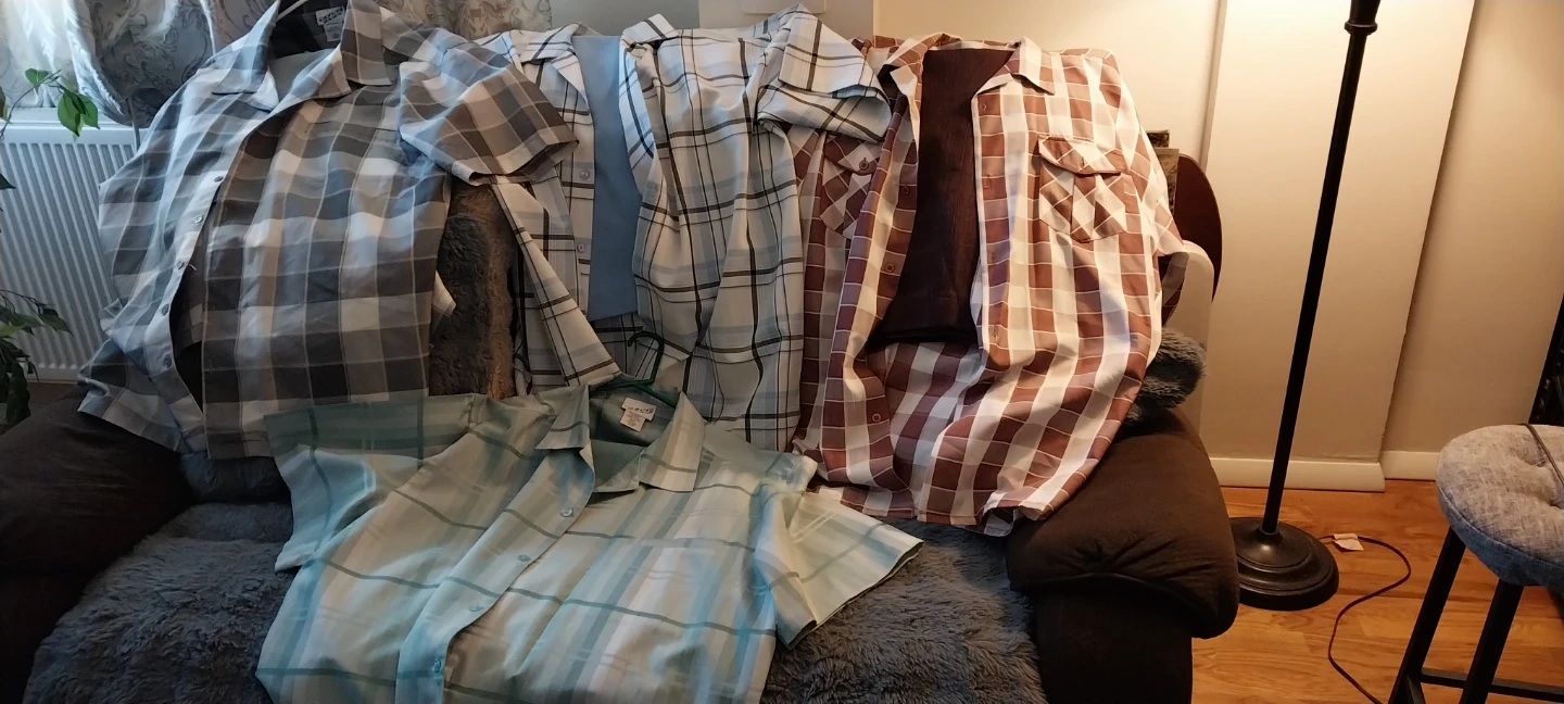 This bundle includes multiple men's short sleeve button-up shirts in various plaid patterns. It also comes with a pair of matching pants. These leisure suits are great for casual wear or for putting together a retro look!