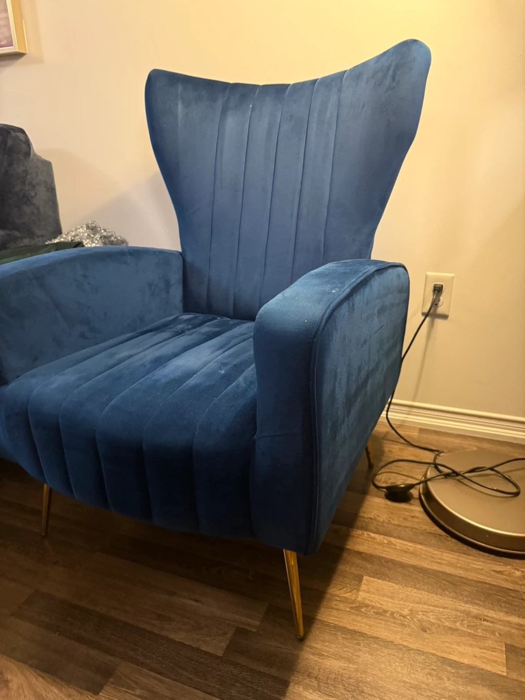 Selling a stylish blue velvet accent chair! It's in great condition and would be a lovely addition to any living space. The chair features a unique wingback design and sleek golden legs.