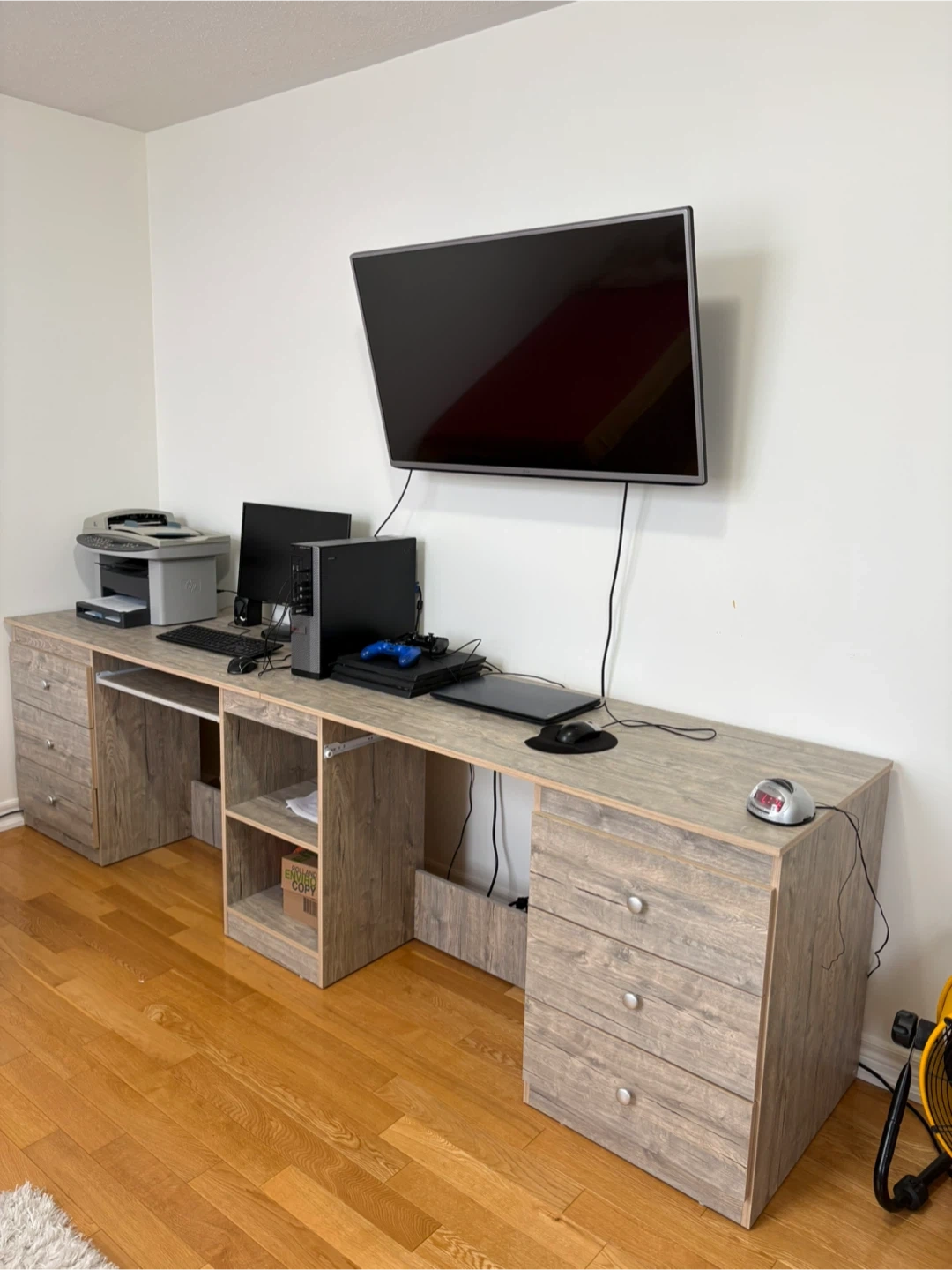 Spacious L-shaped desk featuring multiple drawers and open shelving for all your storage needs. It's made from durable wood laminate in a rustic grey-brown finish. This desk is perfect for setting up a home office or gaming station!