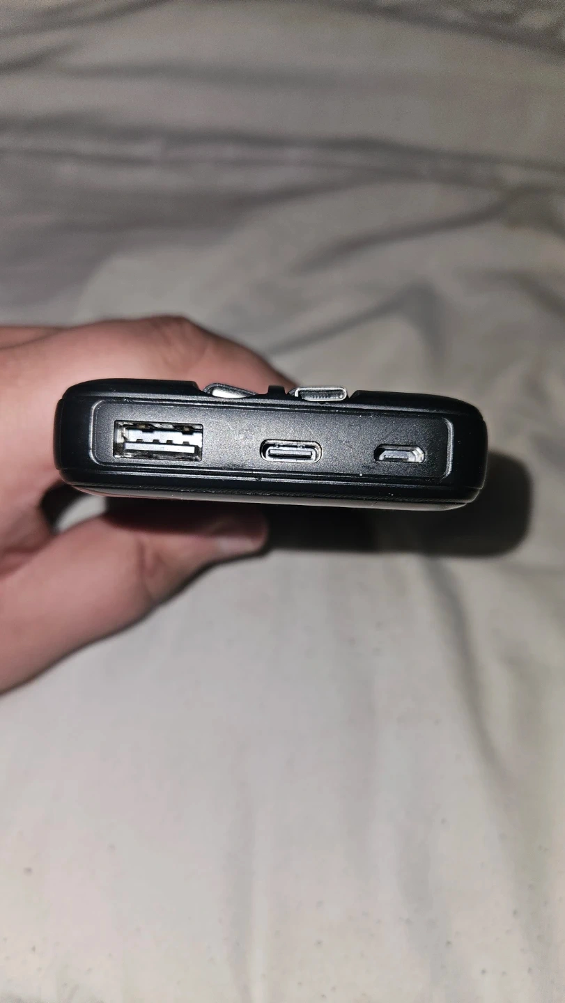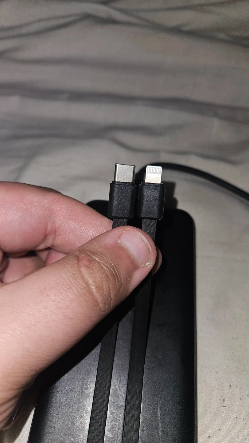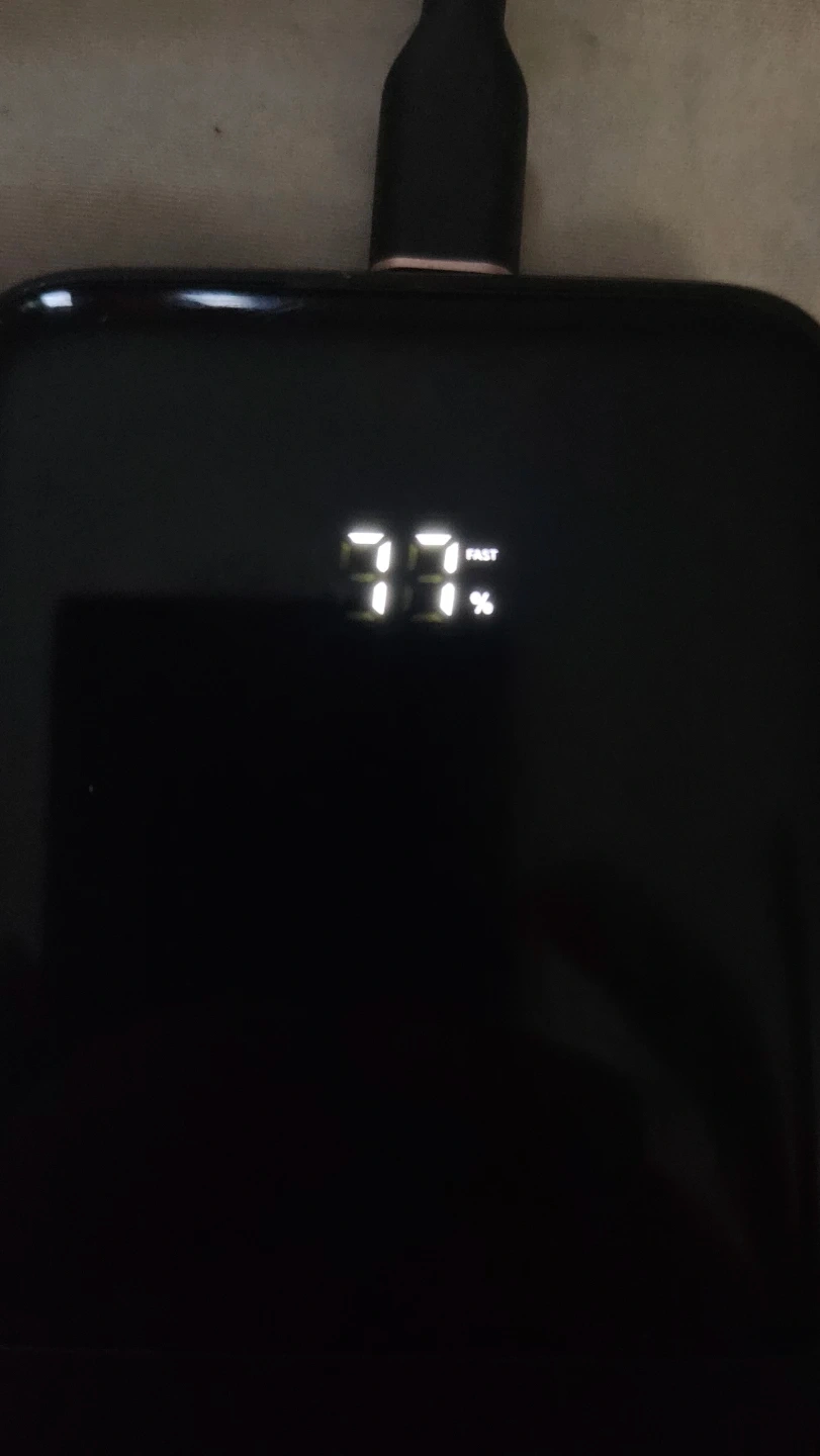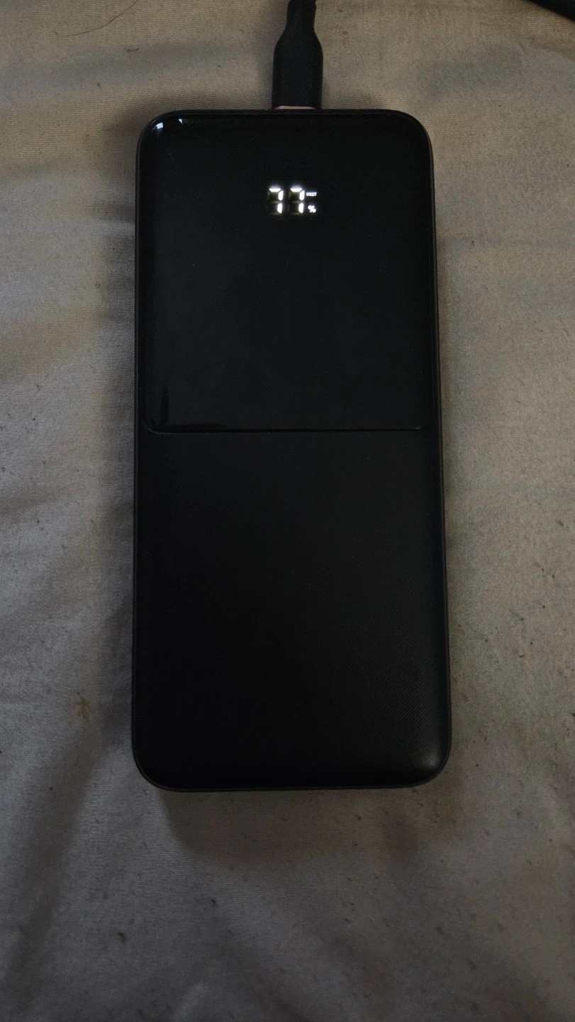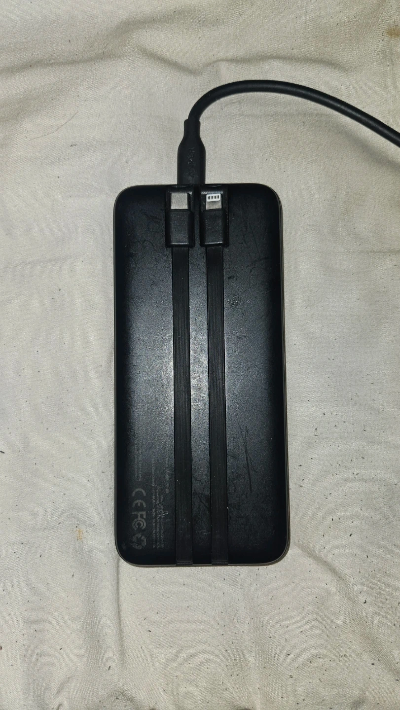 Black power bank with a digital display. It includes integrated USB-C and Lightning cables. This power bank is great for keeping your devices charged on the go!