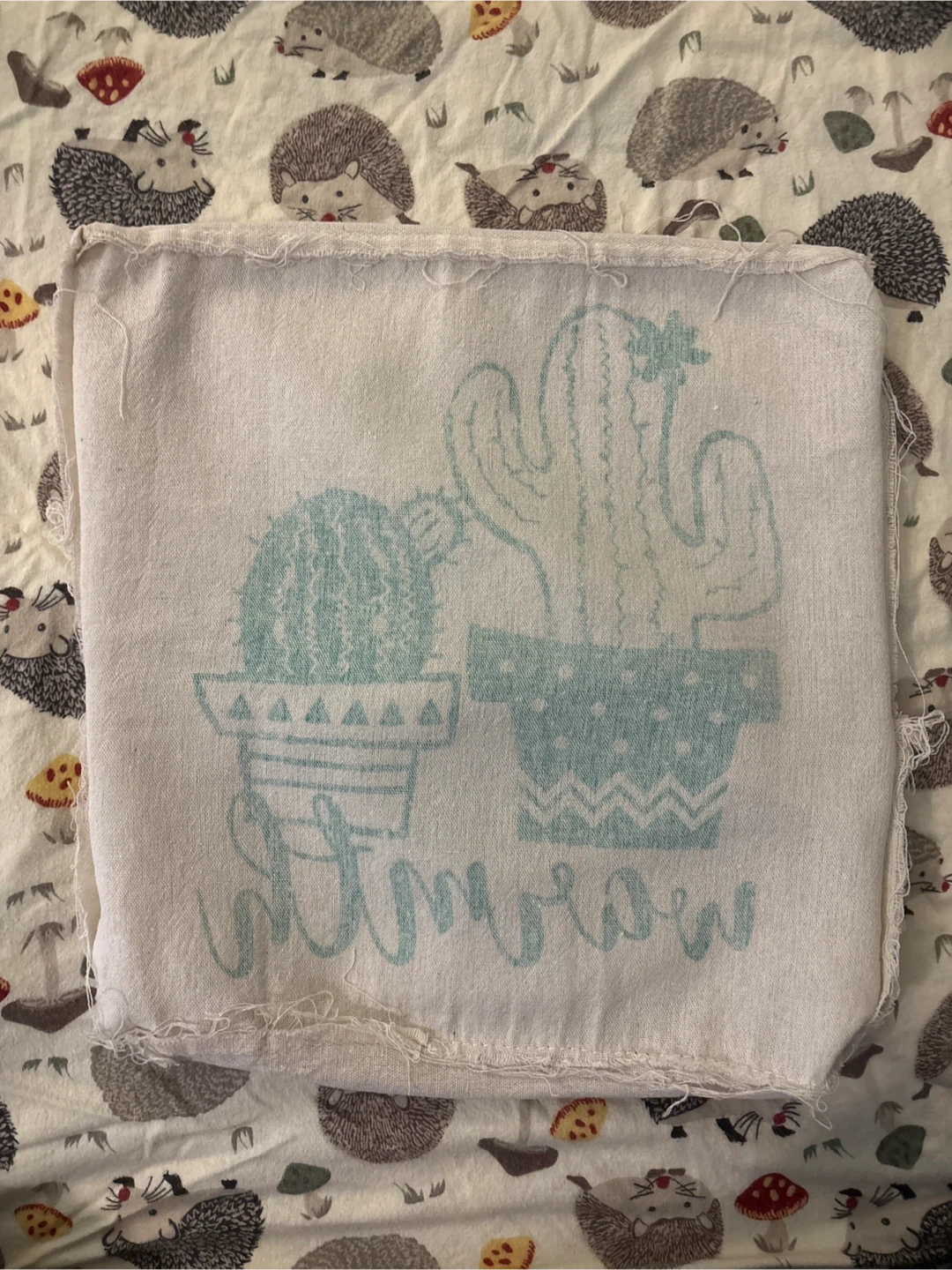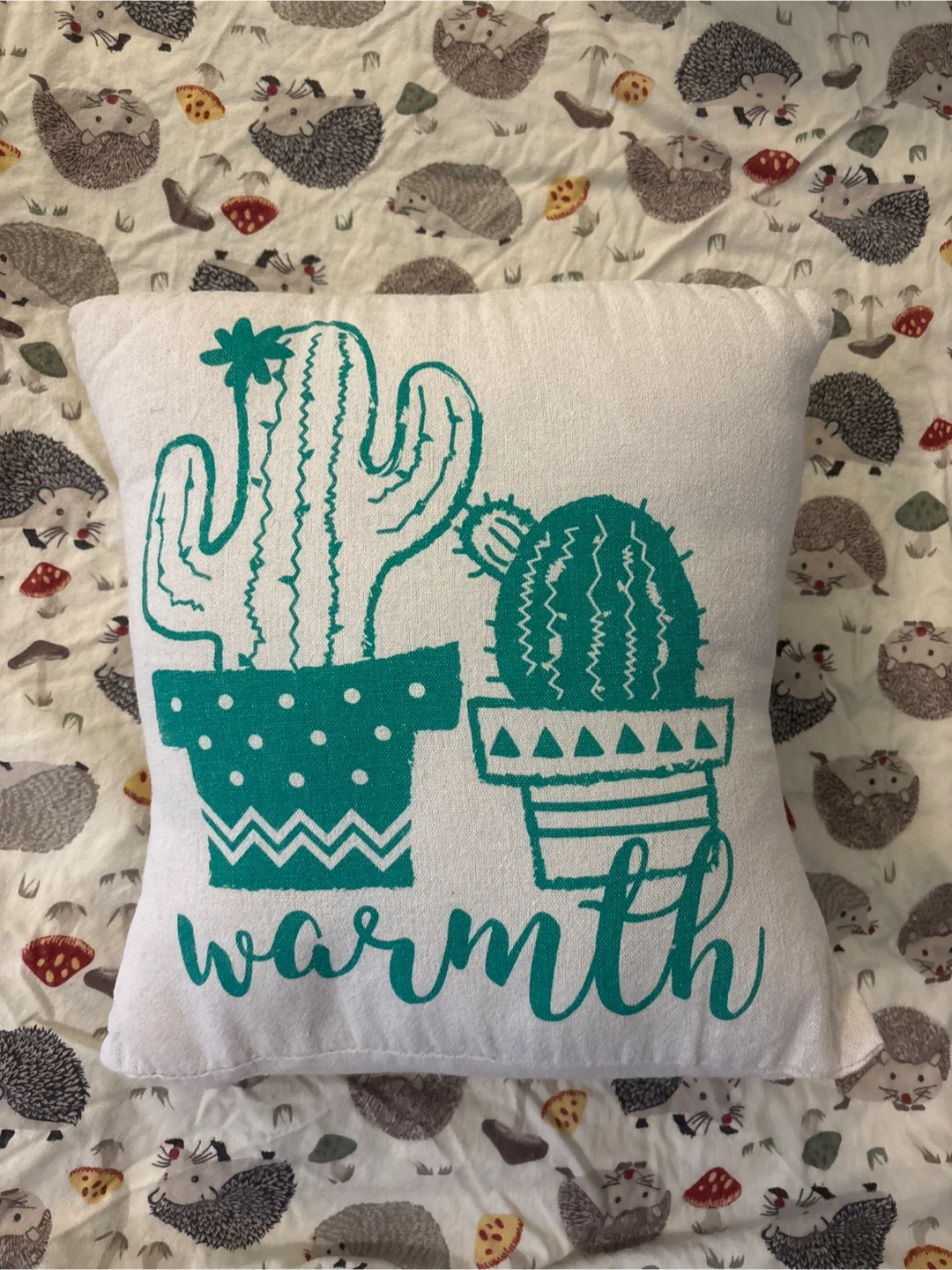 This charming throw pillow features a cute cactus design with the word 'warmth' printed on it. It's a lovely accent for any couch or chair! 35 x 35cm. Material is soft fabric. Barely used, very clean