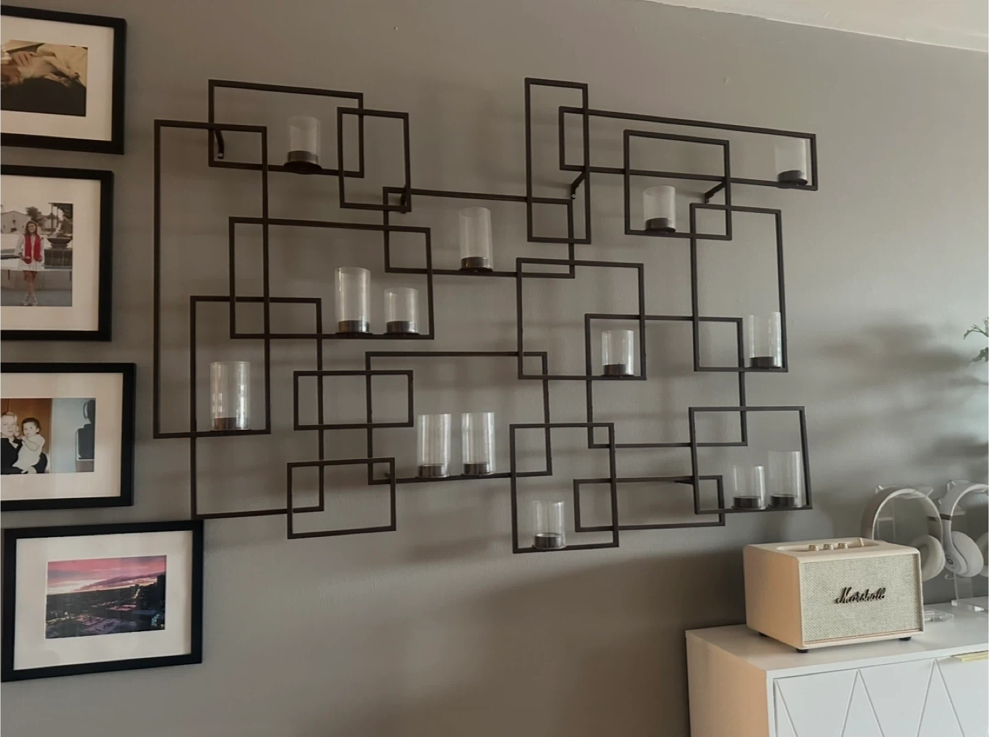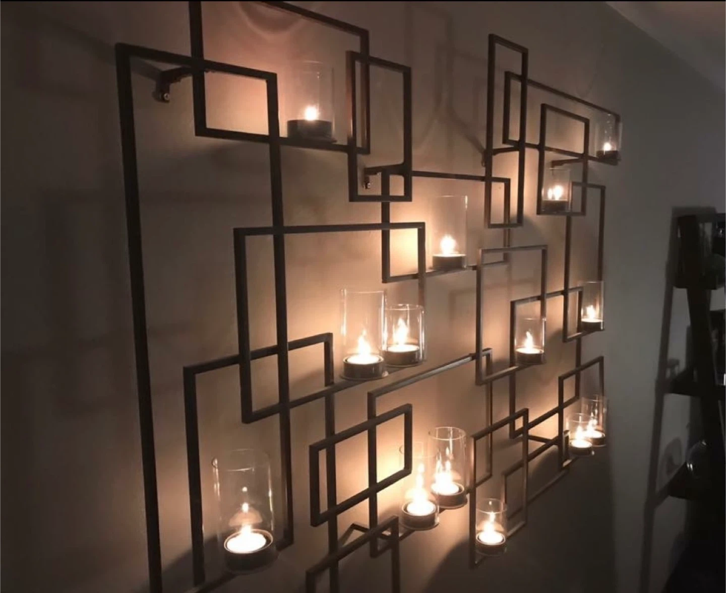 Very large in size. Abstract geometrics form a mural of candlelight. Candleplates hold eight tall and six short glass votives that accommodate metal cupped tea lights. Metal wall art frame in an antiqued bronze. Welded metal frame. Includes glass votives, have extra in case of needing replacement. Accommodates frameless tea lights or metal-cupped wax tea lights, antique bronze finish, indoor or sheltered outdoor use. Width 48.5” depth 3.5” height 33” Original price $698.