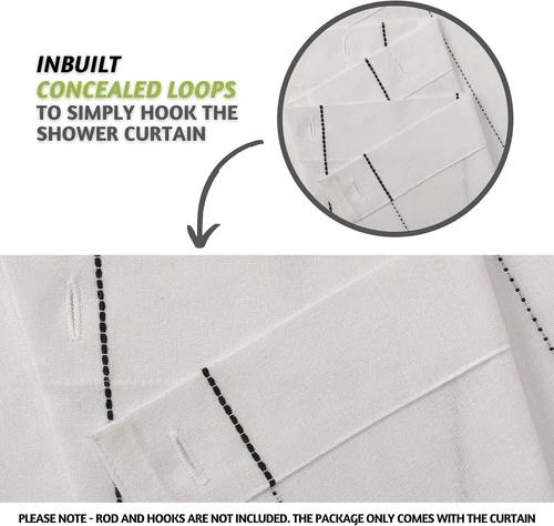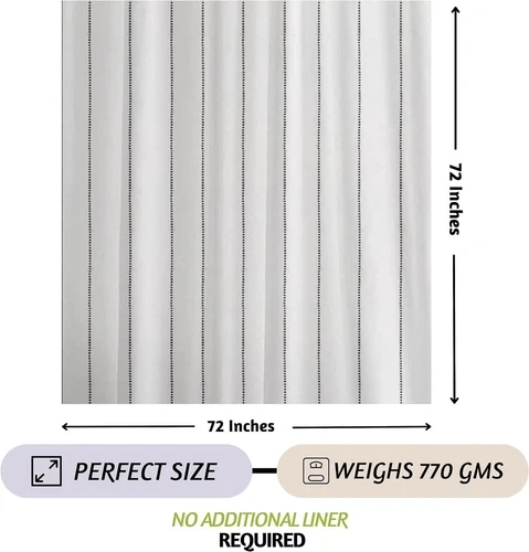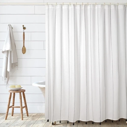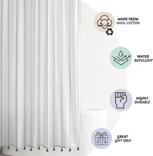 This cotton shower curtain has water repellent technology that actively repels water. It does not require a shower curtain liner. The curtain comes with basic loops that fit standard hooks or rings and is easy to install. The standard size is 72" X 72". It features a stylish design with beautiful tassels. This shower curtain is machine washable. Lay flat to dry. It is long lasting and durable.