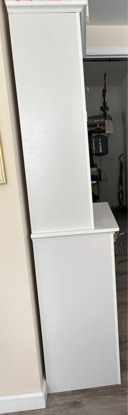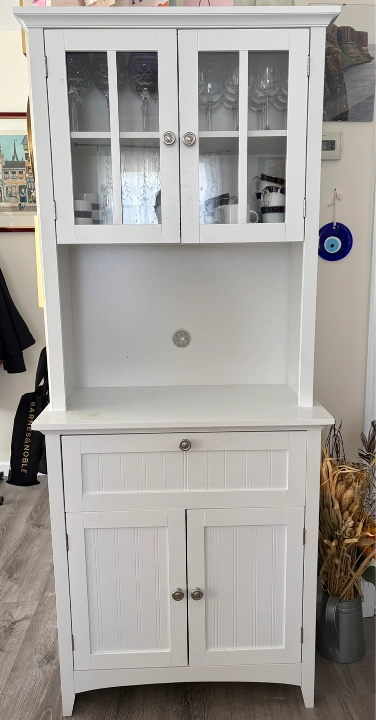 This white kitchen hutch cabinet offers ample storage with glass-fronted cabinets on top and closed cabinets below. It includes a central open shelf with a cable management hole. White beadboard detailing on the doors and drawer adds a classic touch. A single drawer is situated above the double-door lower cabinet.