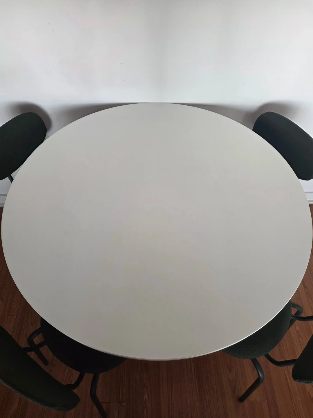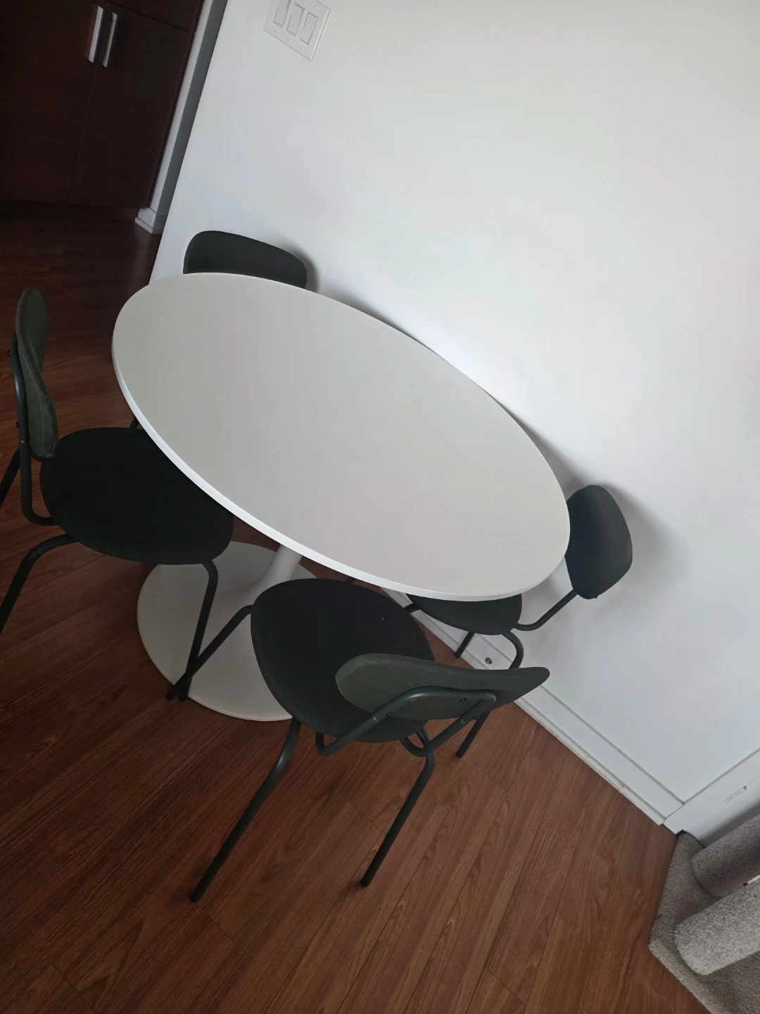 Selling a round dining table with four chairs. The table has a white top and a pedestal base. The chairs are dark green with metal legs. It's a great set for a small dining area or kitchen nook