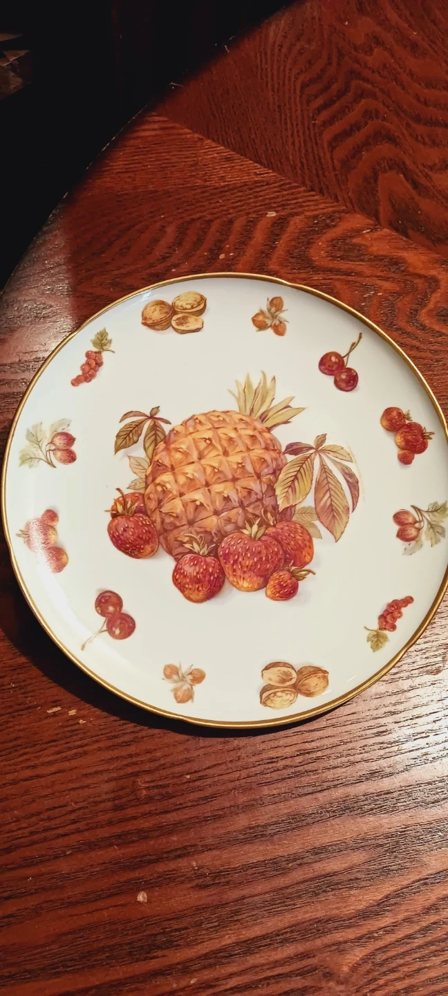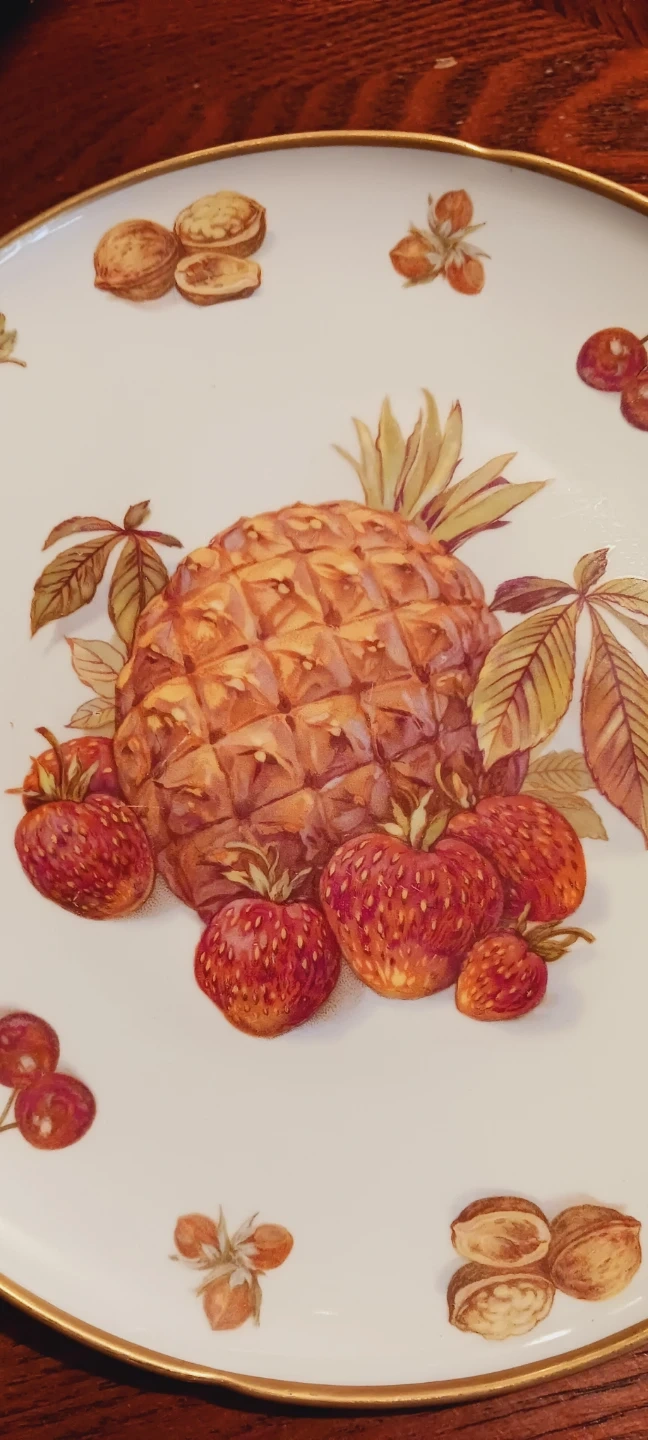 Collectible Royal Hanover, German Fine Porcelain Decorative Plate. This decorative plate features a vibrant fruit design with a pineapple, strawberries, cherries, and nuts. It has a gold trim accent around the edge. Made in Germany by Royal Hanover. Excellent Mint condition. Made in Germany π©πͺ. 8" diameter. ALL MY PRICES ARE NEGOTIABLE !!