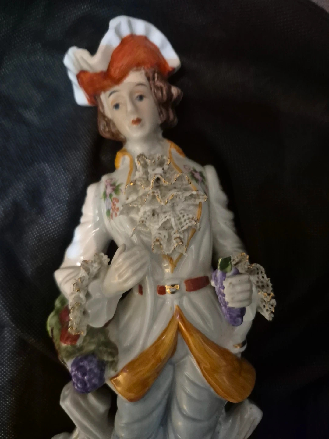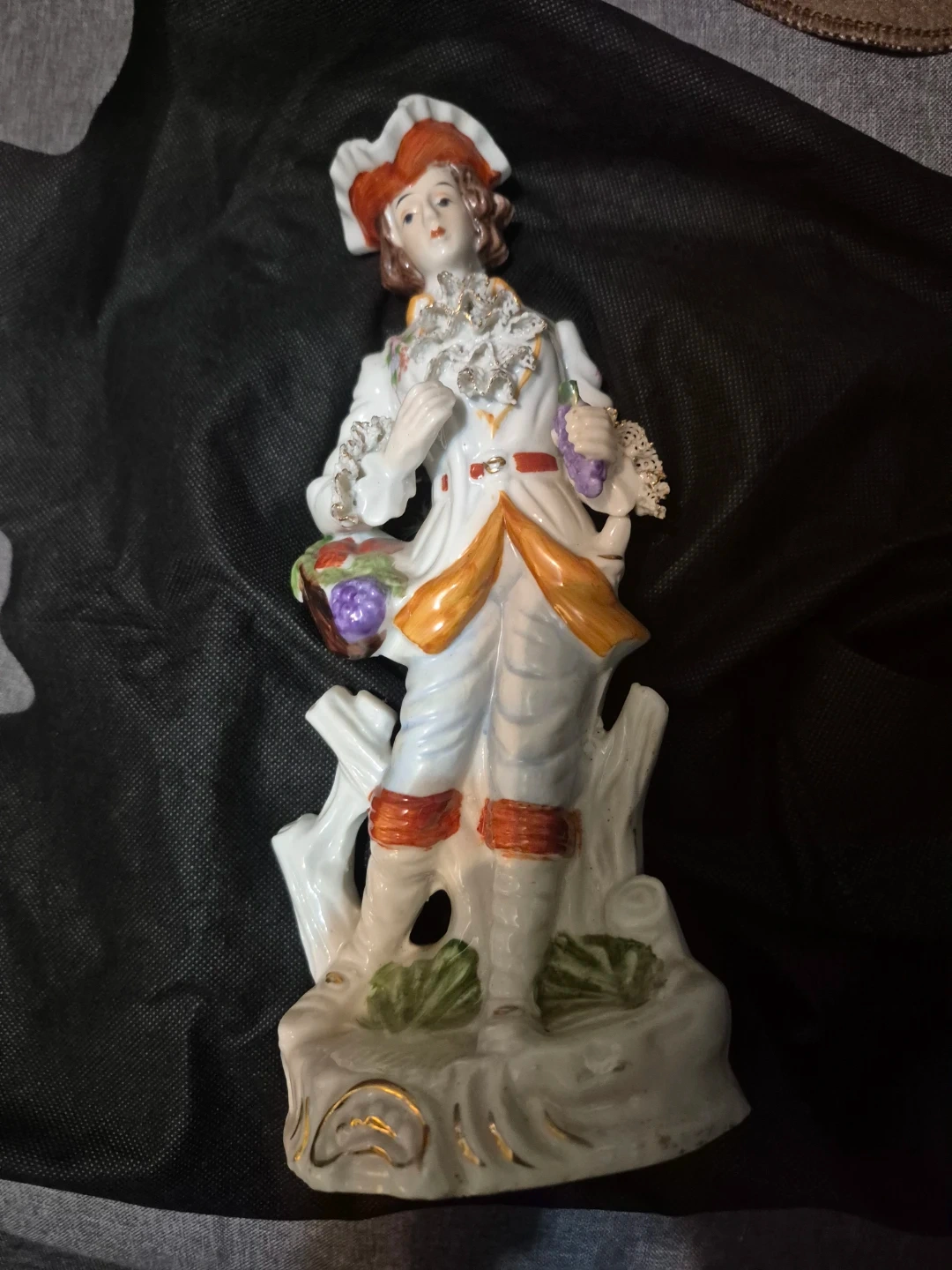 Selling a vintage German porcelain figurine. It depicts a person in period clothing holding a basket of fruit and a bunch of grapes. It would look great on a shelf or mantle!