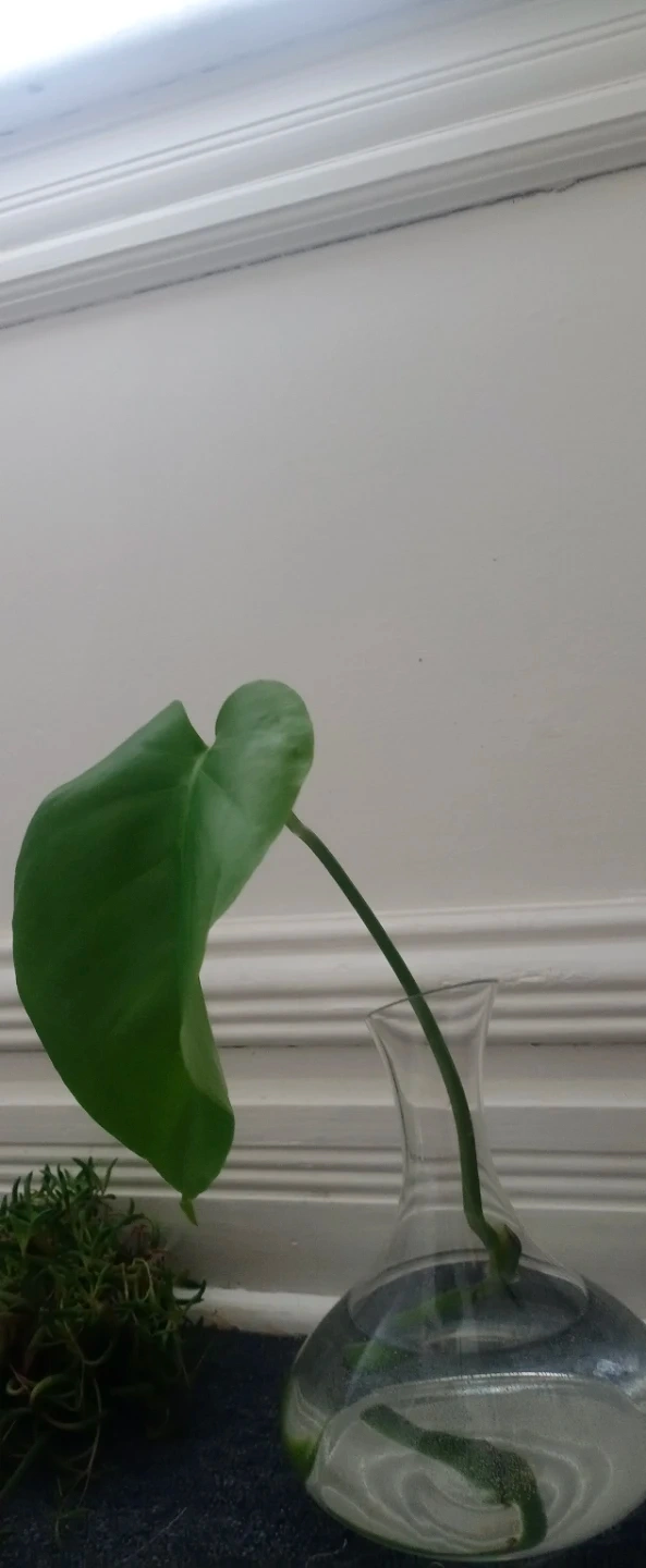 Baby Monstera Deliciosa in a glass vase. It's a healthy green cutting with one large leaf. It's developing roots in clear water. Any offer is welcome.