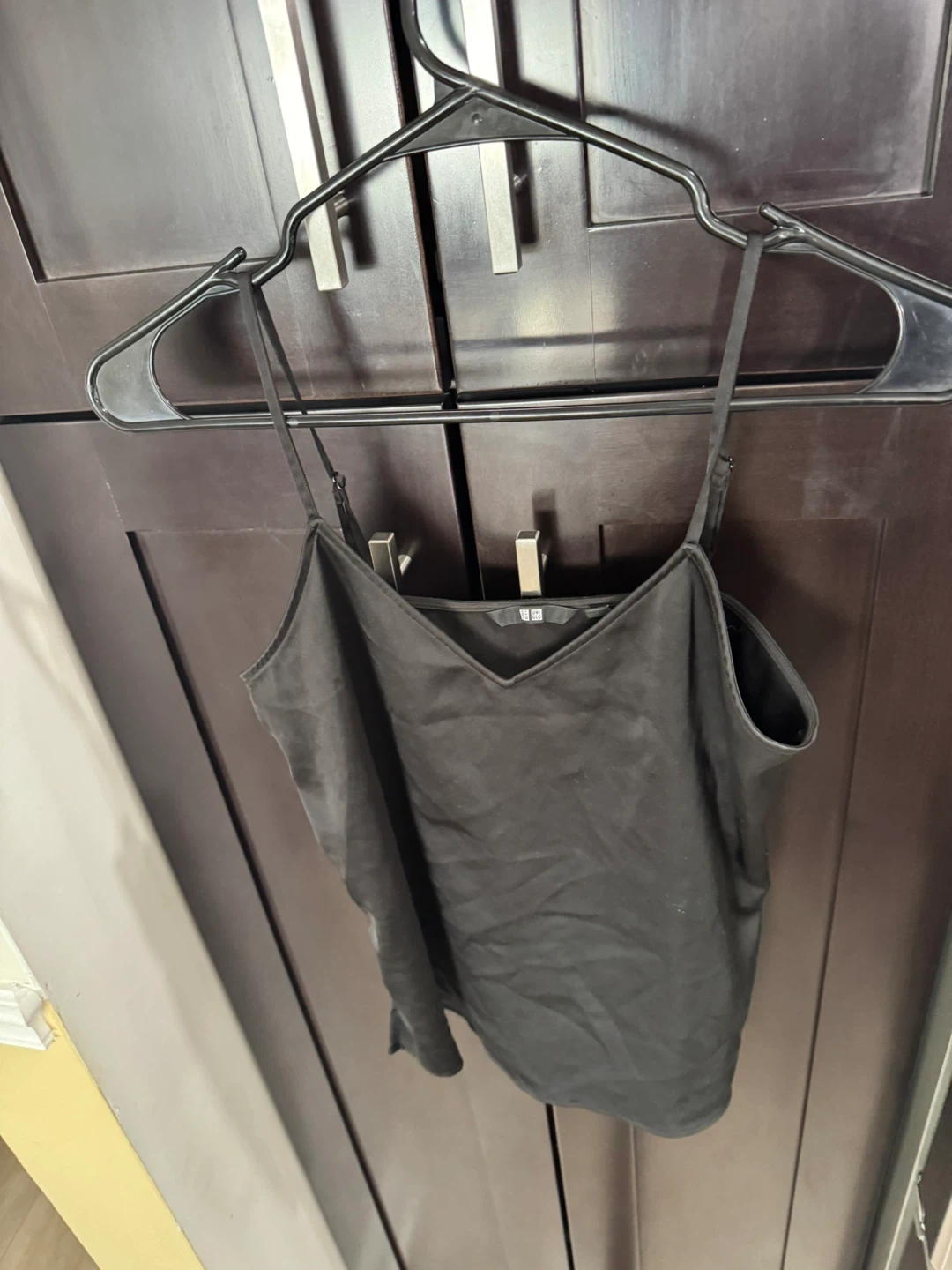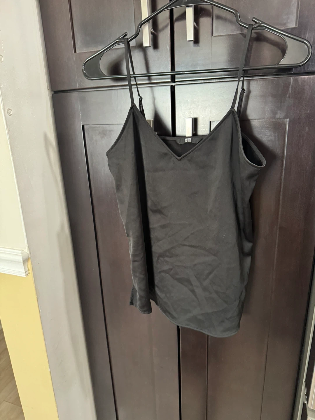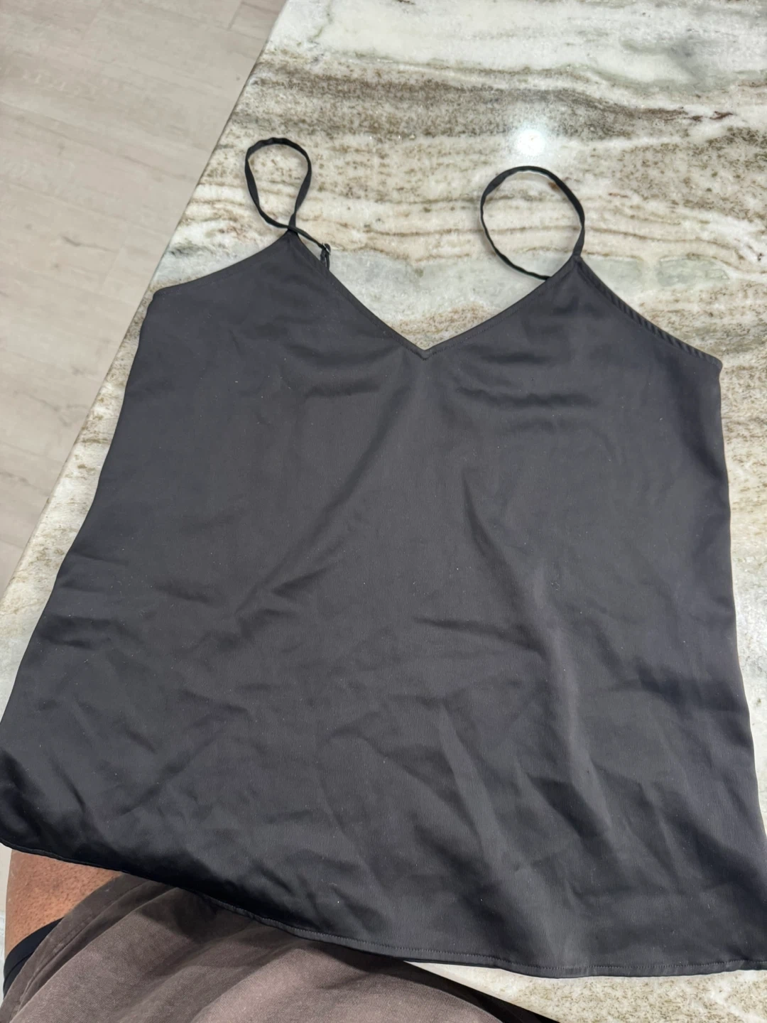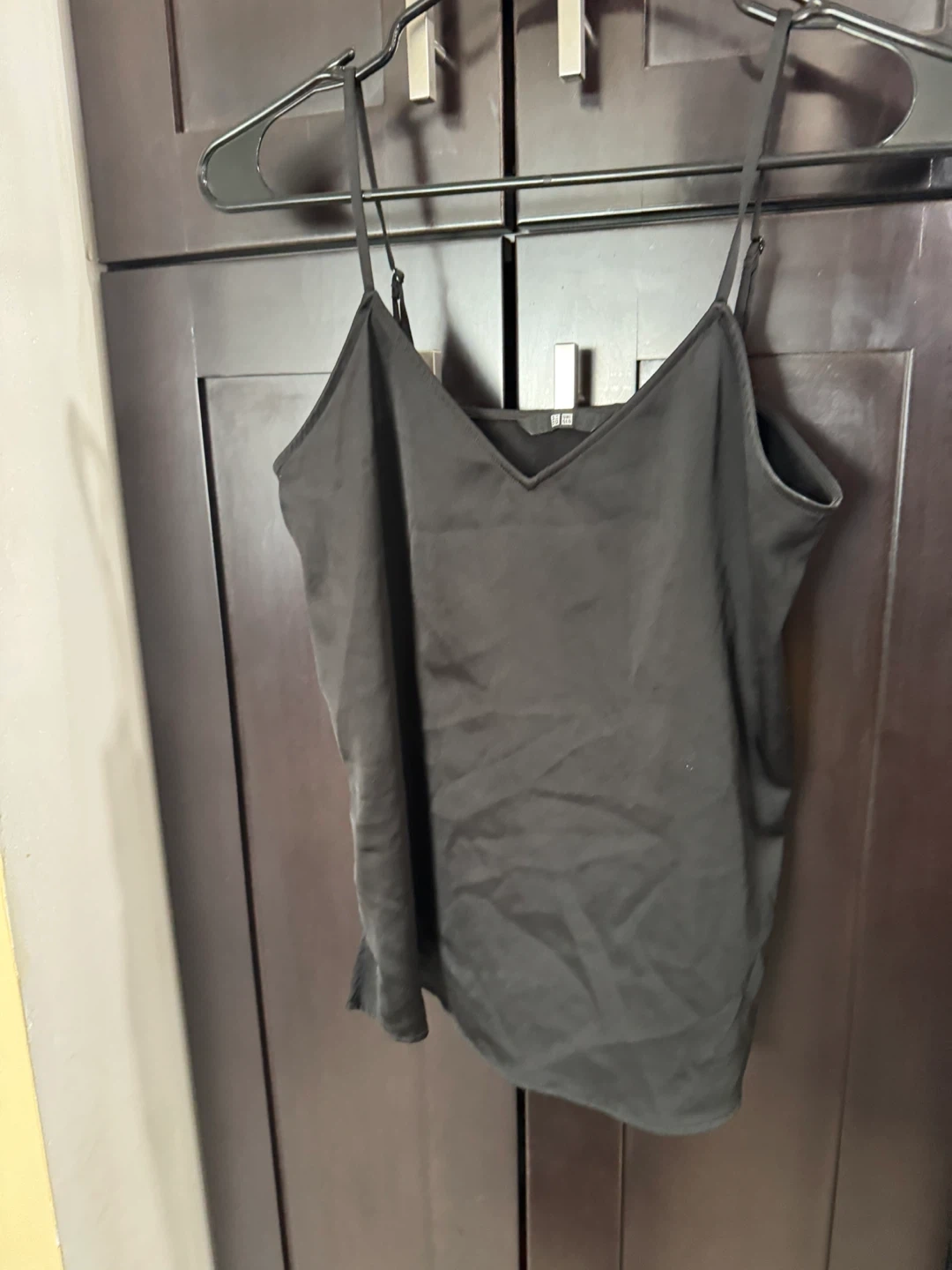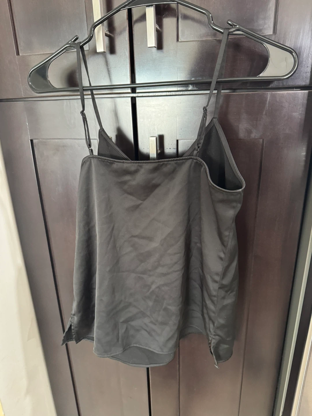 This is a black cami top with spaghetti straps and a V-neckline. It's made of a silky material. It features adjustable straps for a comfortable fit.