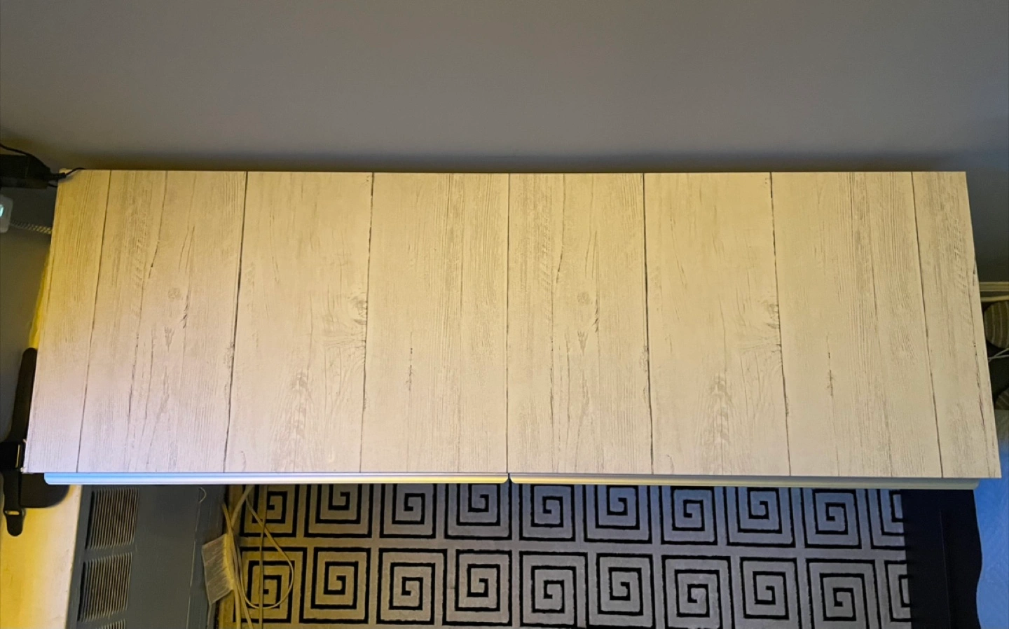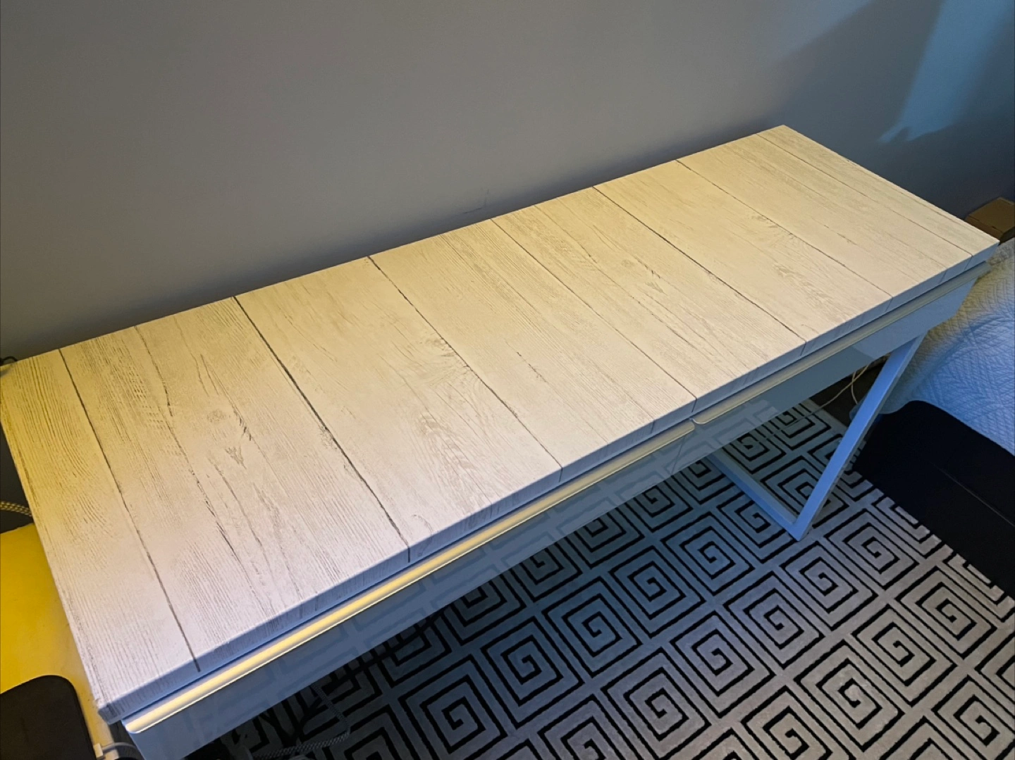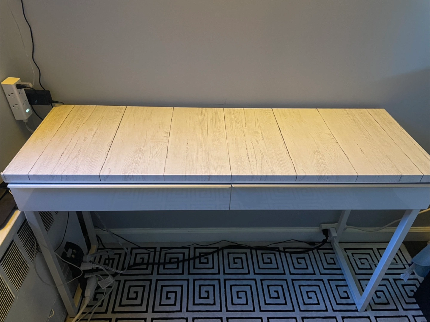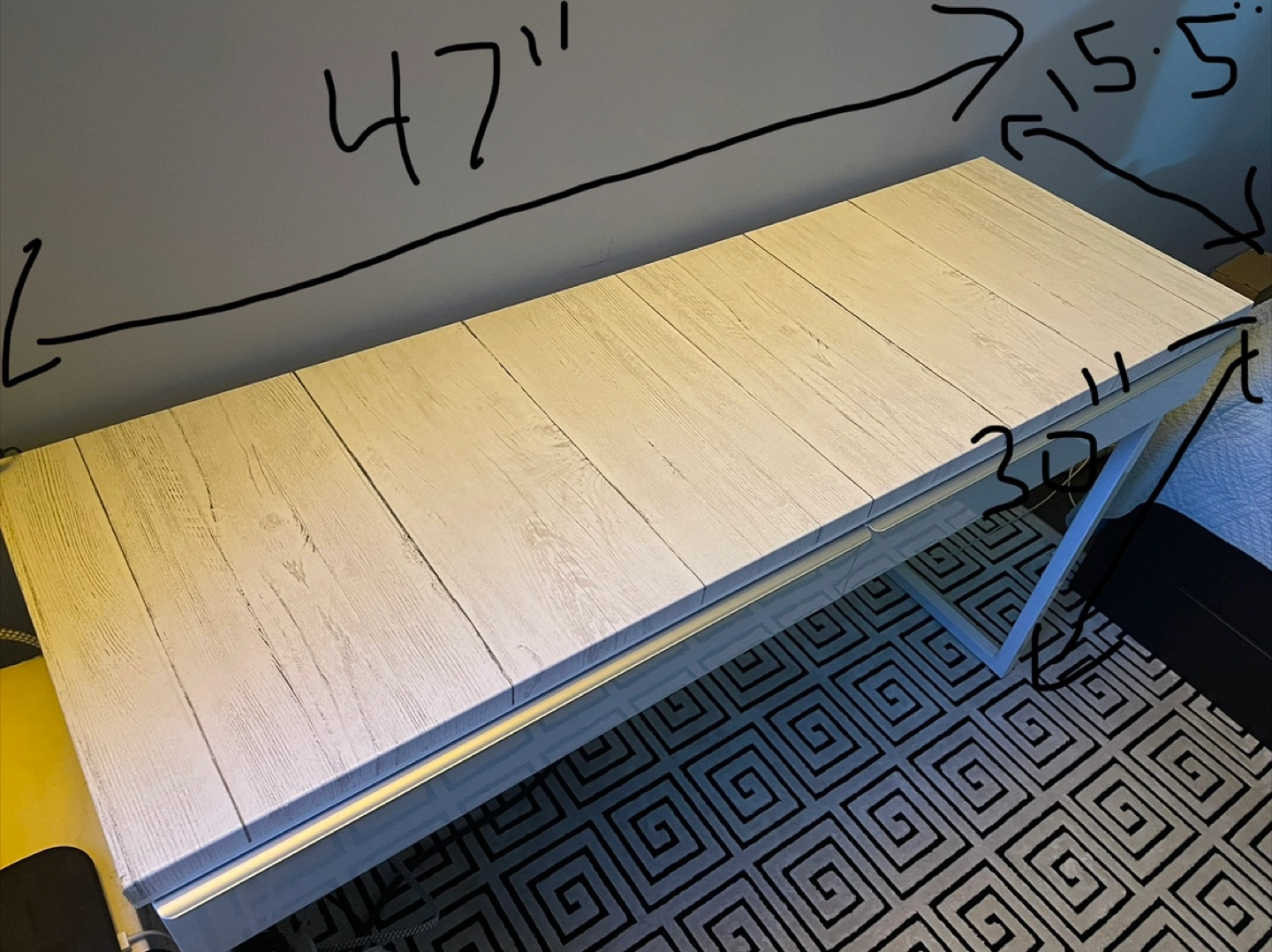 Selling a white ikea desk in good condition. It's a great space-saver! The desk measures 47 inches in length and 15.5 inches in width. Has two drawers