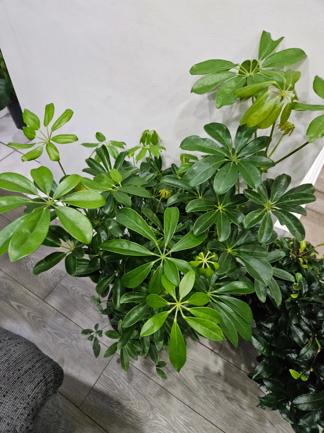 Schefflera plant in a black pot. It's approximately 37 inches tall. This plant adds a nice touch of green to any indoor space.