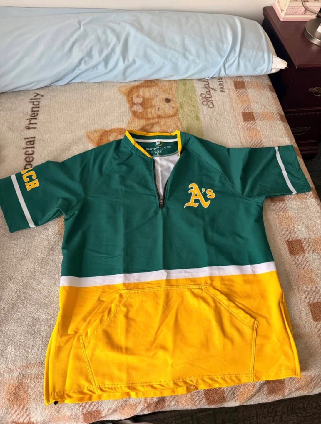 Green and gold pullover jacket with a front pouch pocket. Features the "A's" logo on the chest and "Athletics" on the sleeve. Quarter-zip neckline with a yellow collar. Size L.