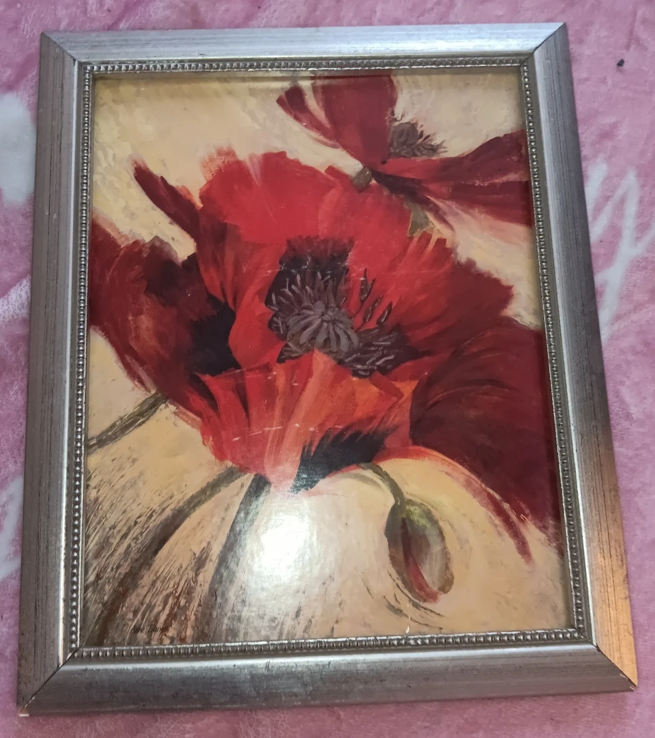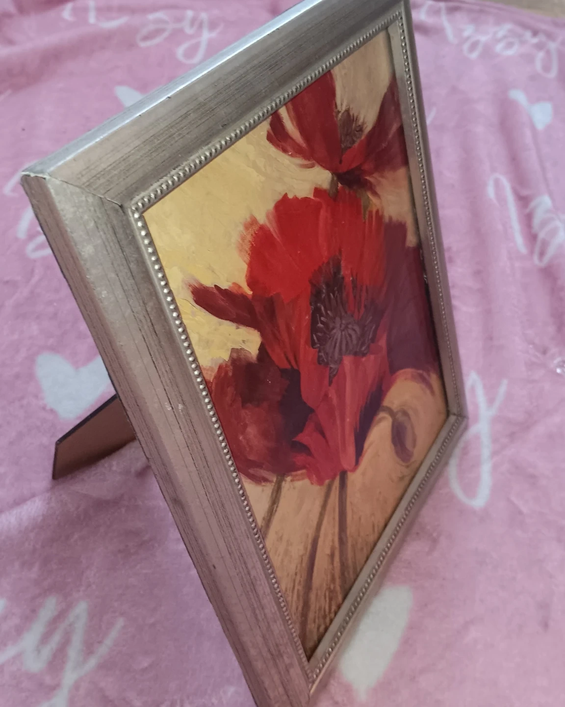 This decorative framed print features vibrant red poppies. It's perfect for adding a splash of color to any room! The frame has a silver finish and a stand for tabletop display. You can replace it with any picture you want. Cash only.