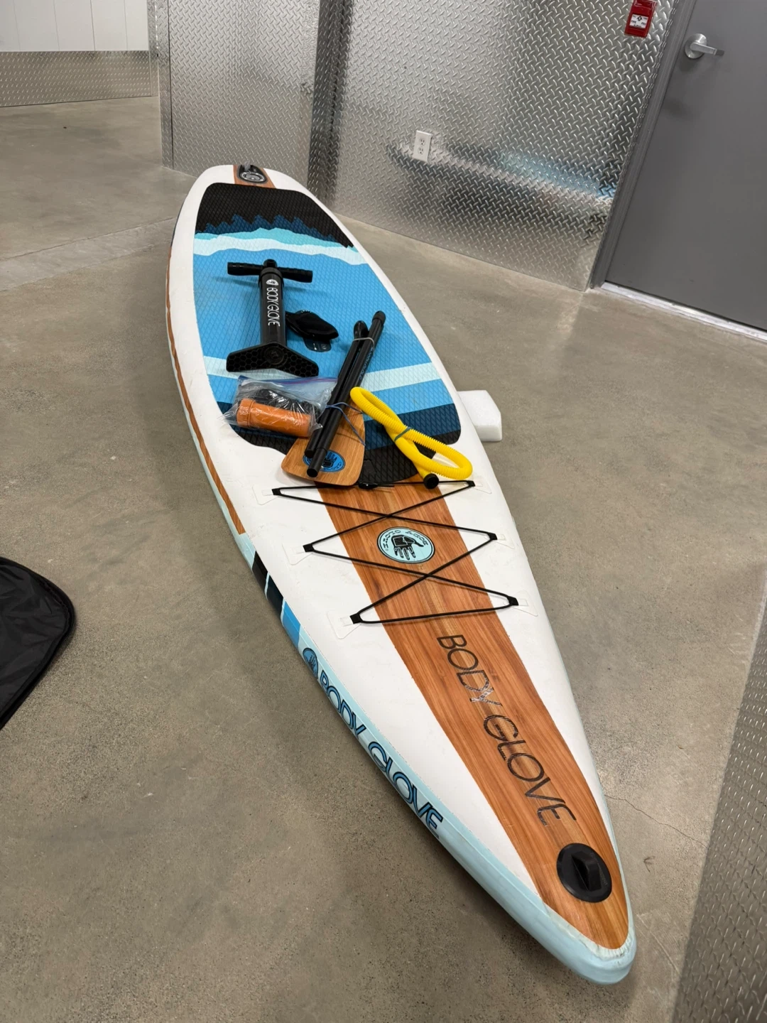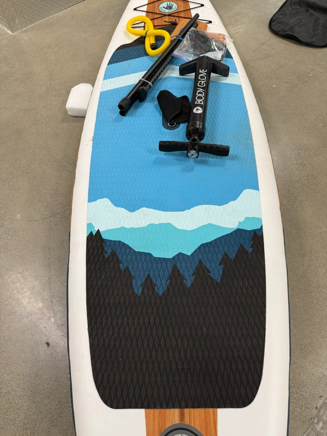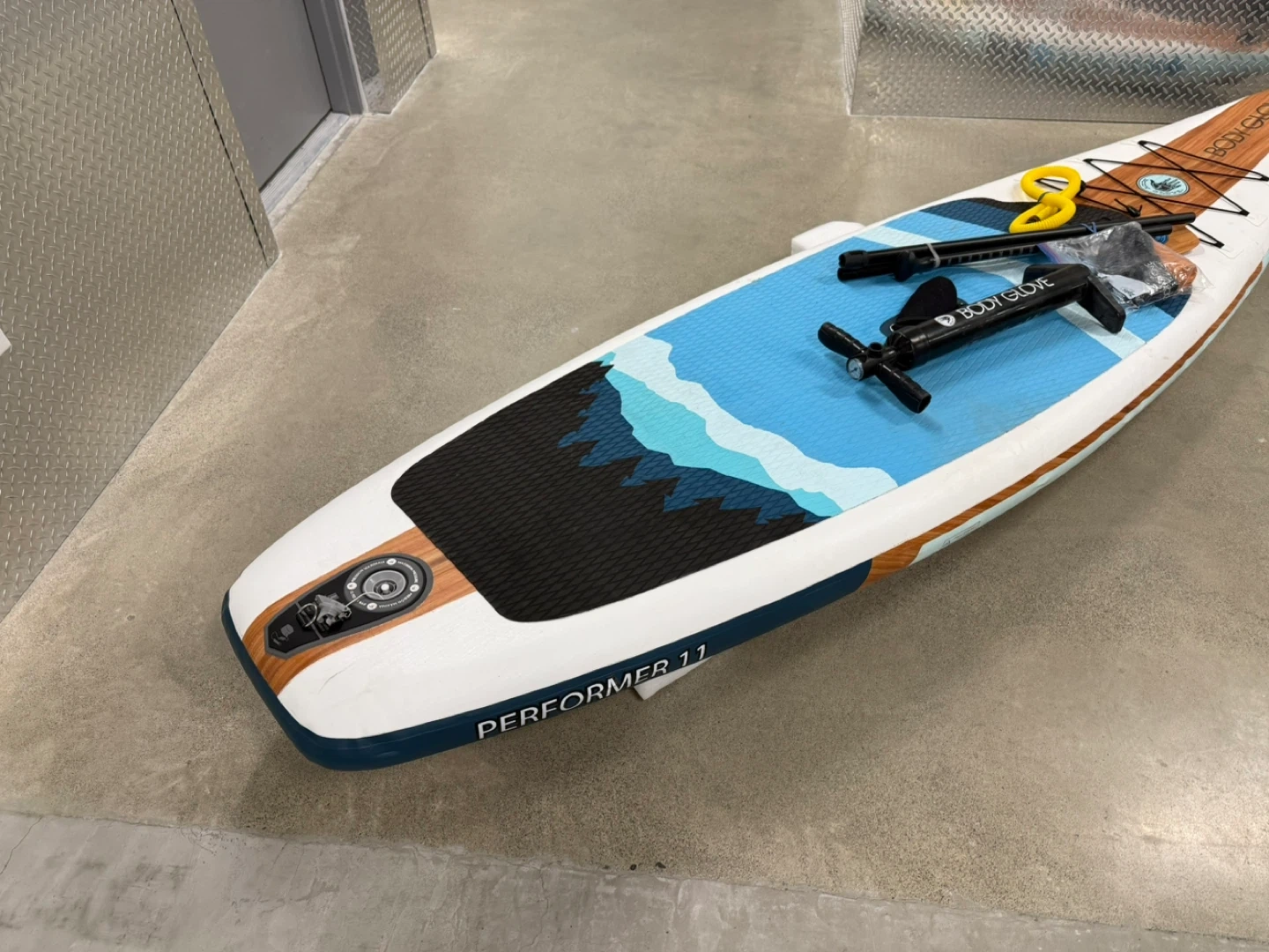 Body Glove Performer 11 stand up paddleboard. It's a full package including a paddle, pump, and repair kit. The board is inflatable and comes with a bright, wave-inspired design.