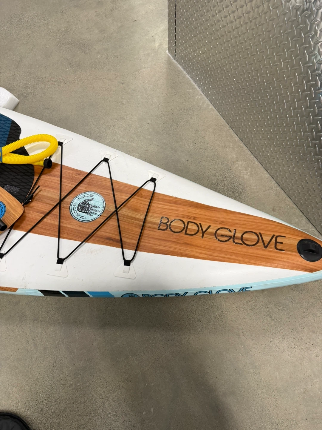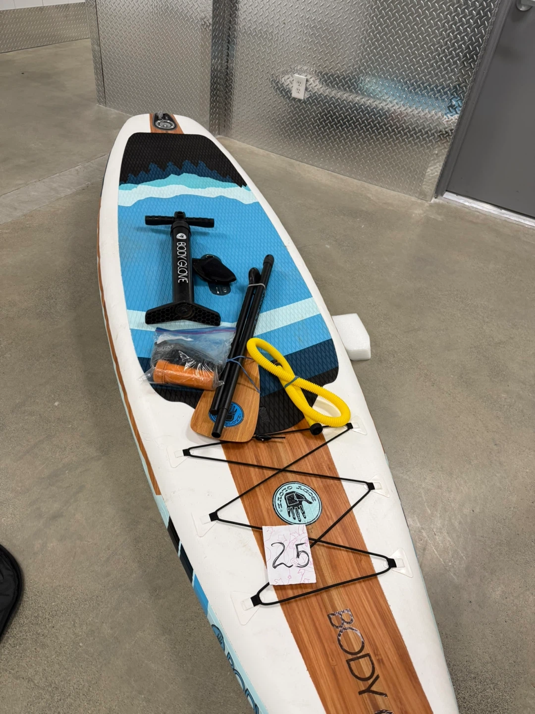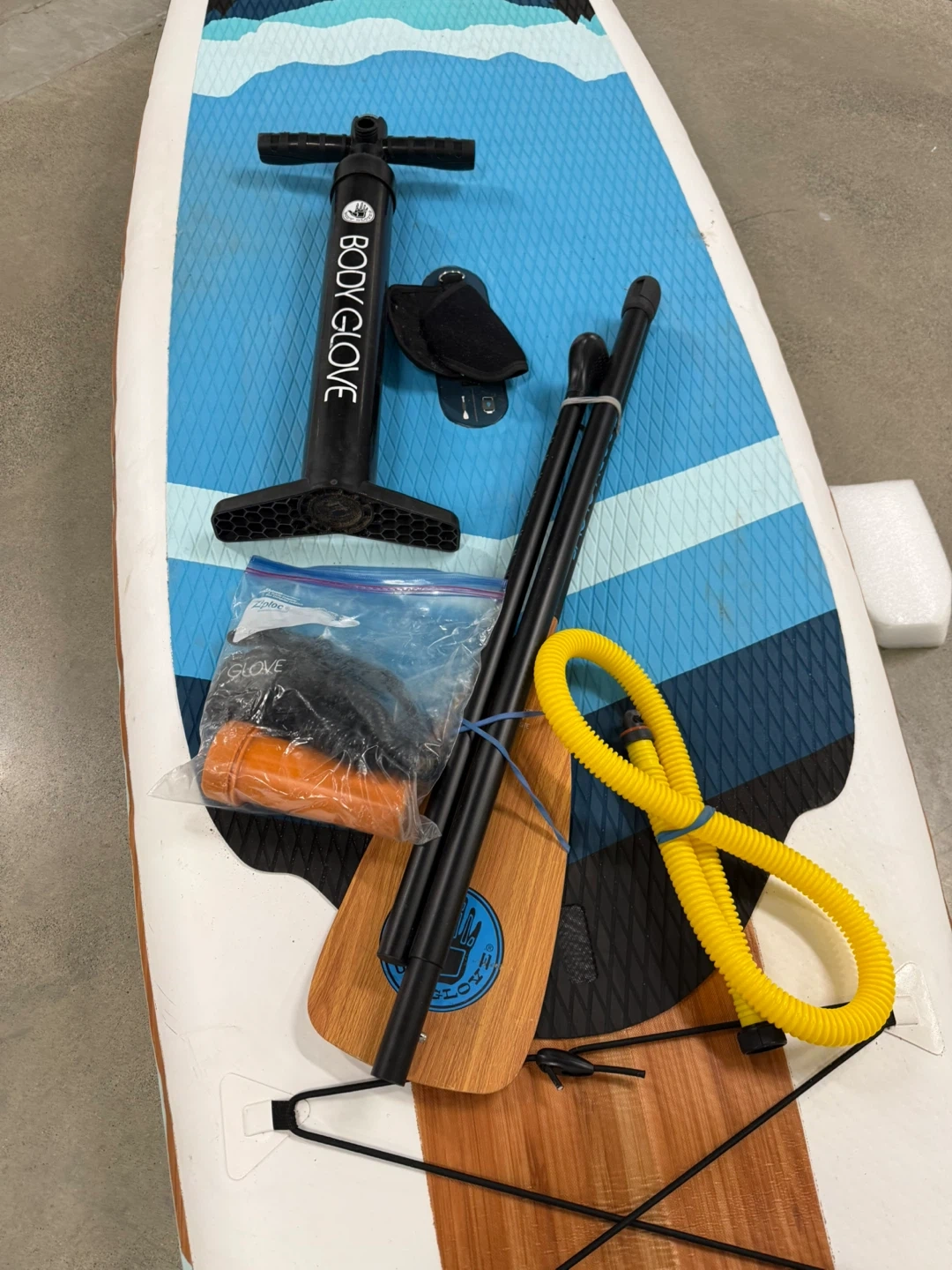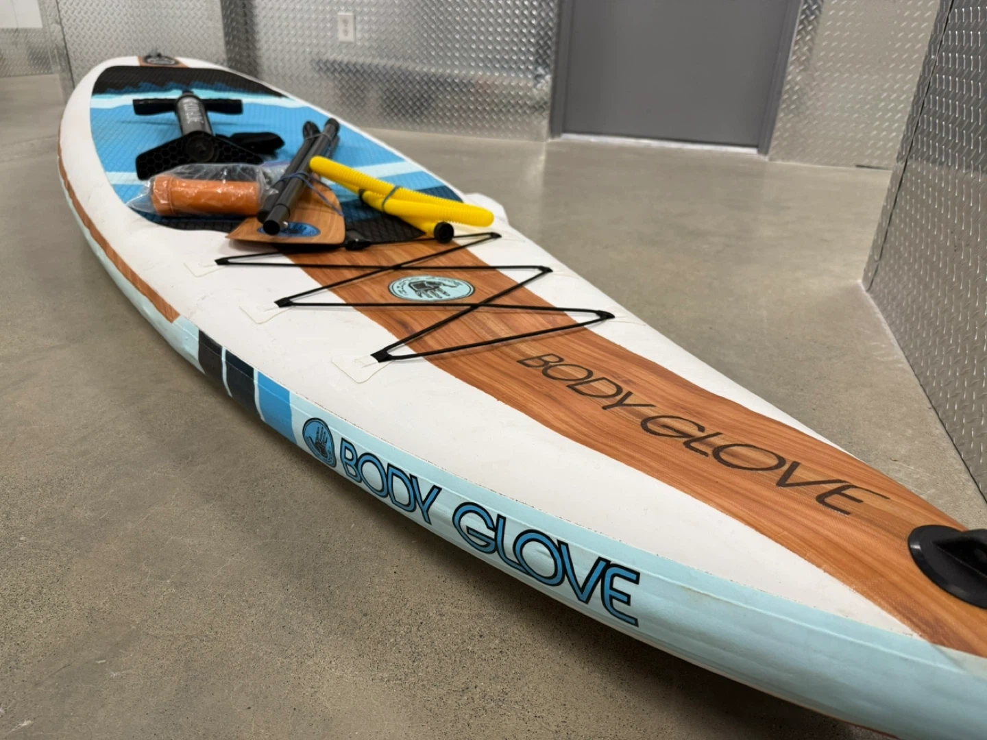 Body Glove Performer 11 stand up paddleboard. It's a full package including a paddle, pump, and repair kit. The board is inflatable and comes with a bright, wave-inspired design.