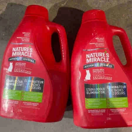 Selling two bottles of Nature's Miracle Advanced Stain and Odour Eliminator, each 3.78L. This is perfect for tackling tough pet messes. The enzymatic formula targets pet stains and odours, and the advanced cleaning penetrates deep to remove embedded messes. It's safe for use on carpets, upholstery, and other surfaces. Both bottles are sealed and brand new. Cash or cashless payment accepted.