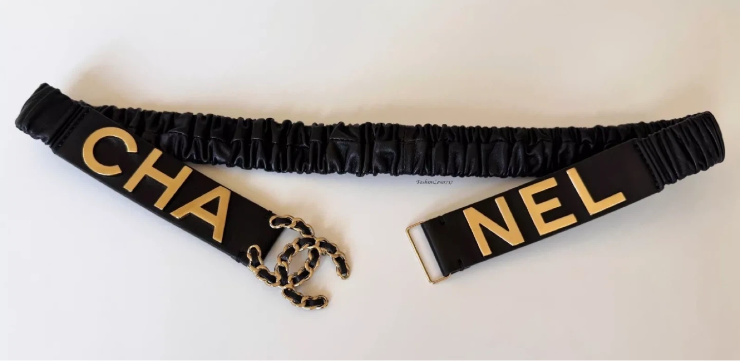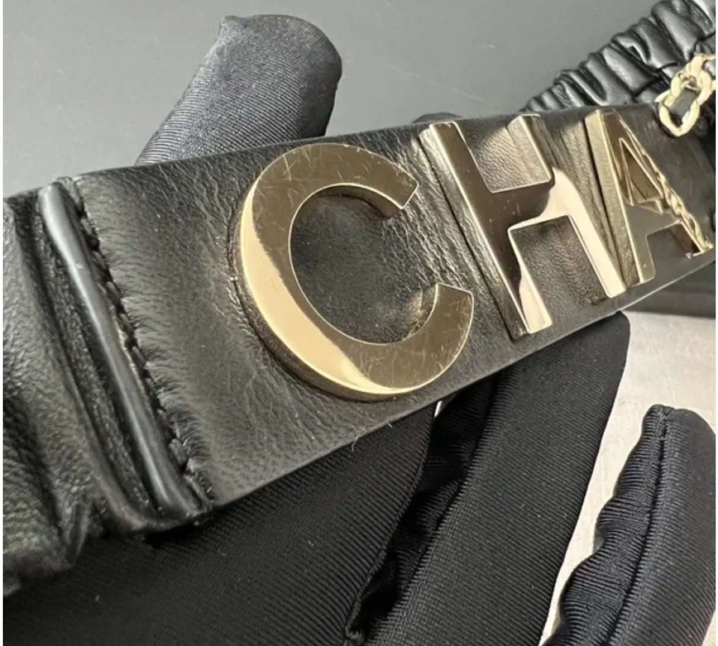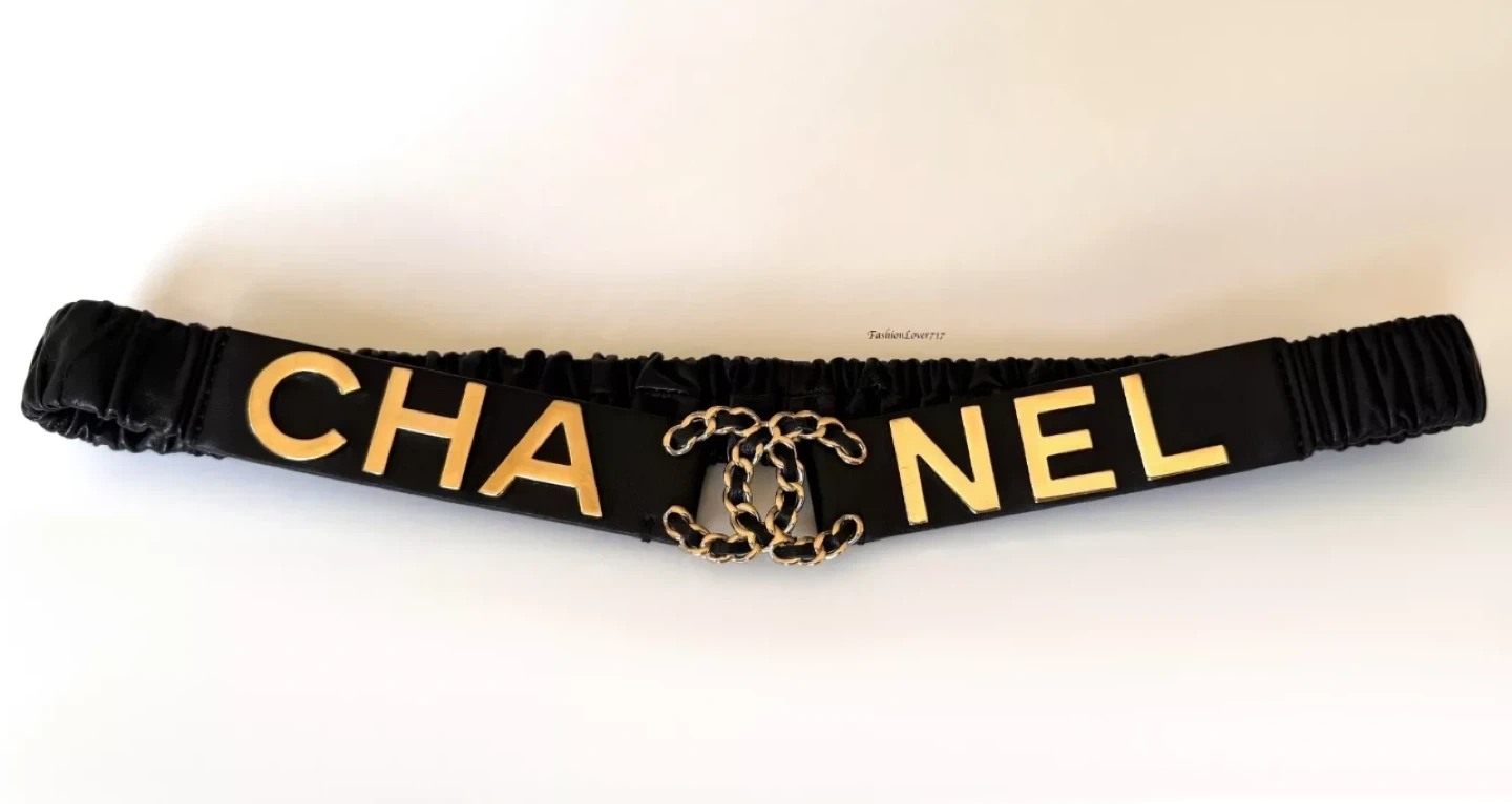 This is a Chanel elastic belt made from black leather with gold-tone lettering and a logo detail. It's designed to cinch the waist and add a statement to any outfit
