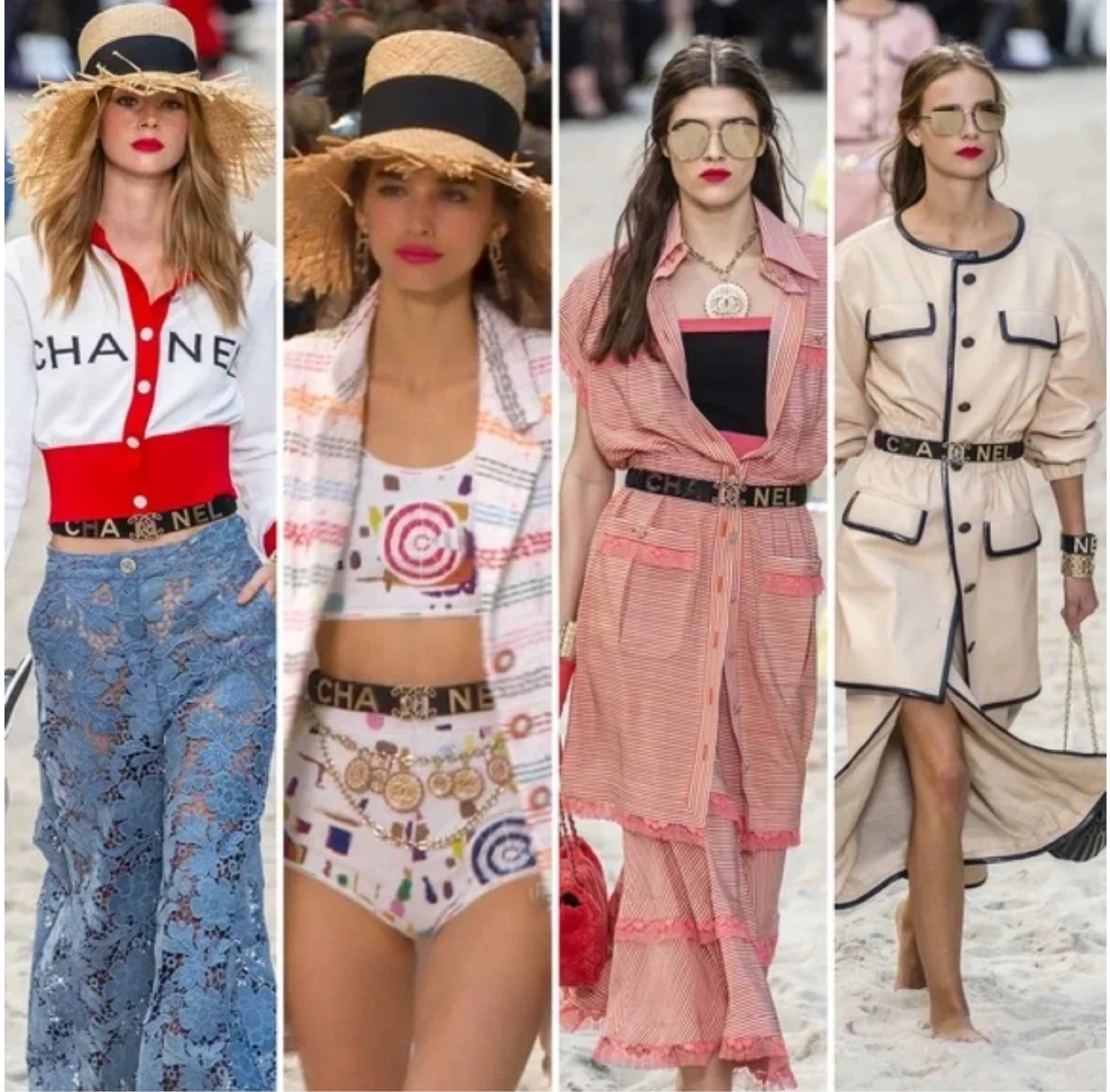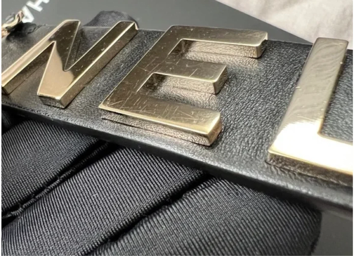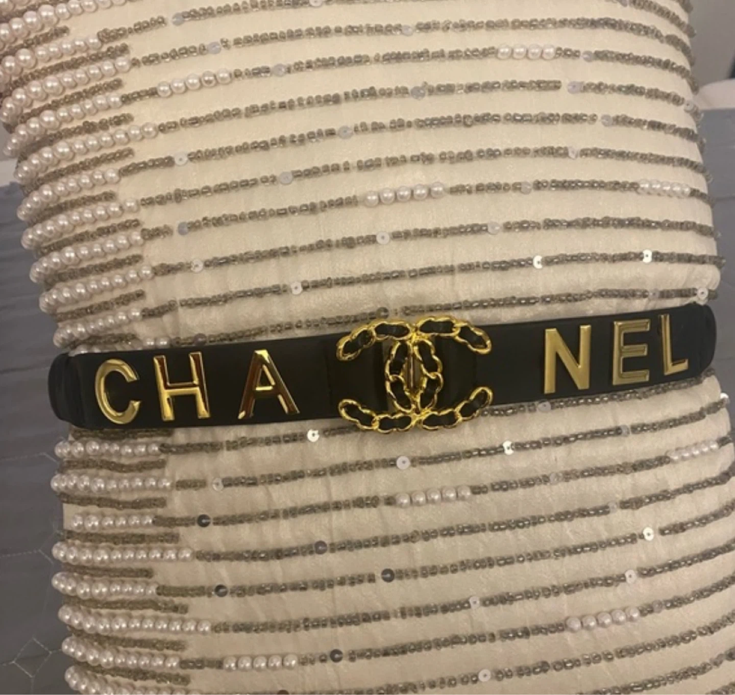 This is a Chanel elastic belt made from black leather with gold-tone lettering and a logo detail. It's designed to cinch the waist and add a statement to any outfit