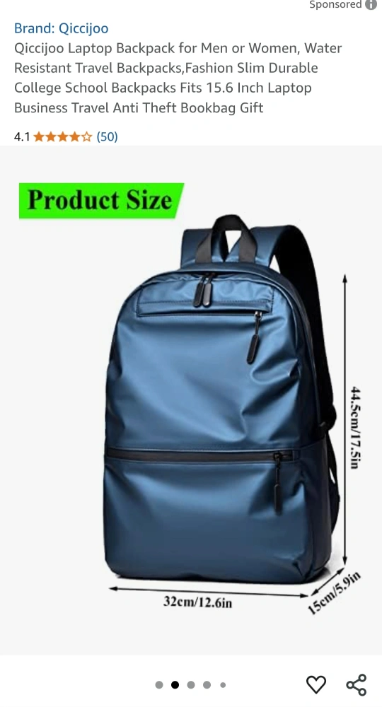 Looking to sell a Qiccijoo laptop backpack in a stylish blue colour. It's perfect for both men and women. This water-resistant travel backpack is designed to be slim and durable, making it ideal for college, school, or business travel. It fits a 15.6-inch laptop and includes anti-theft features for added security. The dimensions are approximately 44.5cm x 32cm x 15cm.